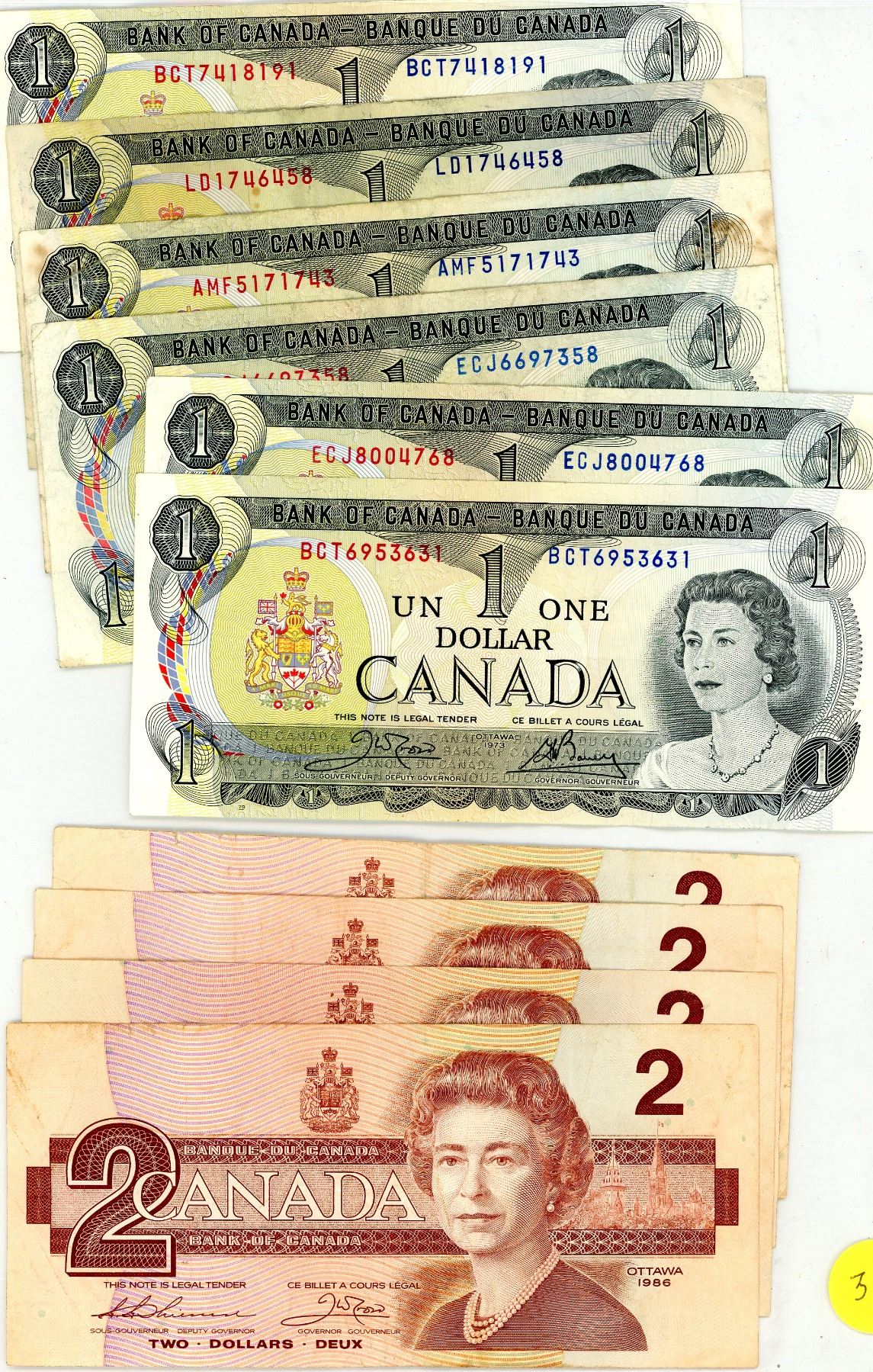 Six 1973 One Dollar and Four Two Dollar Canadian Notes