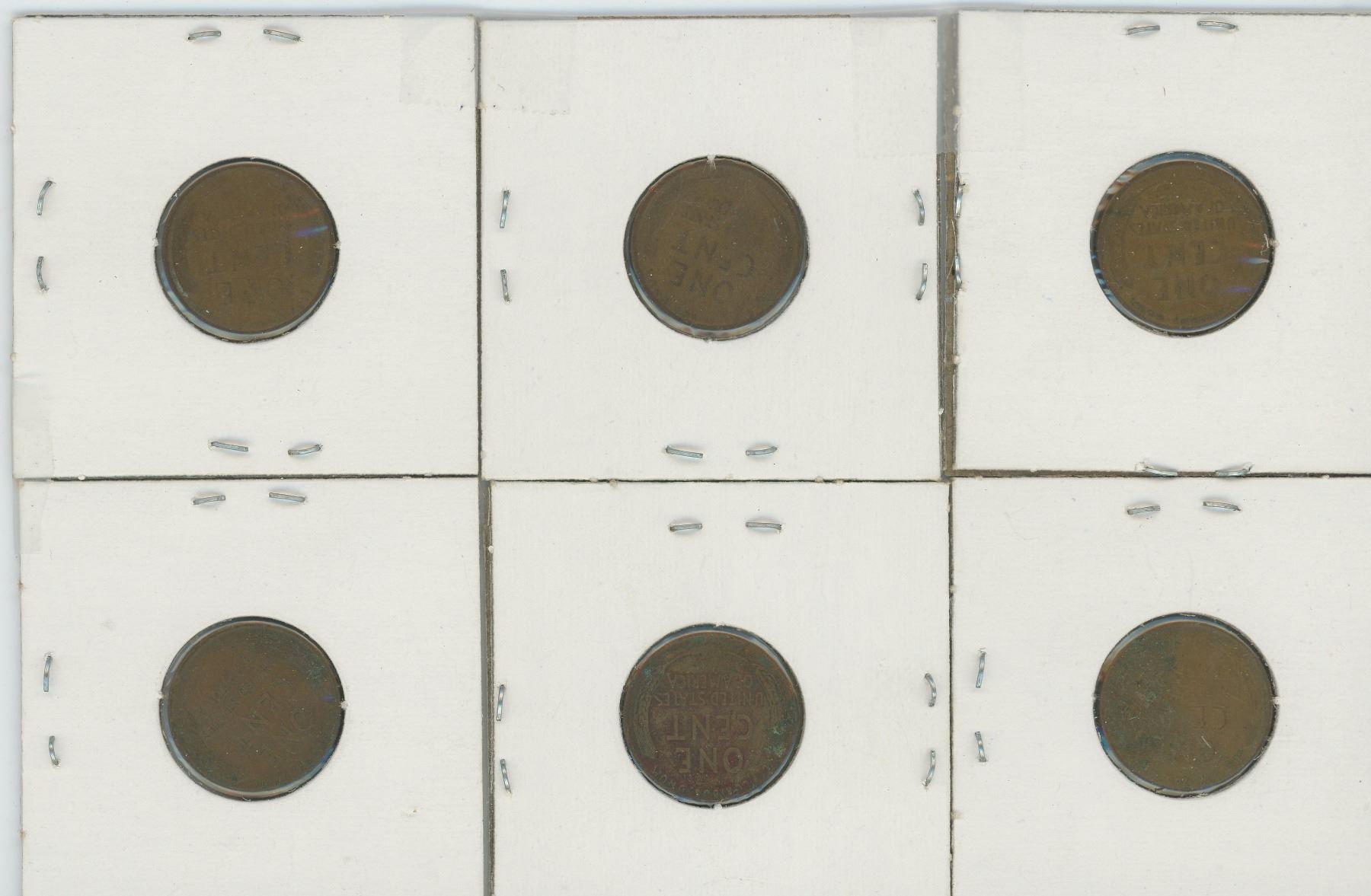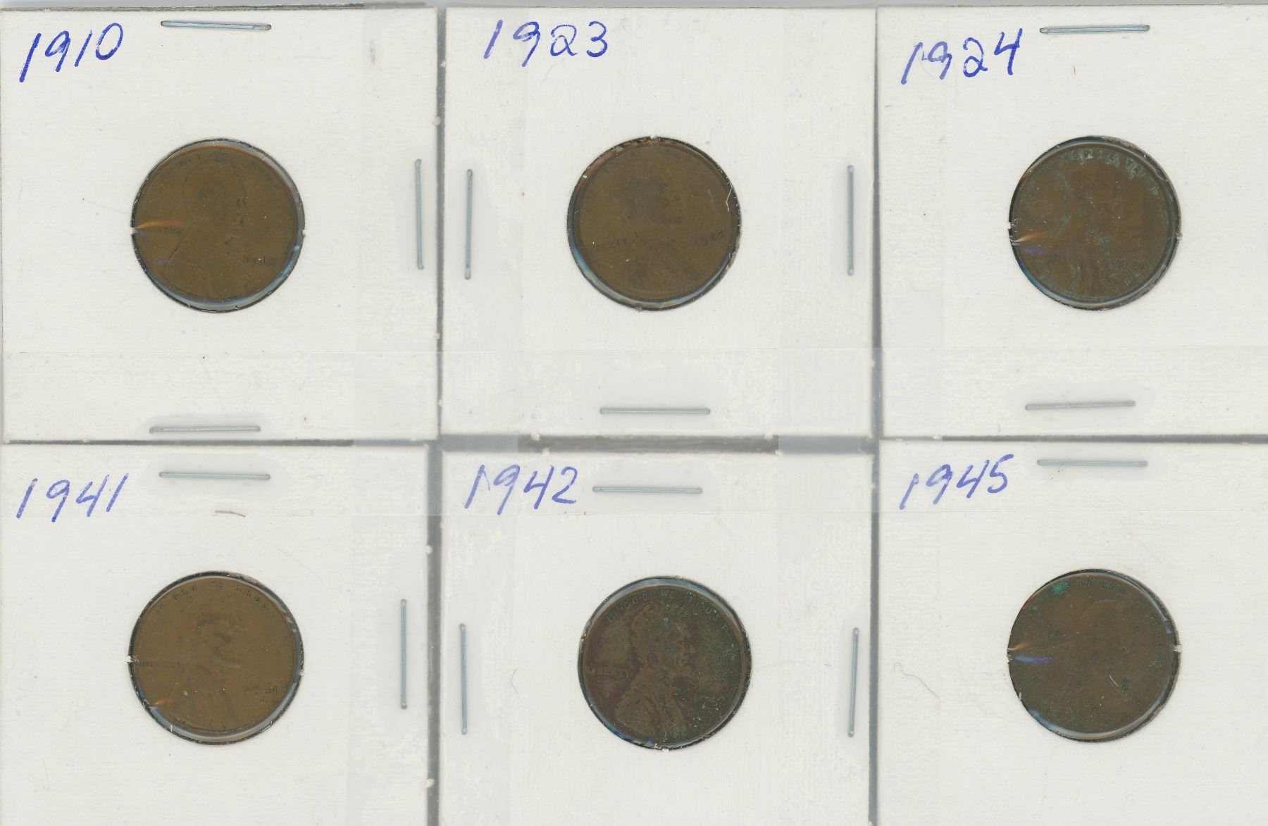Six Old US Pennies (1910, 1923, 1924, 1941, 1942, 1945)