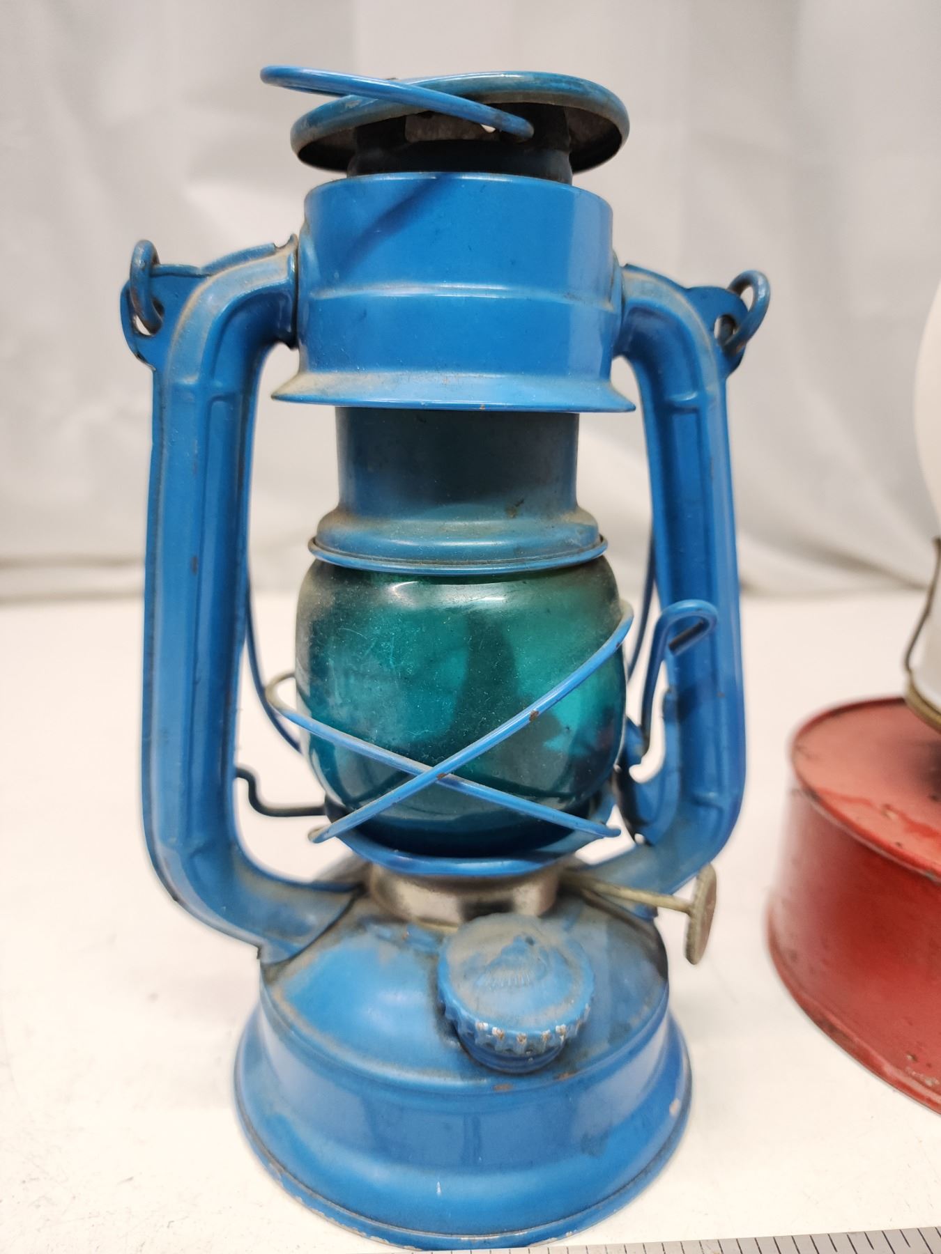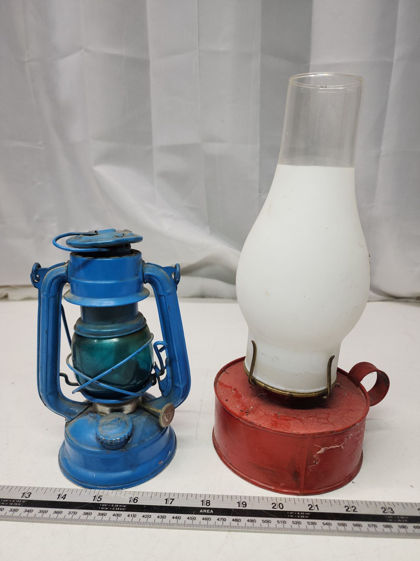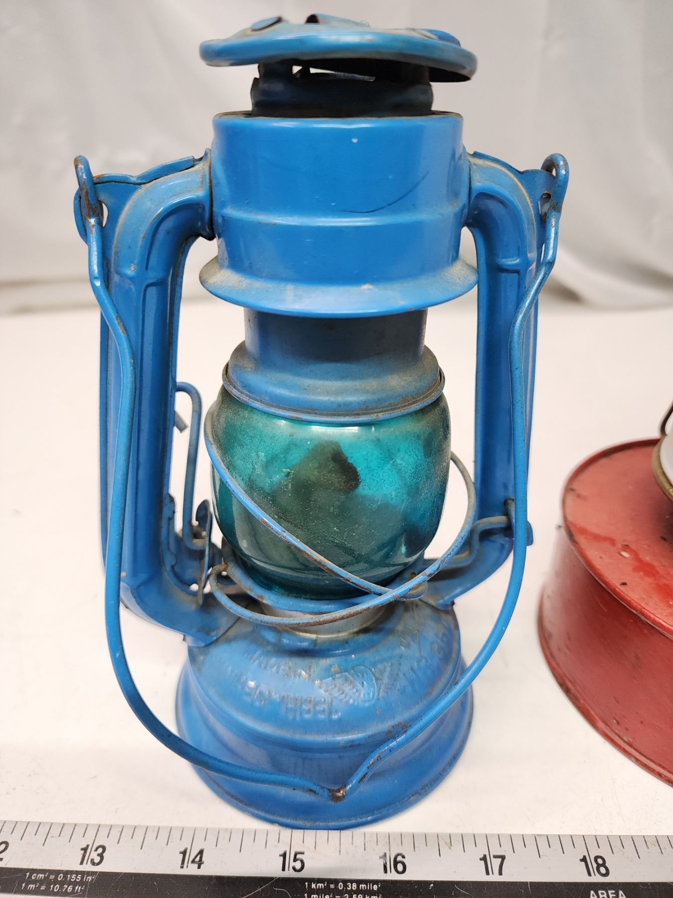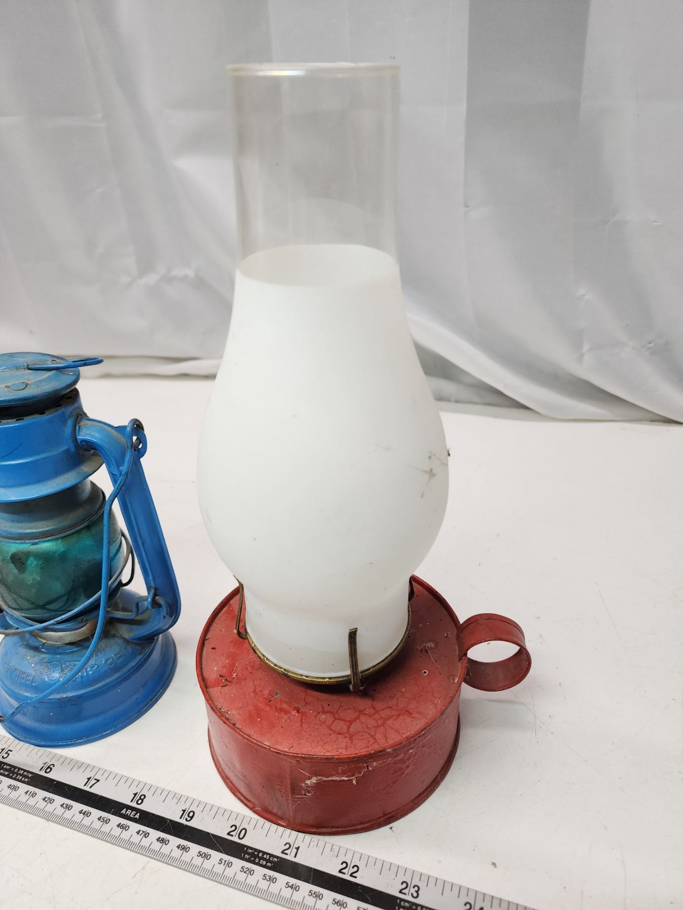 Small blue lantern, w/ blue glass globe & tin oil lamp, w/ chimney