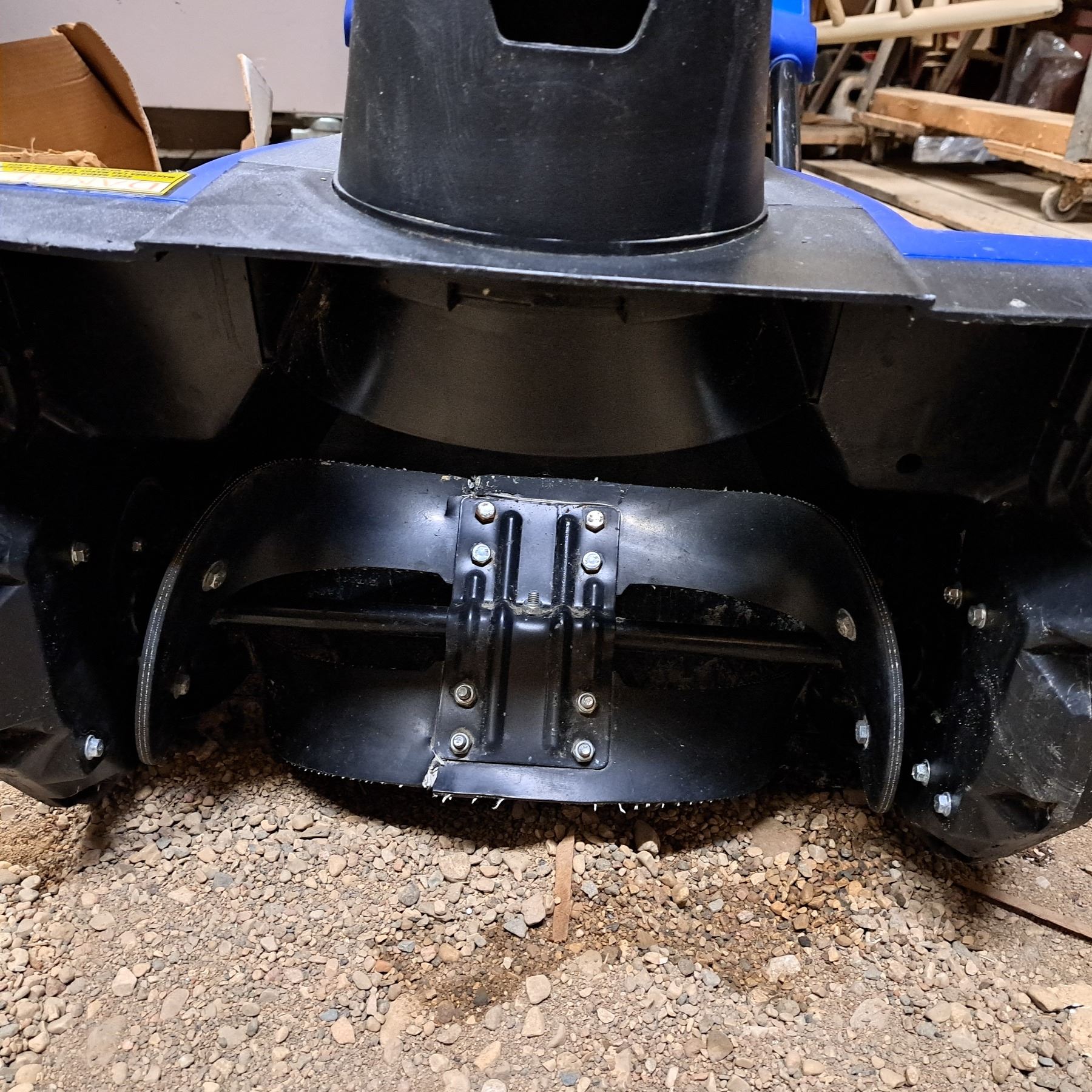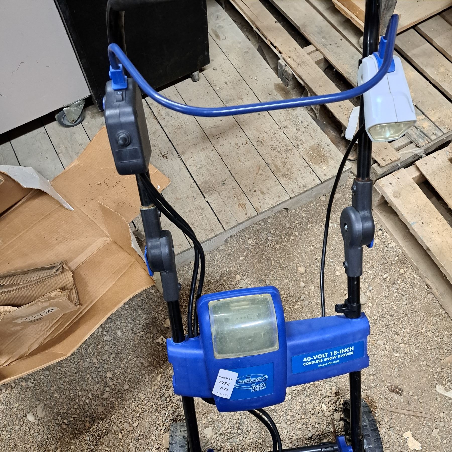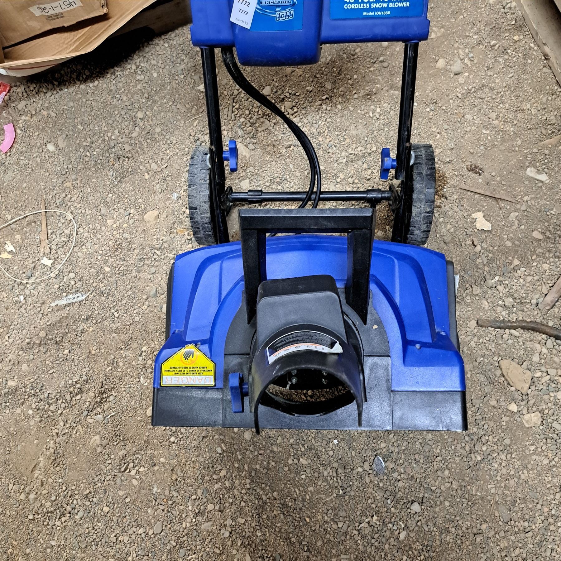 Small blue snow blower with battery charger