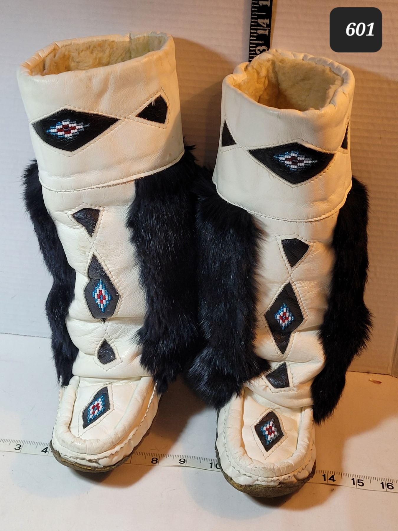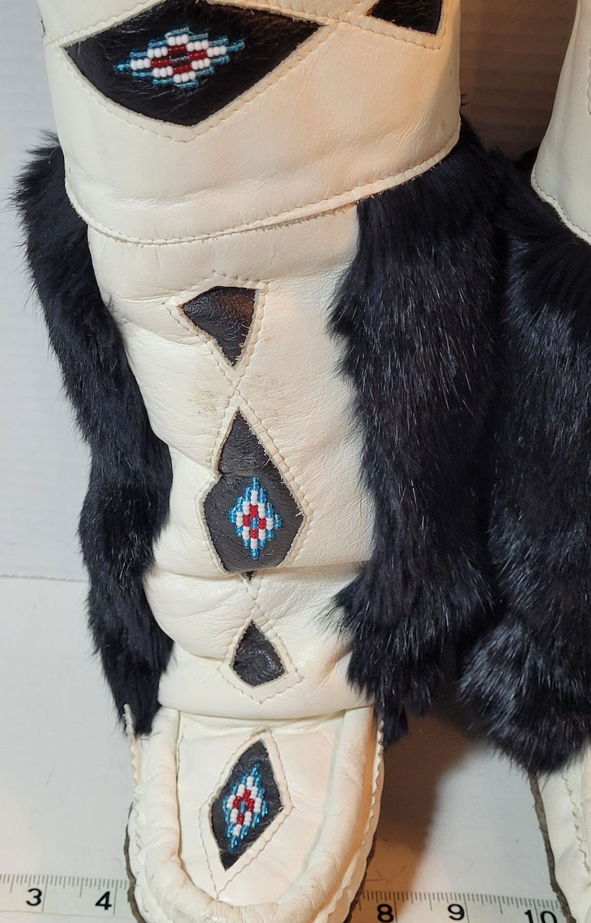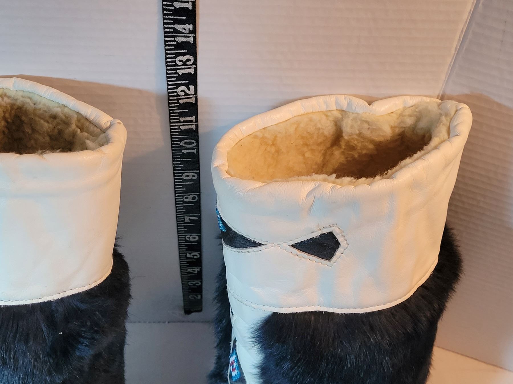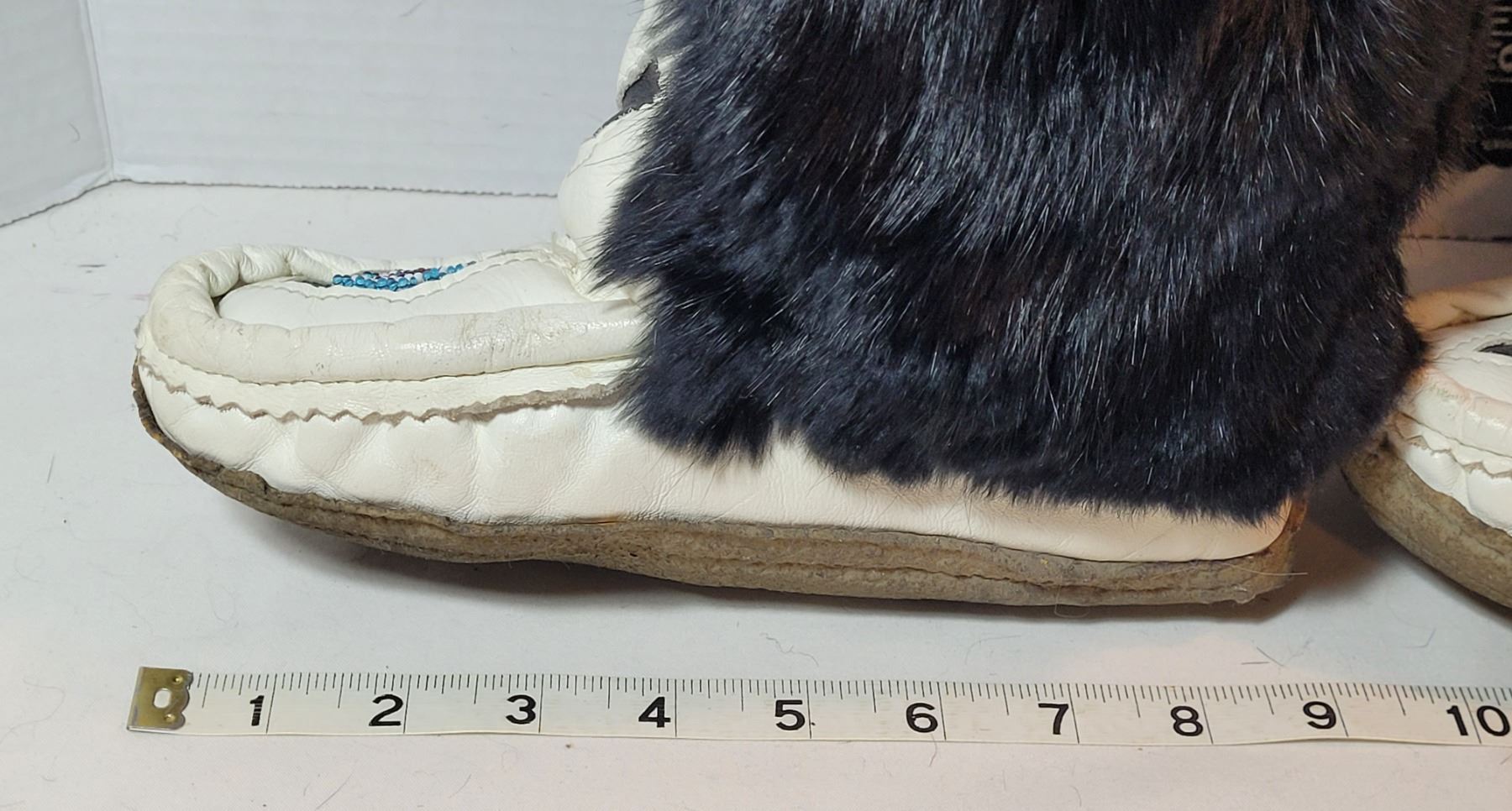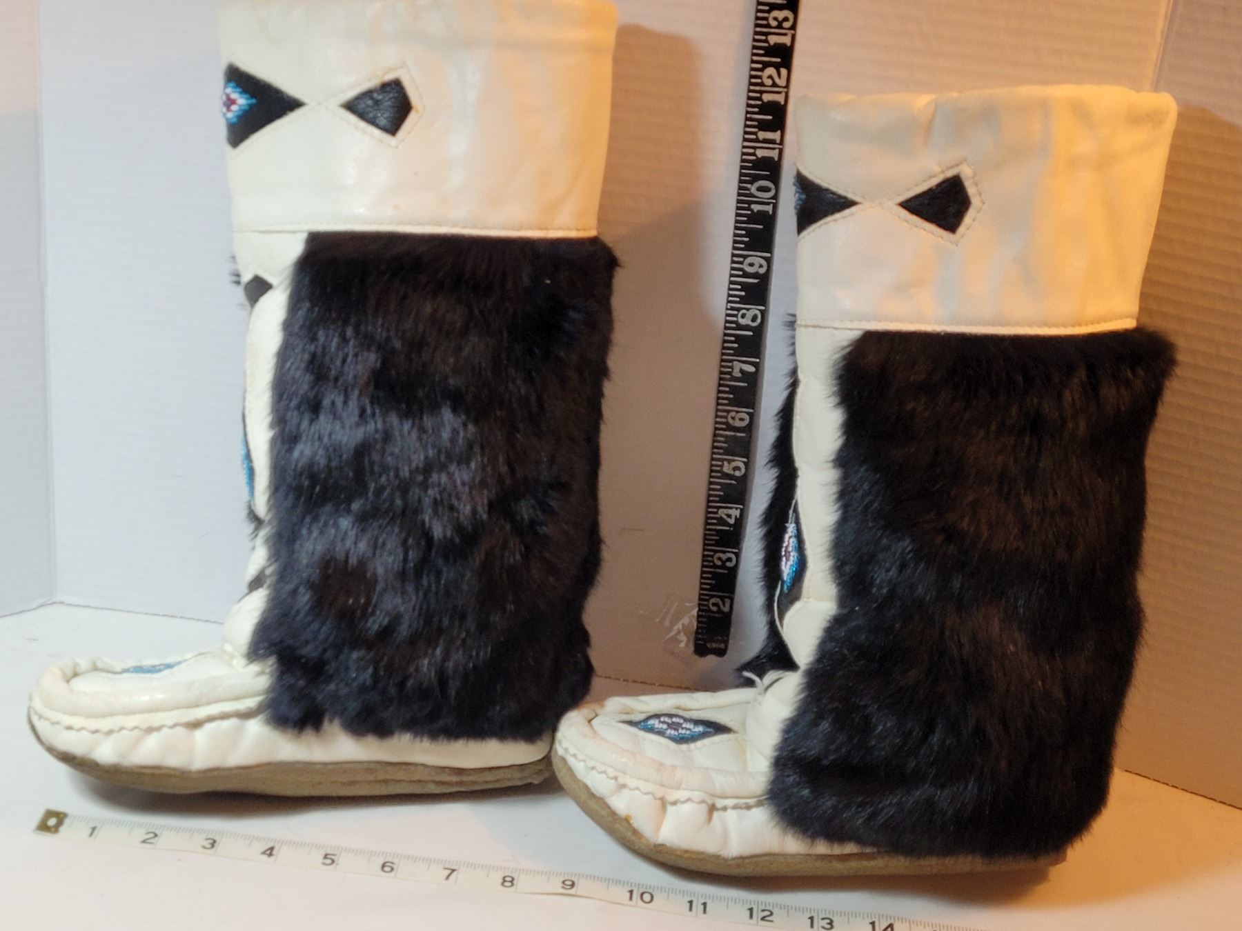 Smooth white leather, beaded mukluks. Black rabbit fur, pile lined, rubber sole, Minor sole repair r.