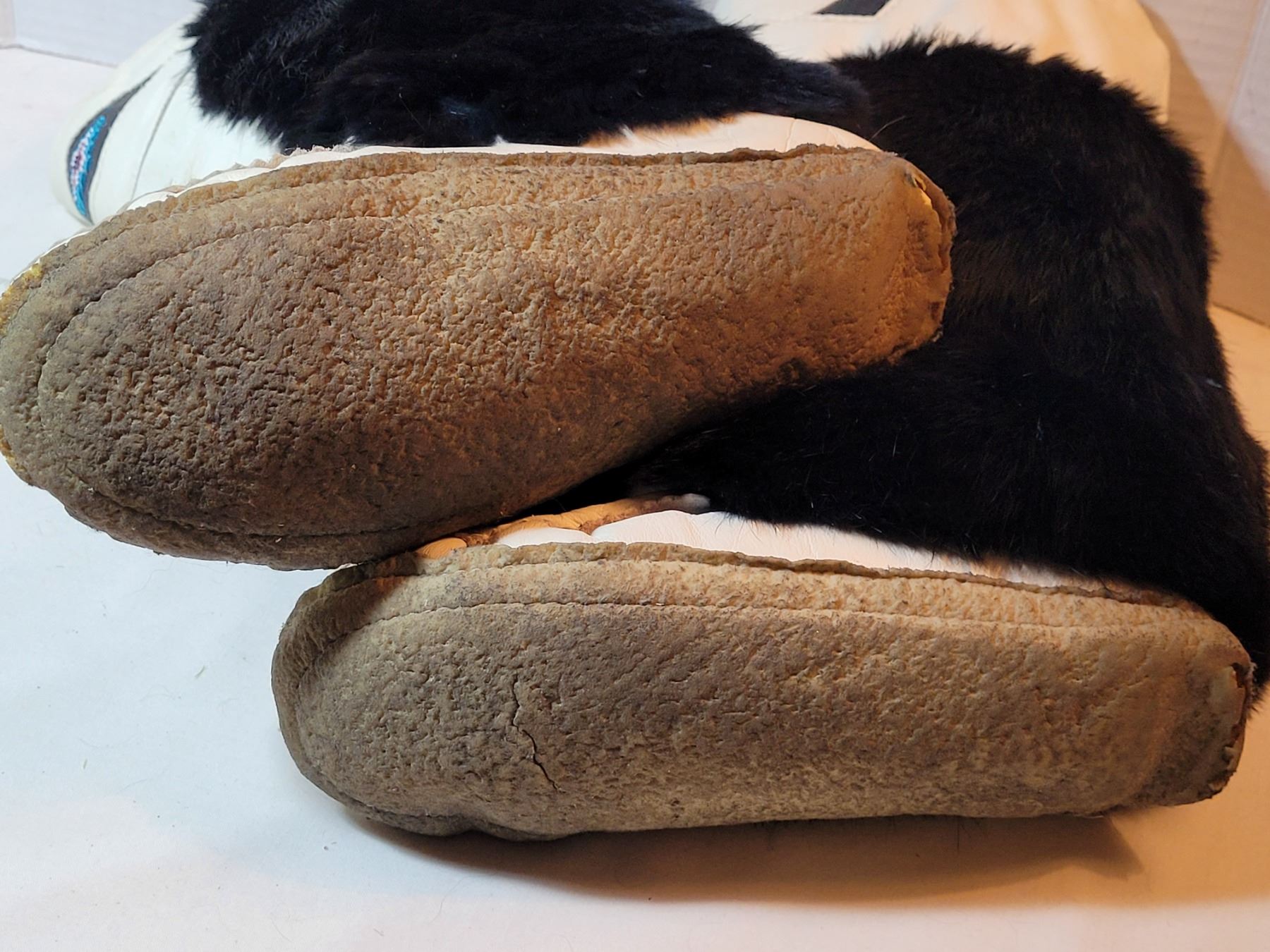 Smooth white leather, beaded mukluks. Black rabbit fur, pile lined, rubber sole, Minor sole repair r