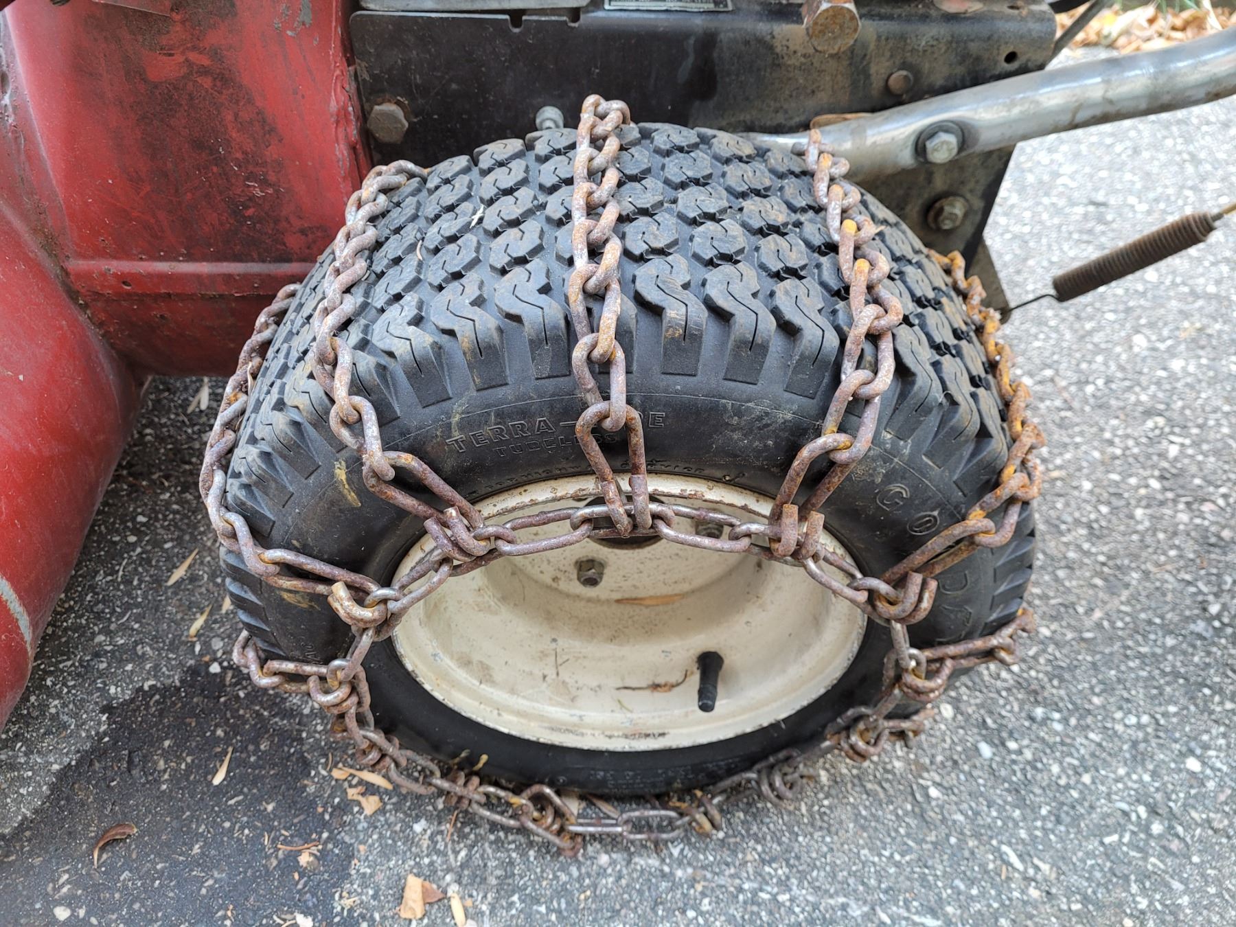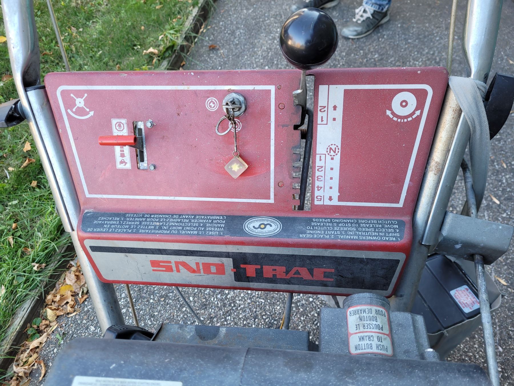 Sno-Trac snow thrower, 11HP, 33 inch. Needs new electric starter. See pics for Briggs & Stratton parts number.