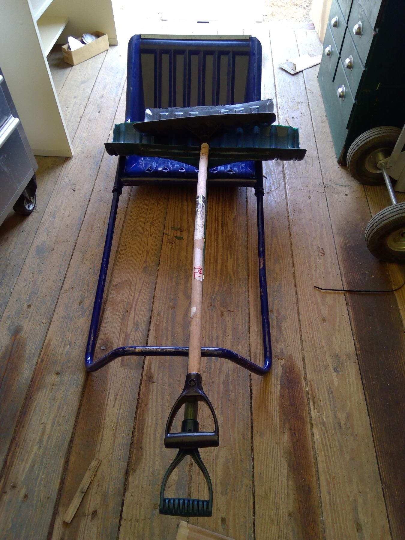 Snow scoop and 2 shovels