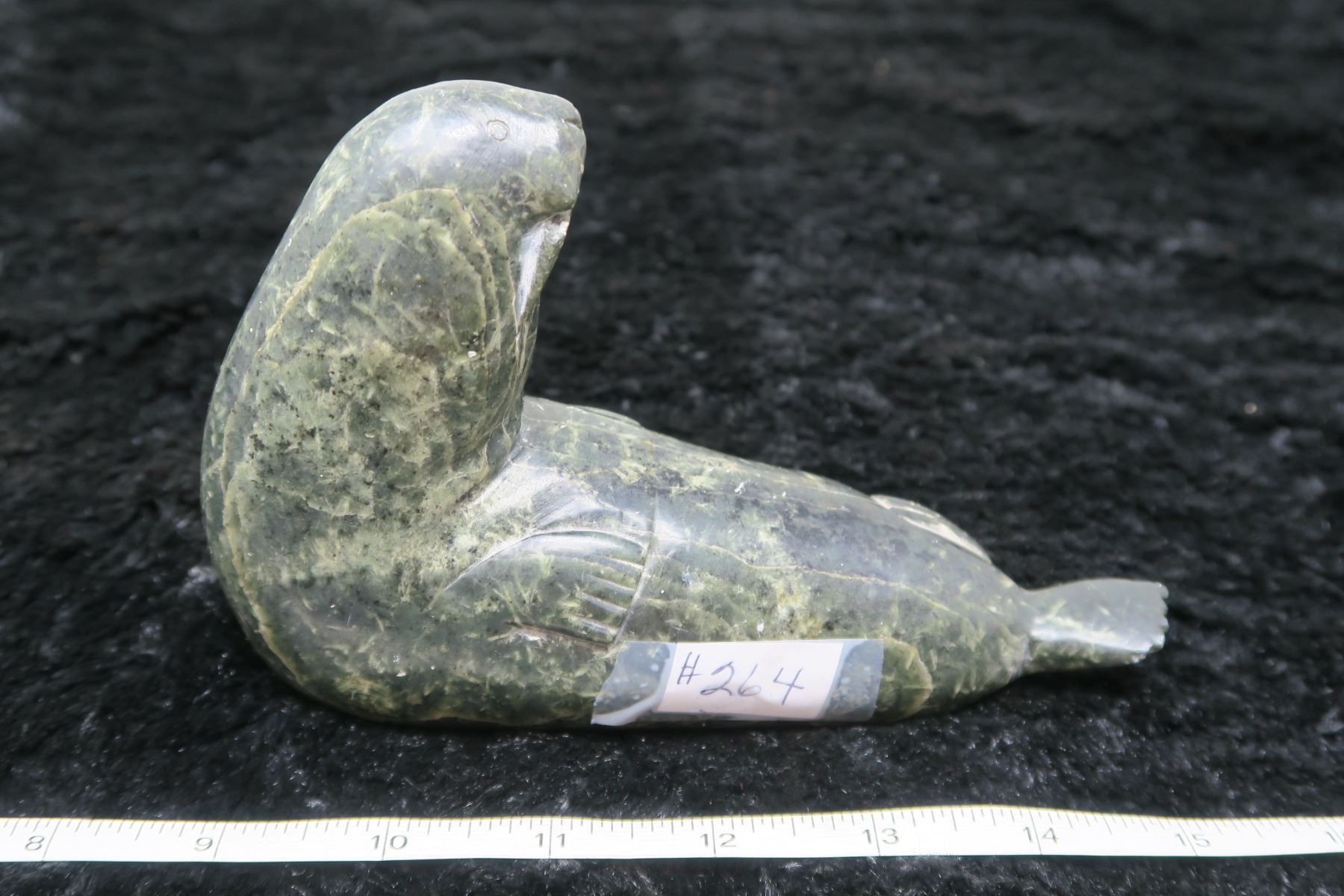 Soapstone Walrus, 6 ½” long, 4 ½” high, signed in symbols