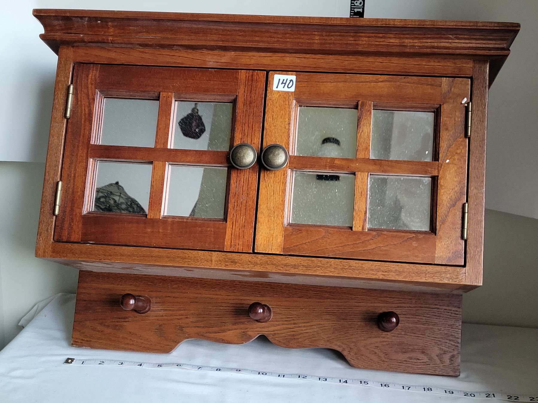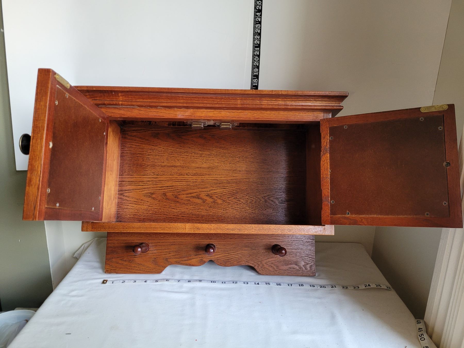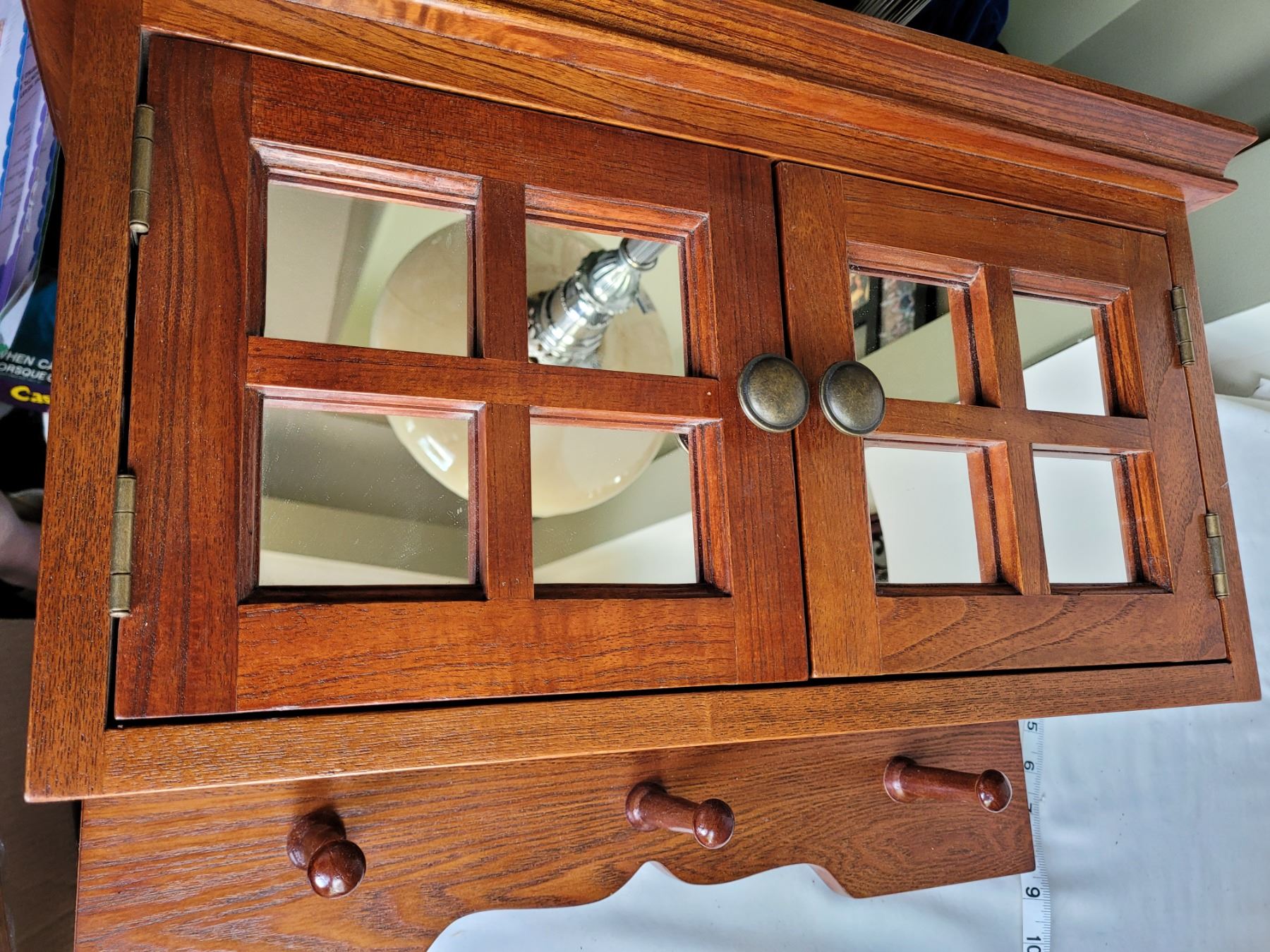 Solid oak entree cabinet. Mirrored doors, peg hangers. Excellent condition.