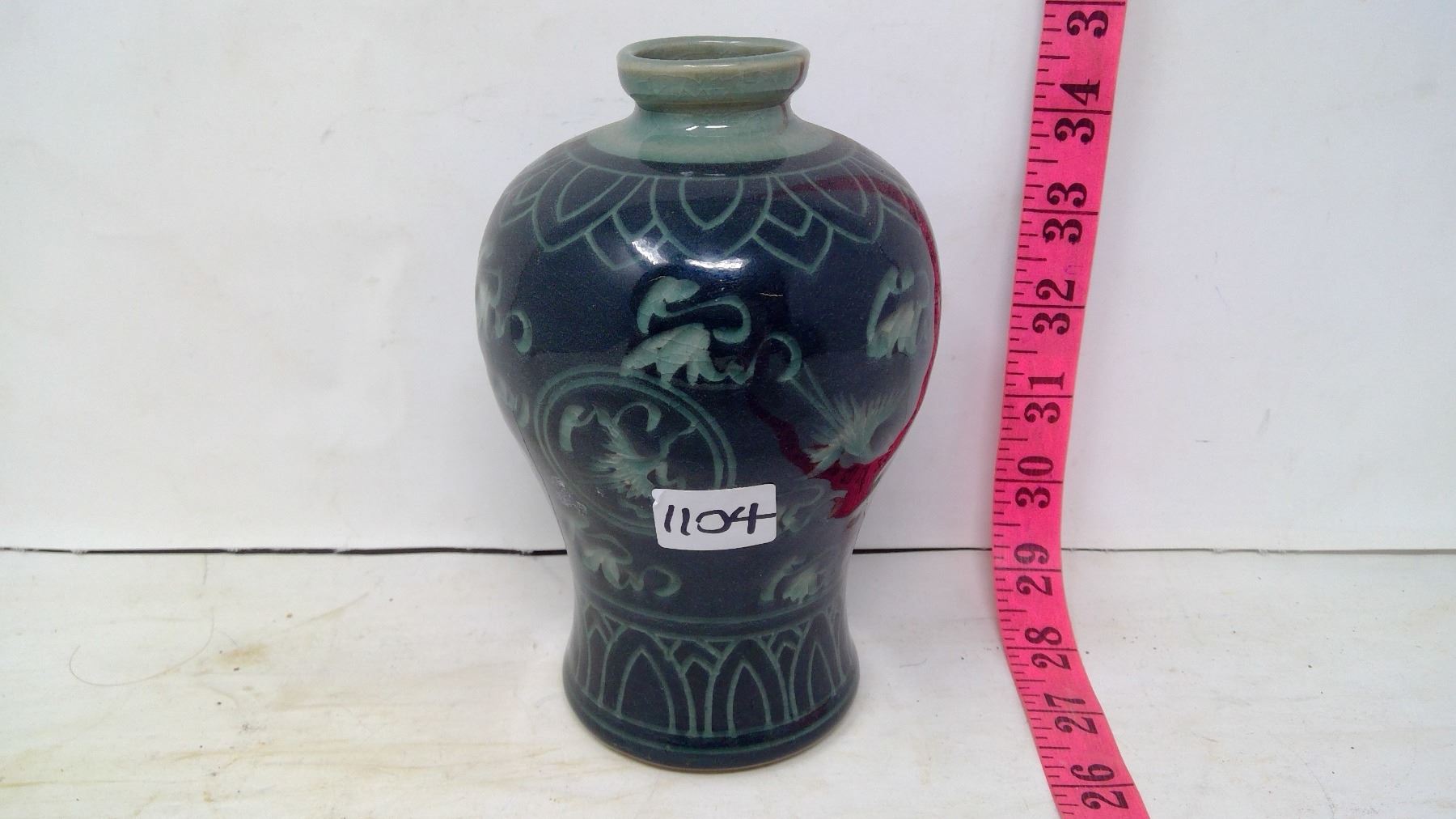 ‘Maebyong' style ornamental handmade celadon ceramic vase. Height: 6 1/4". Width 4 1/4". Celadon green and black with etched inlay storks, clouds, mountains, lotus flower petals. The technique and successful perfect result is rare and highly valued. Nearly every Korean household displays such with pride of national history. Design. Circa 1300 A.D. Museum copy.