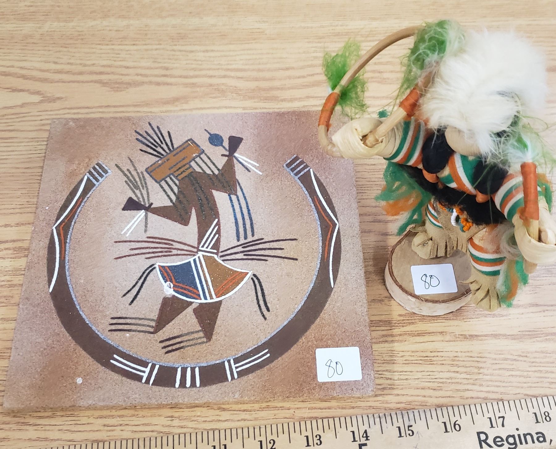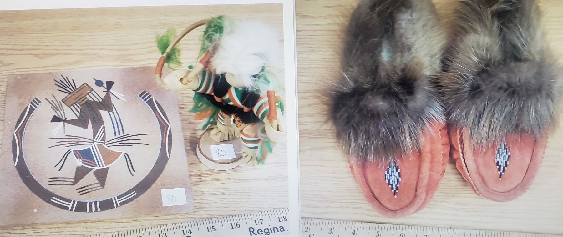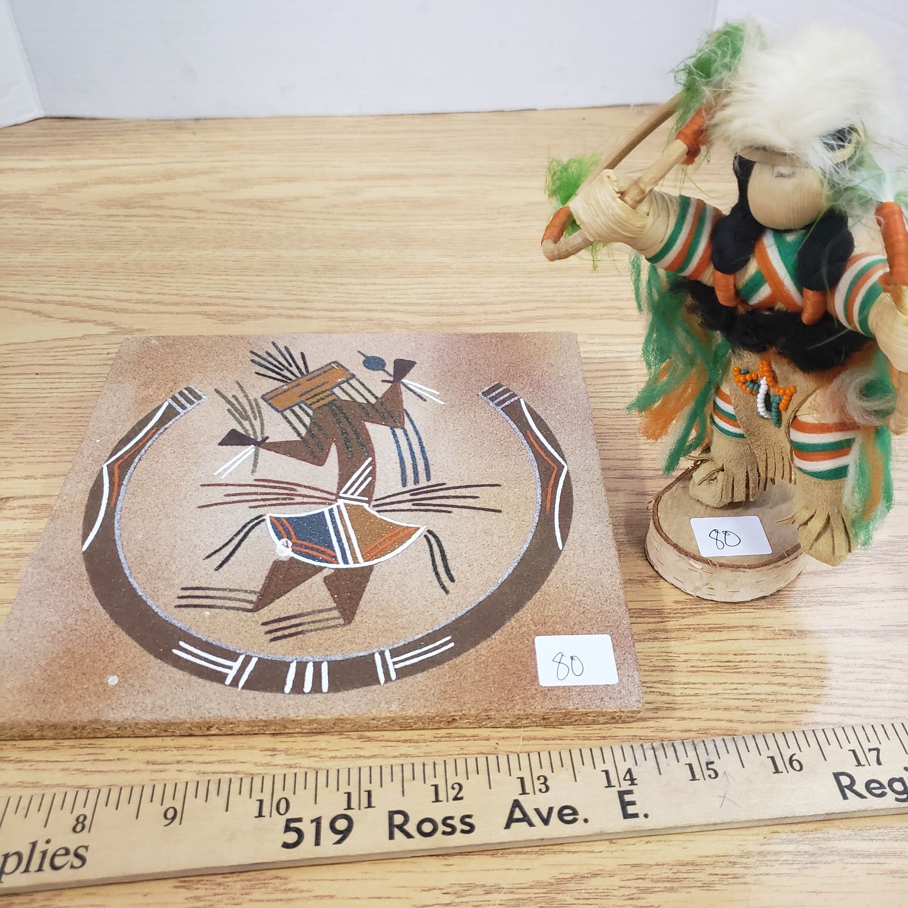 Southwest art tile, corn husk hoop dancer and moccasins size 7