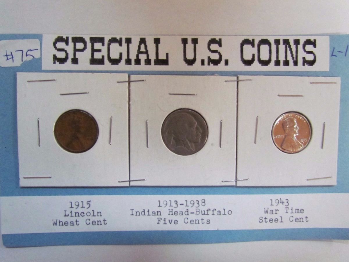 Special U.S. Coins - 1915 Lincoln "wheat" cent, Indian Head Buffalo Five Cents, 1943 Steel Cent (mag