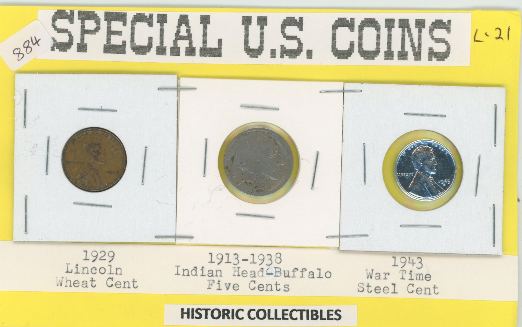 Special U.S. coins: 1929 Lincoln one cent, Indian Head Buffalo 5 cent and 1943 emergency issue steel cent that is magnetic