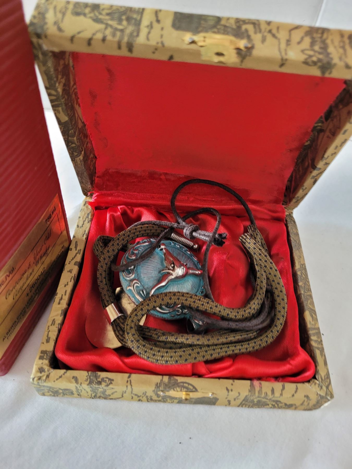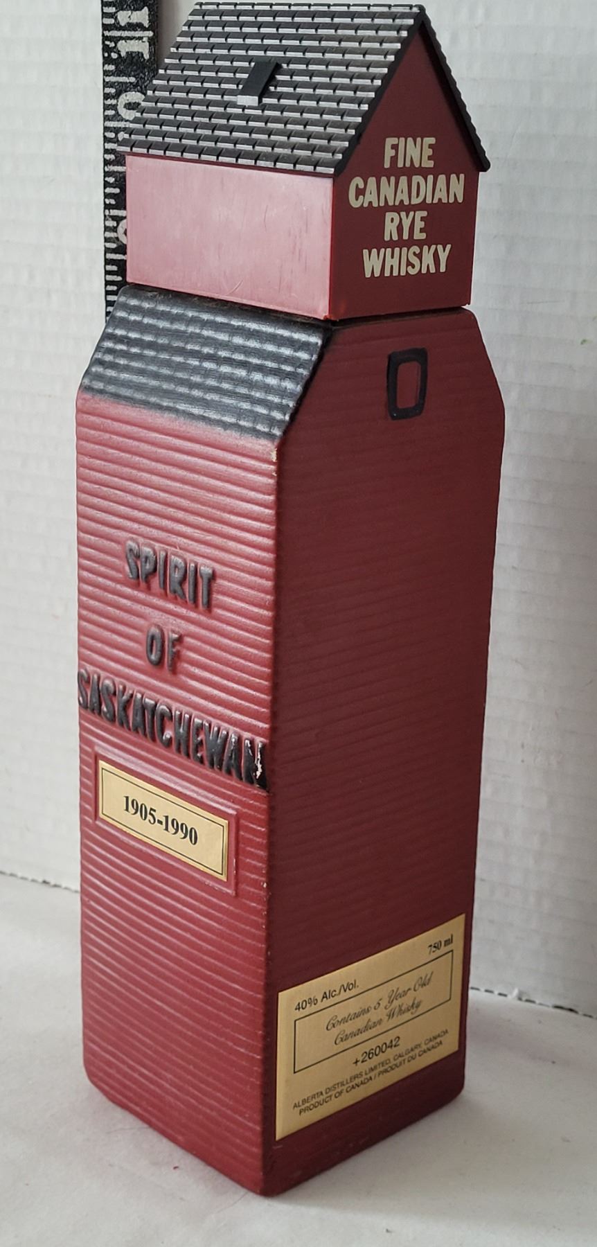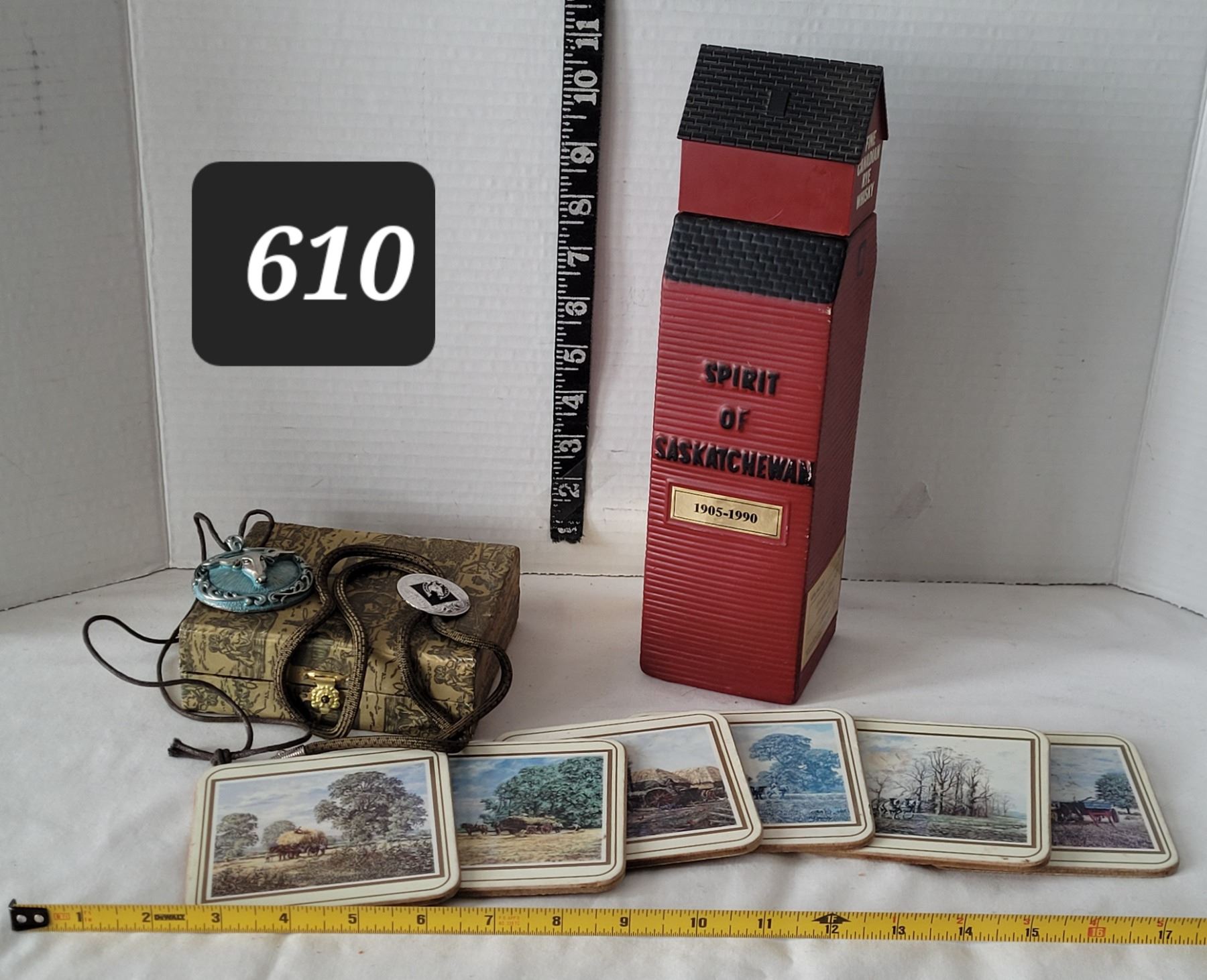 Spirit of Saskatchewan elevator whisky bottle. Prairie motif box, coasters plus western Bolo tie & pendant.