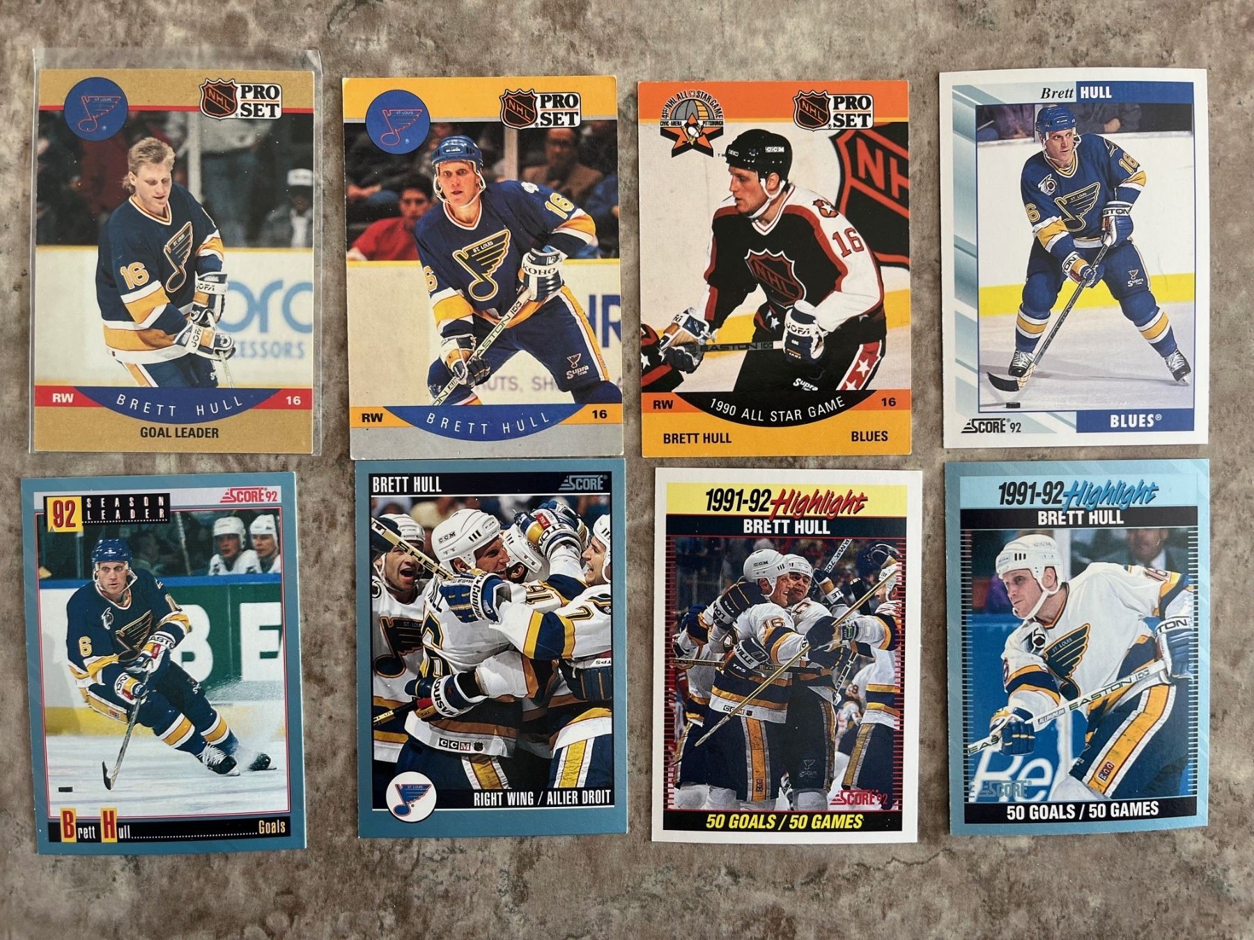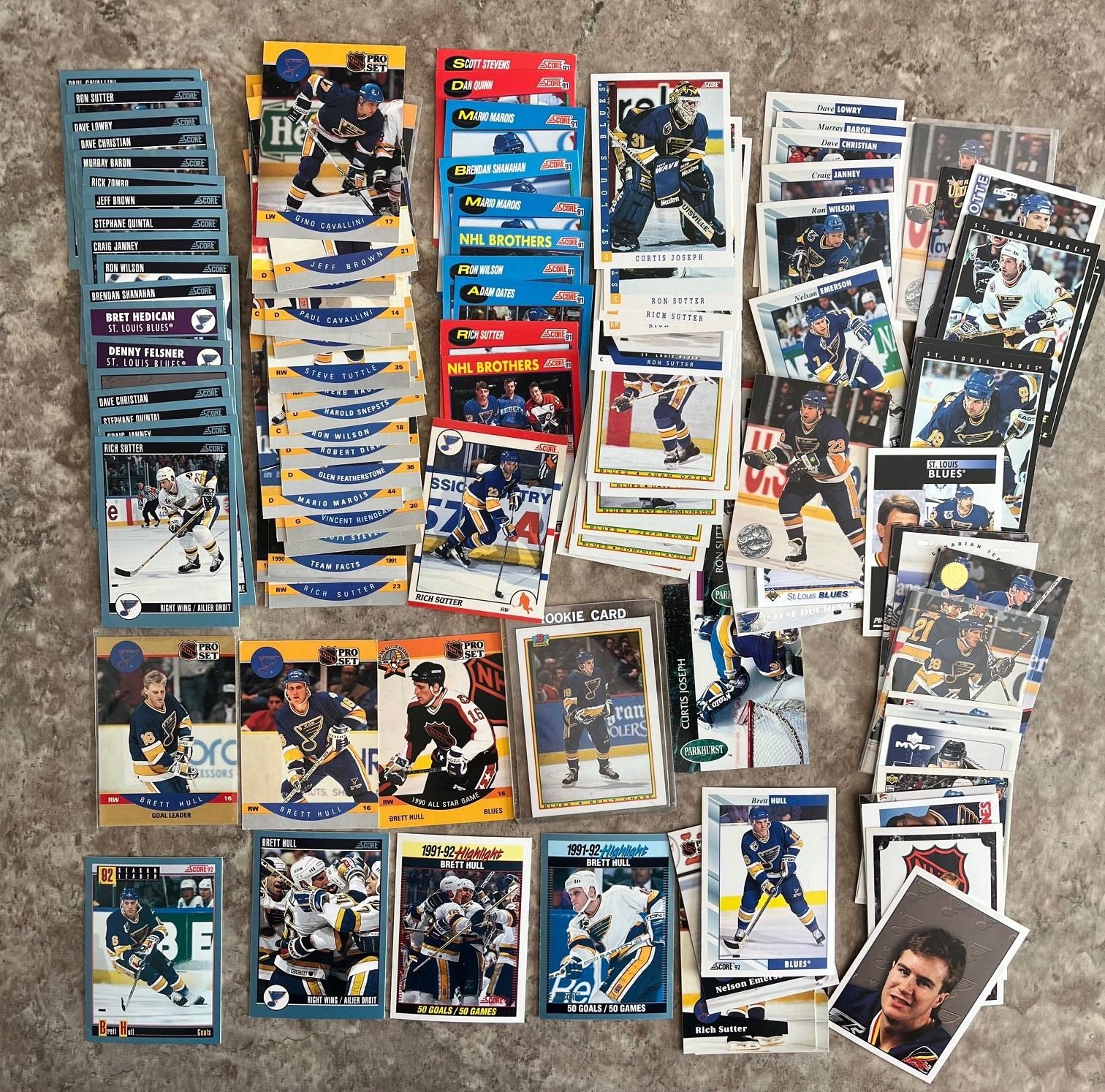 St. Louis Blues lot of 150ish hockey cards. Brett Hull. Kelly Chase Bowman rookie. Mixed Brands. Mixed Years. Some duplicates.