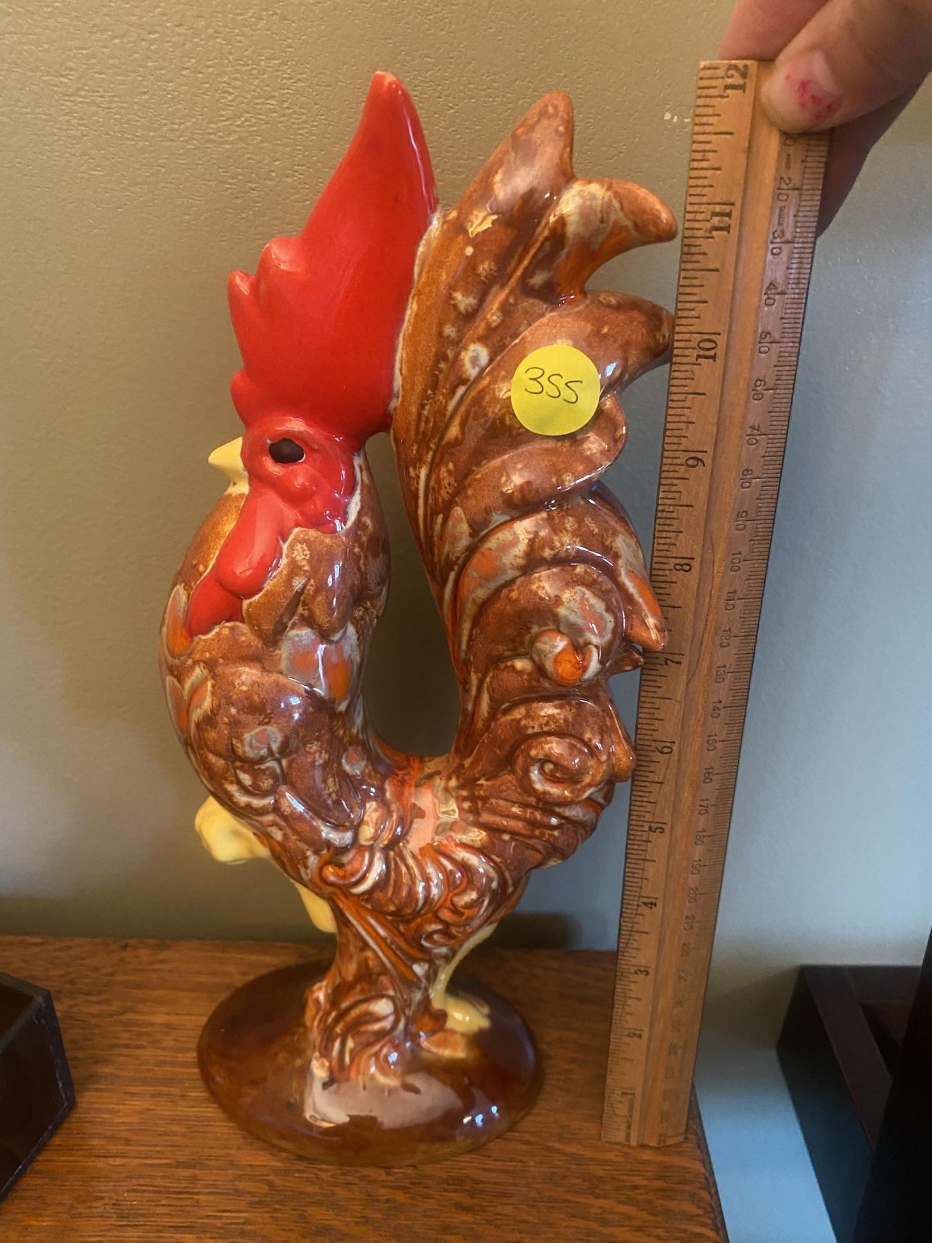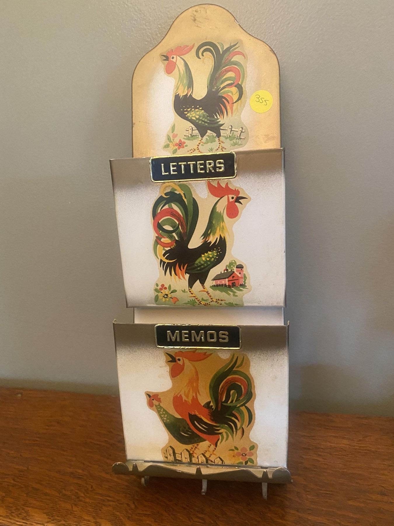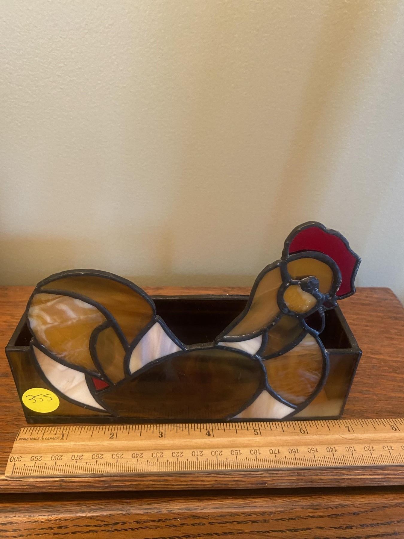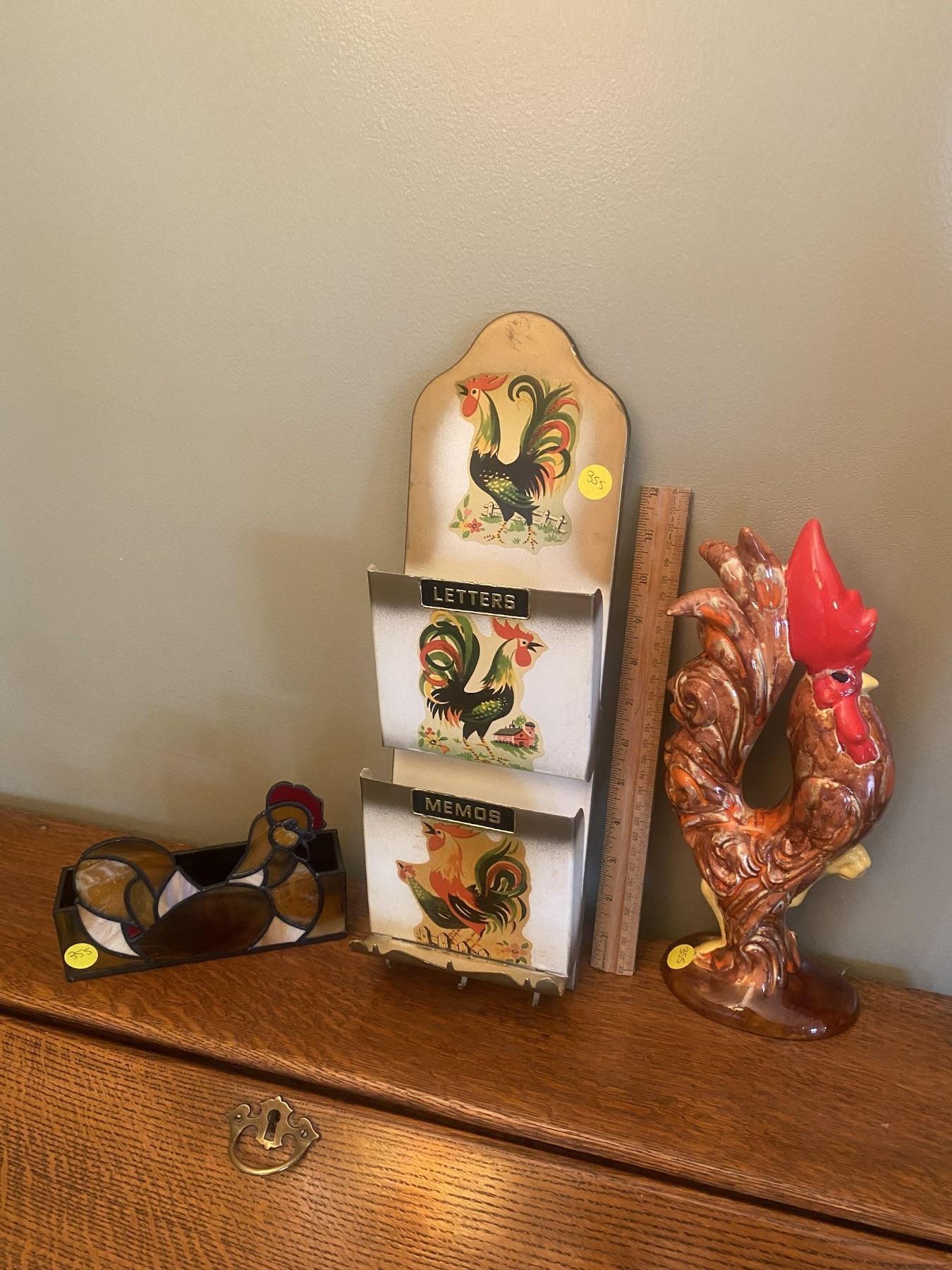 Stained glass, chicken, napkin holder (Has a couple of hairline cracks on neck). Vintage tin envelope, and key holder with rooster theme. Vintage ceramic, glazed rooster, collector piece.