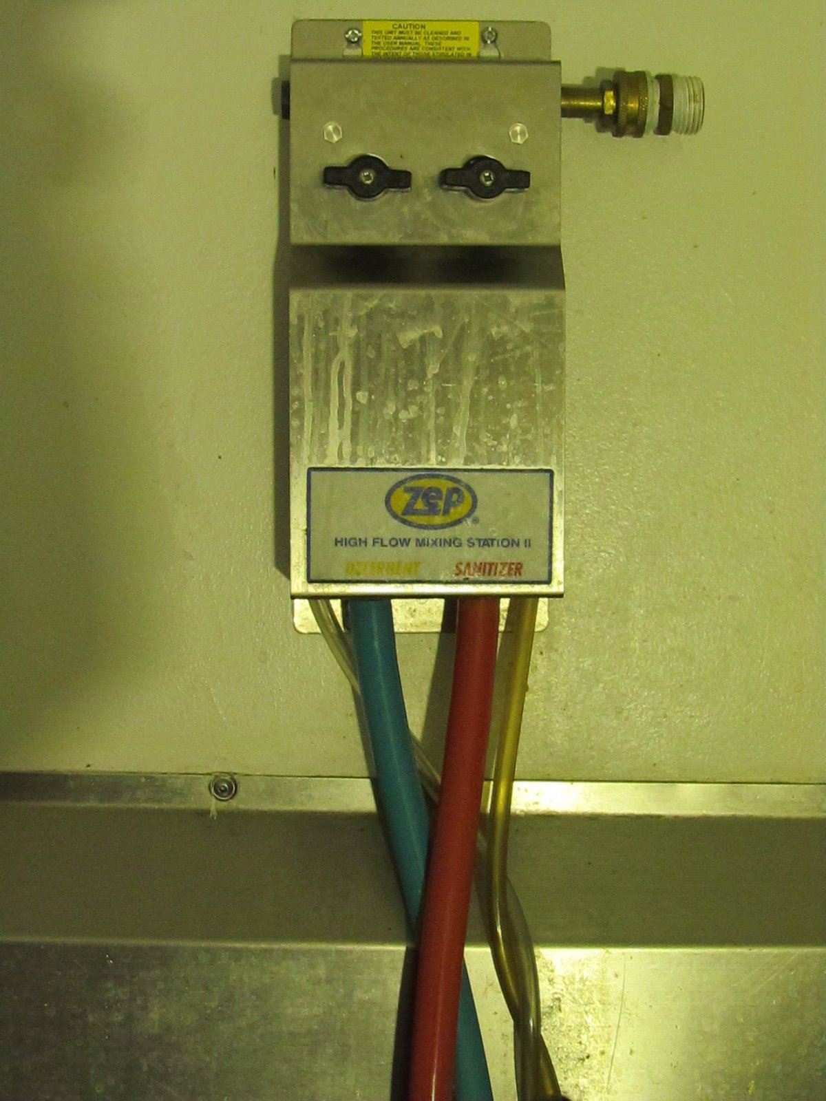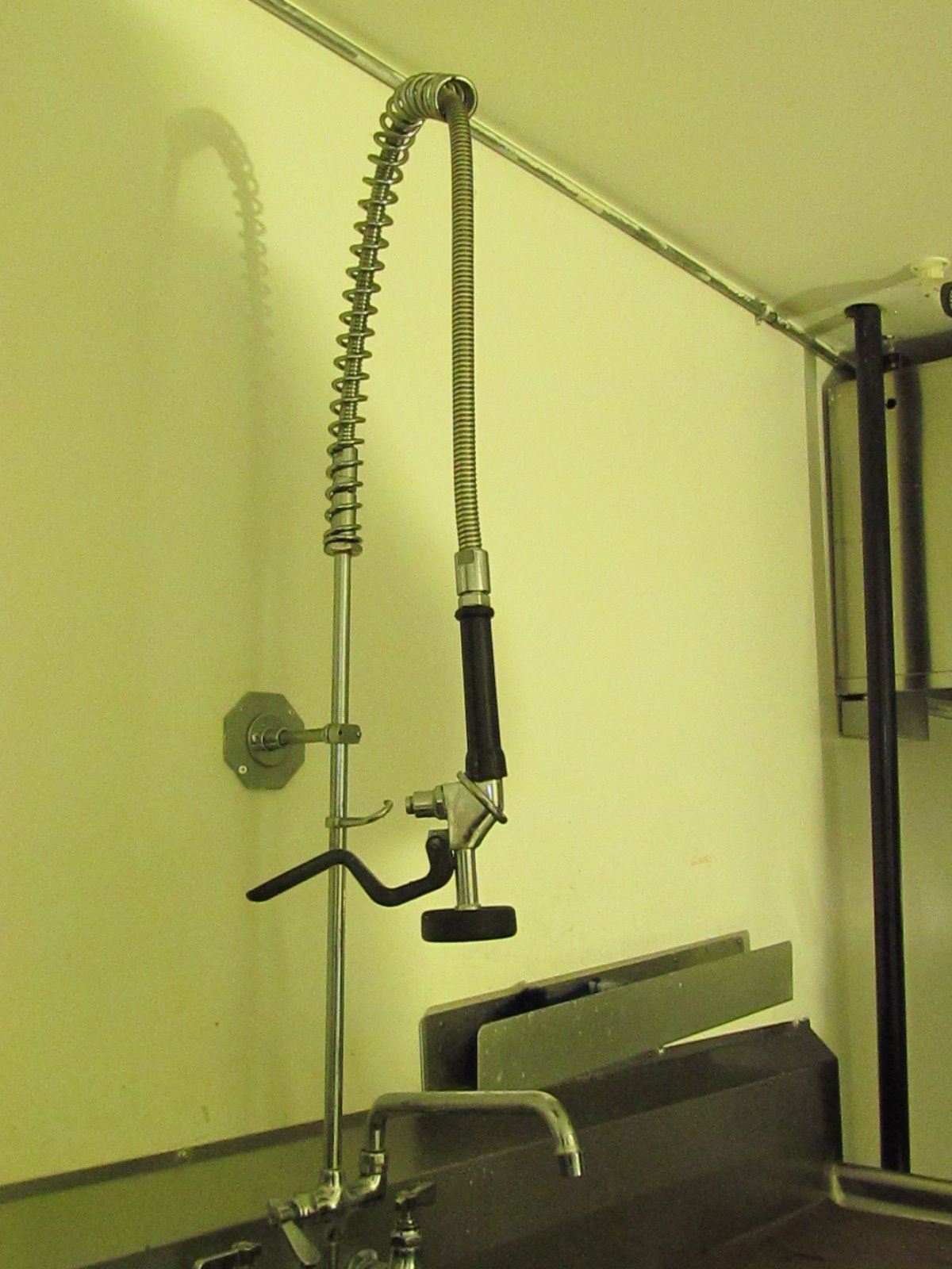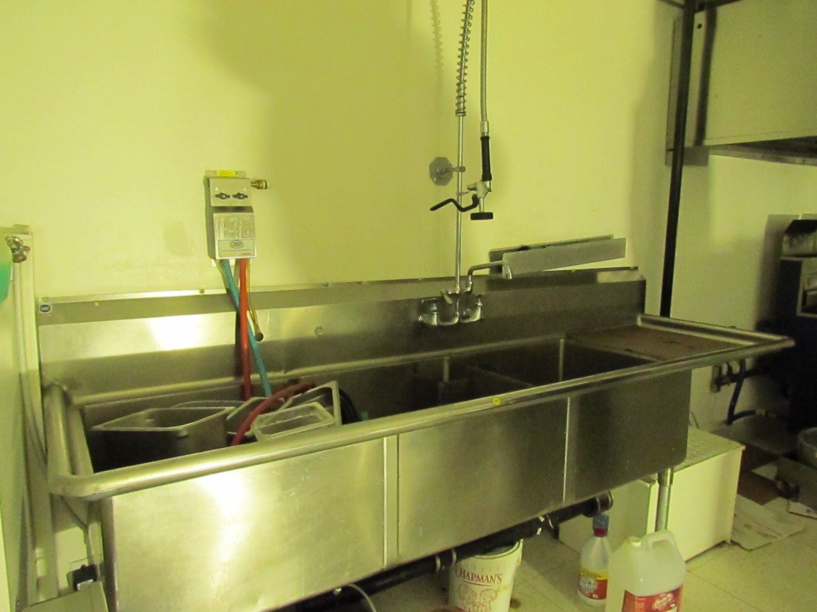 Stainless steel triple sink with attachments. 98 X 30 inch taps and sprayer and soap dispenser