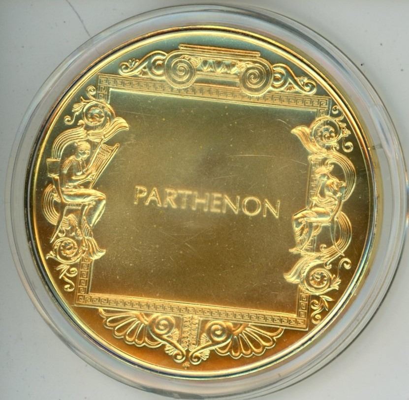 Stele of Dexileos. From the Ancient Greece Medals Series. A beautiful gold-plated bronze medal measuring 50mm in diameter and weighing 79.5 grams. In hard plastic holder. BU.