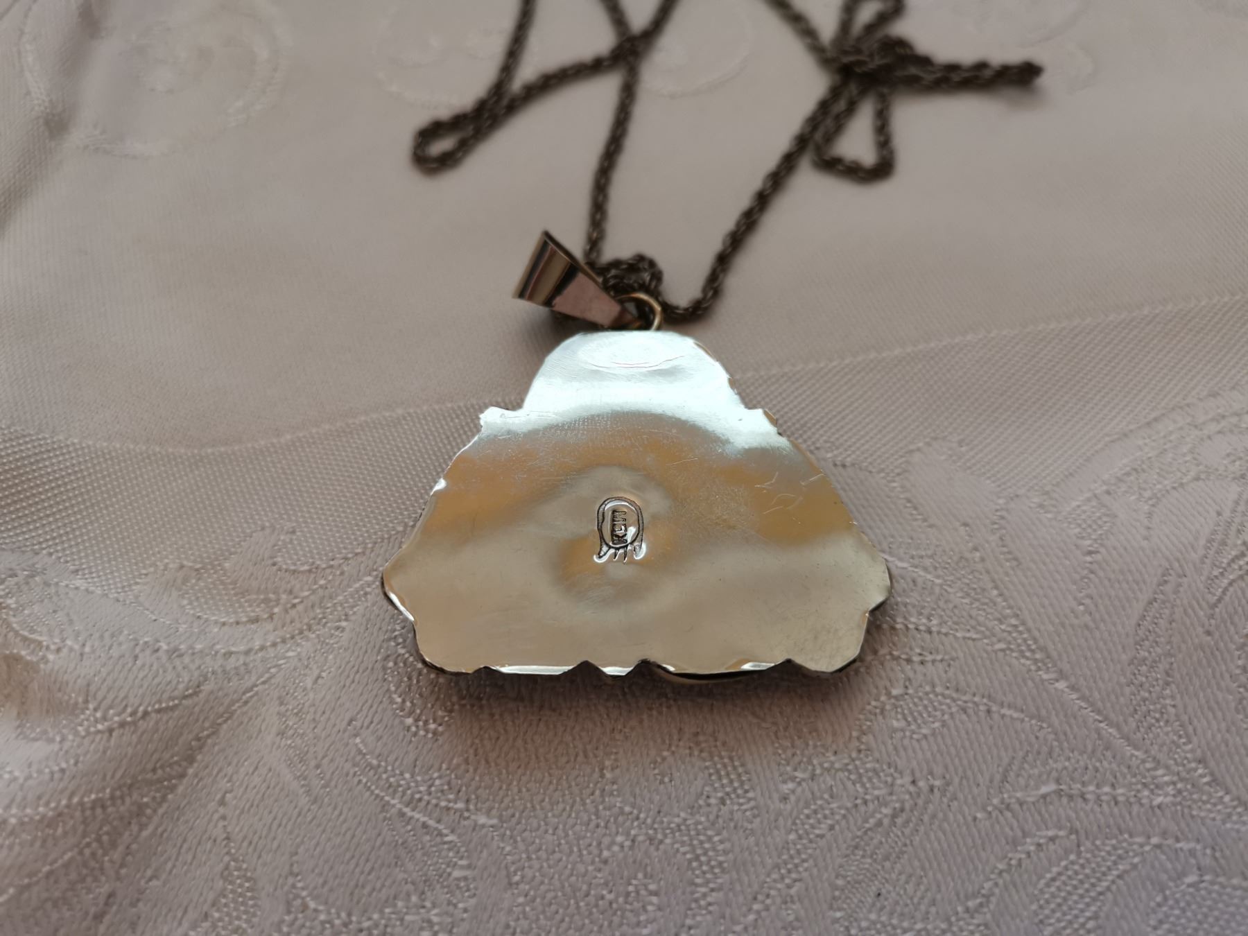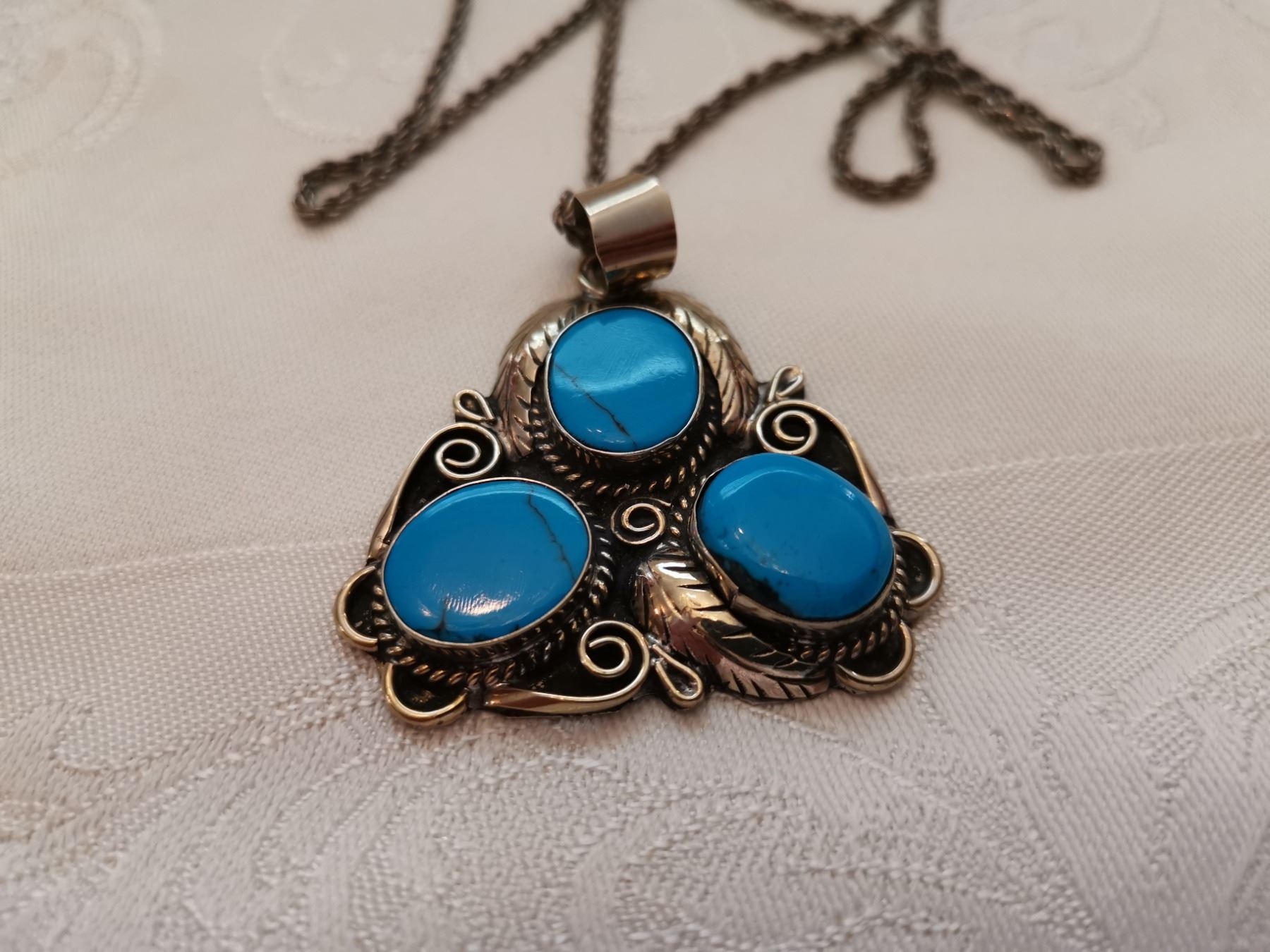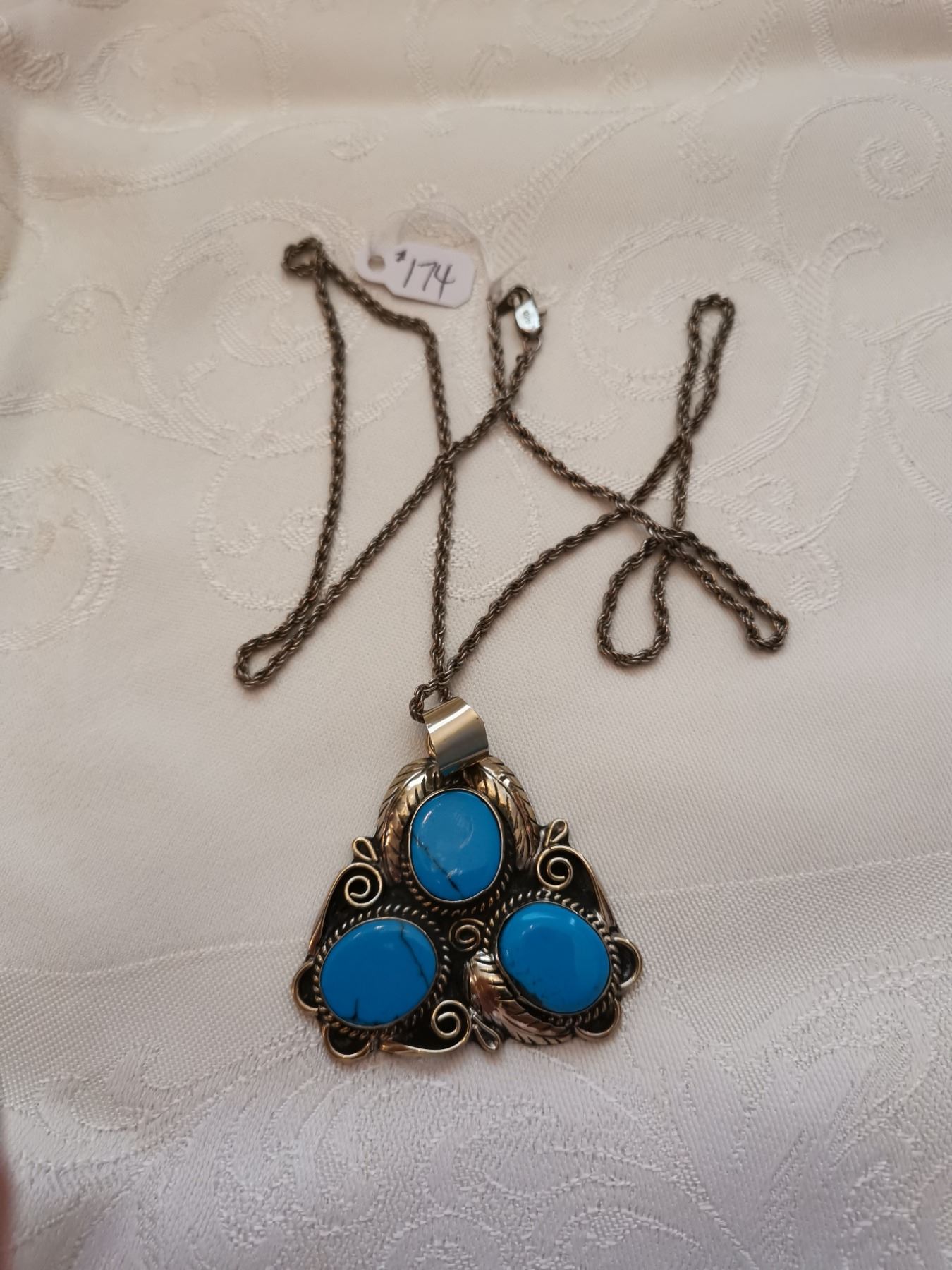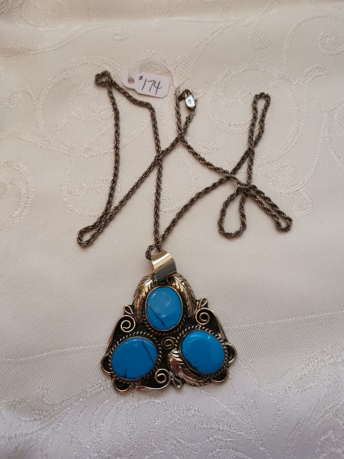 Sterling silver chain, 24”, and feather pendant with faux turquoise stones