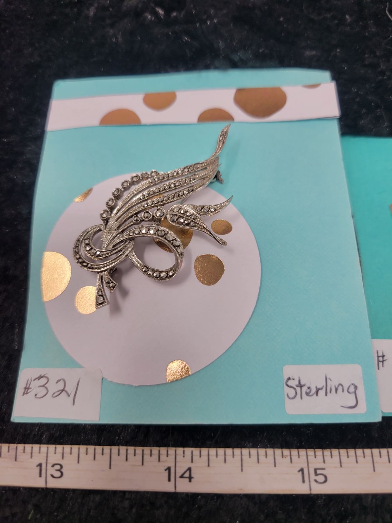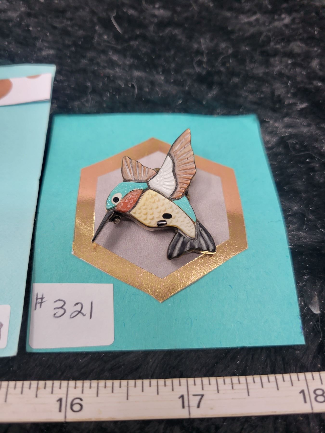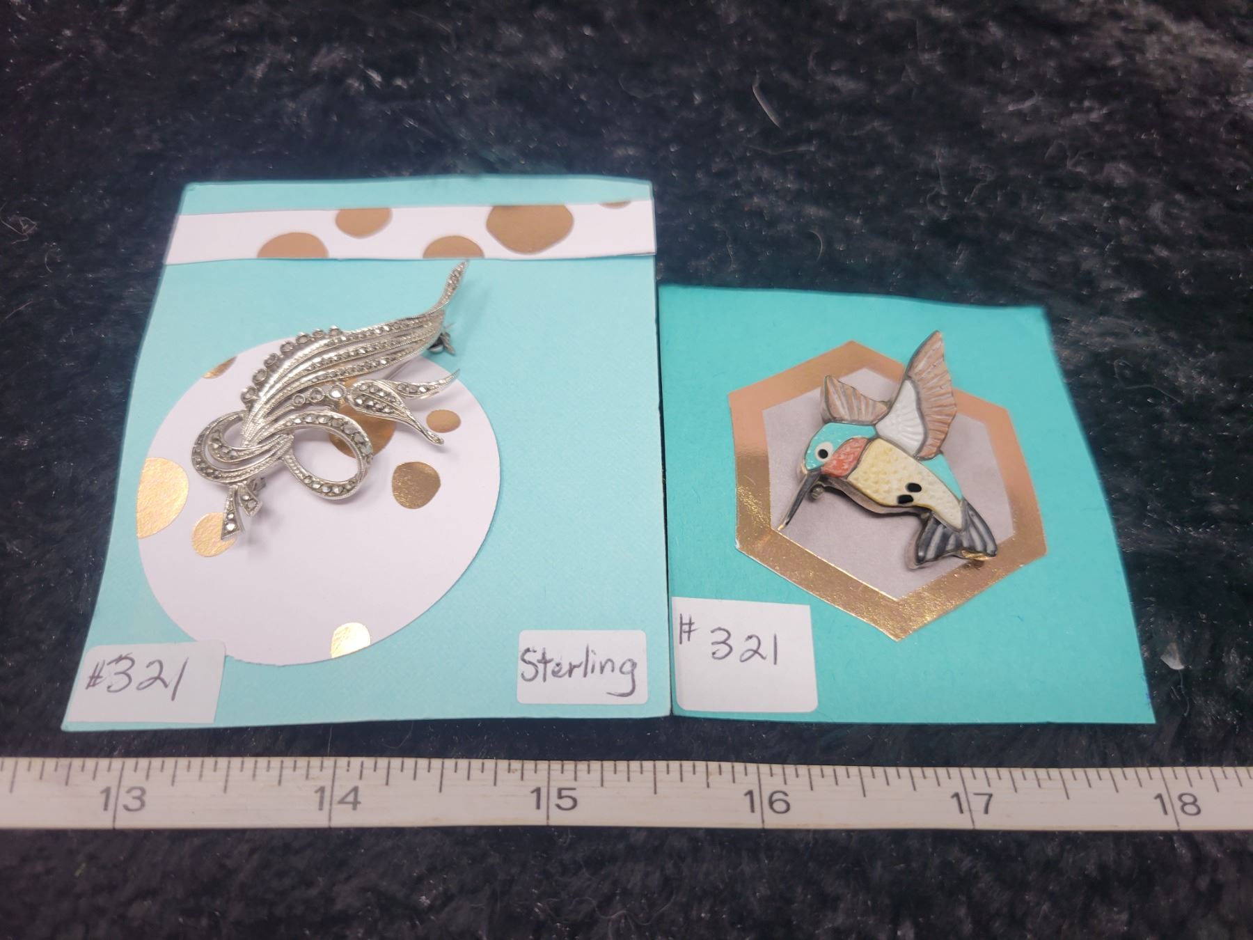 Sterling silver spray broach and Sterling enamelled hummingbird broach
