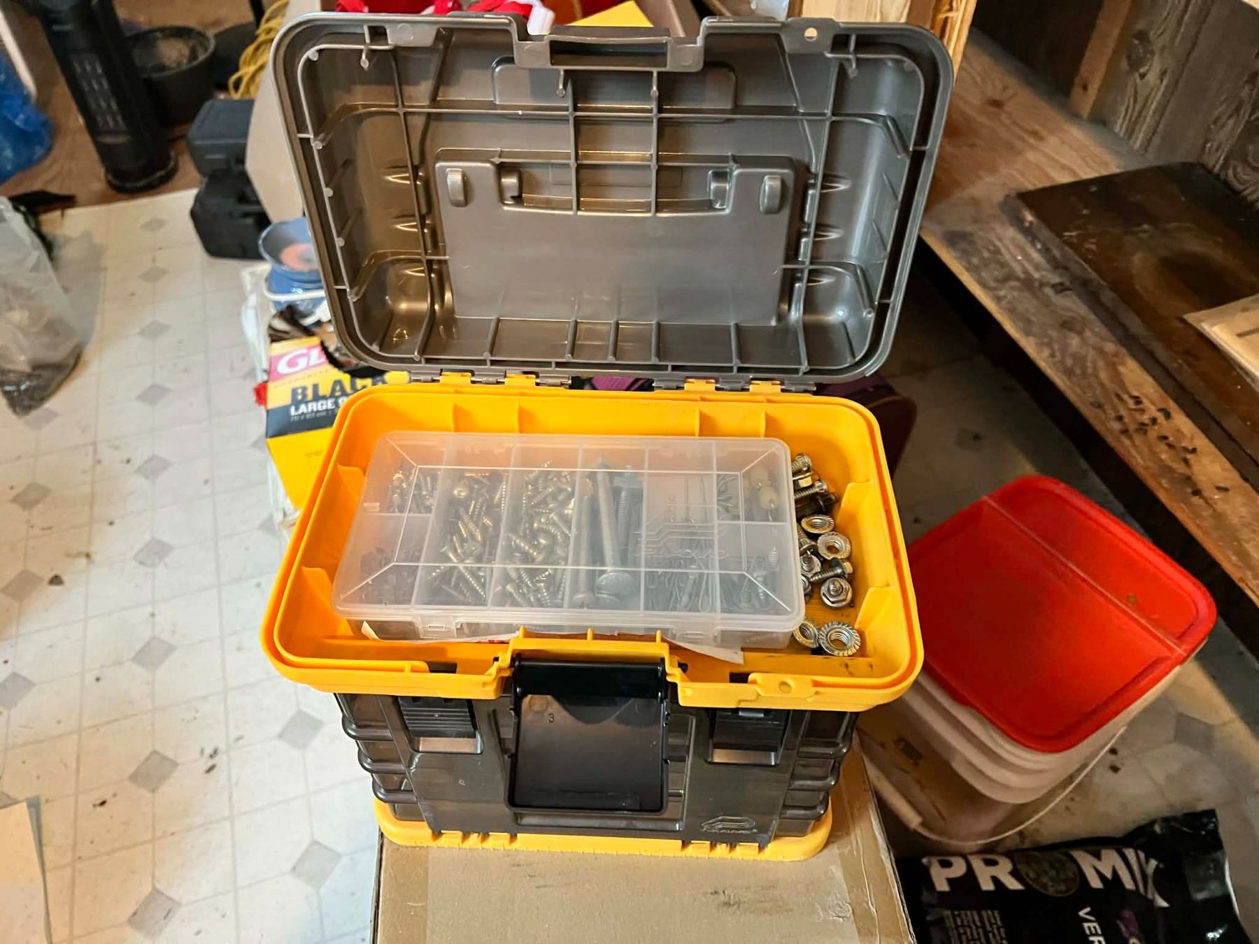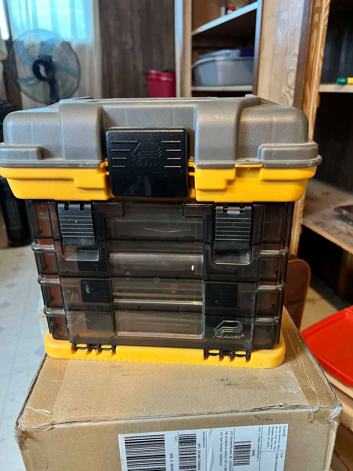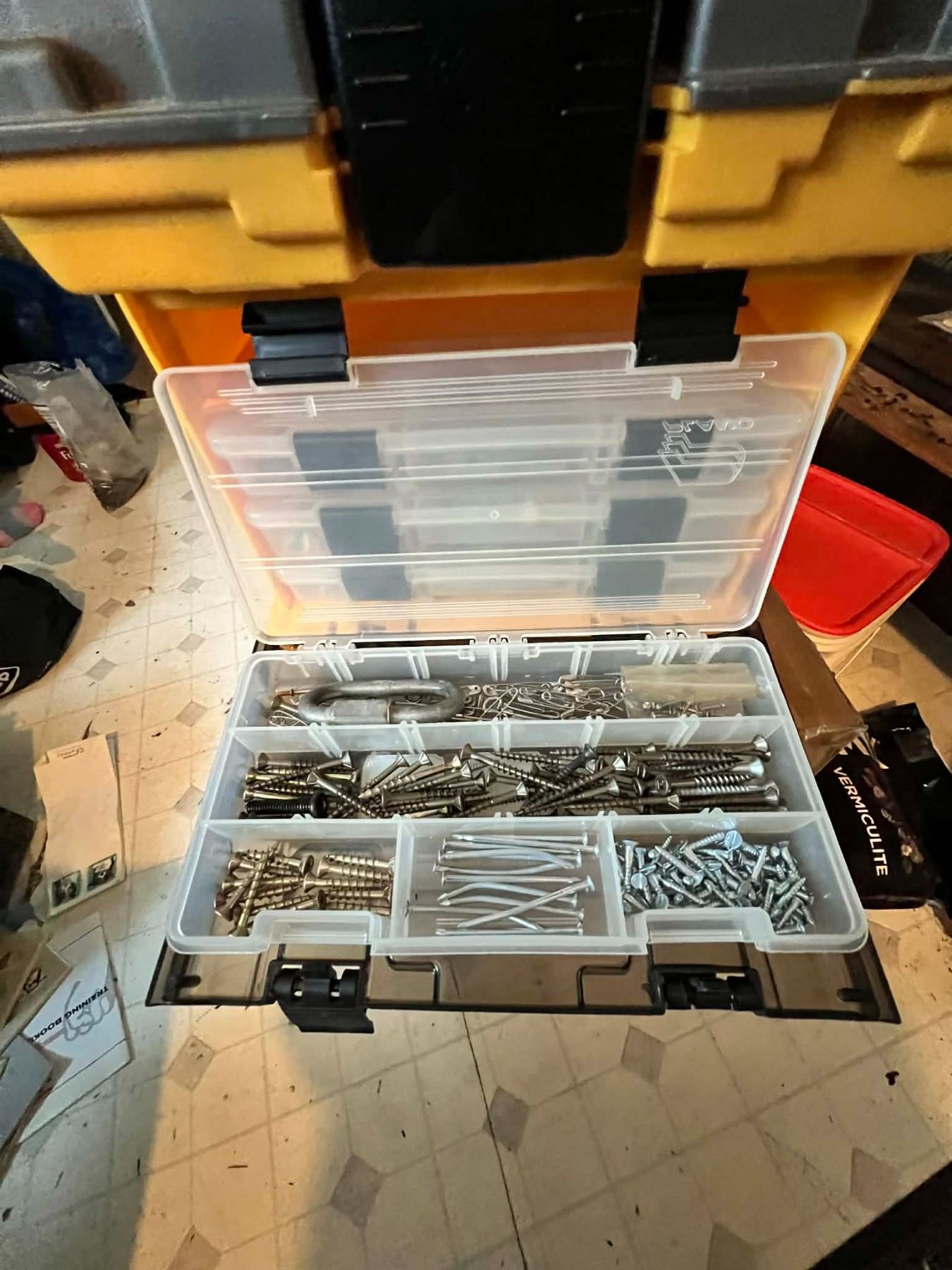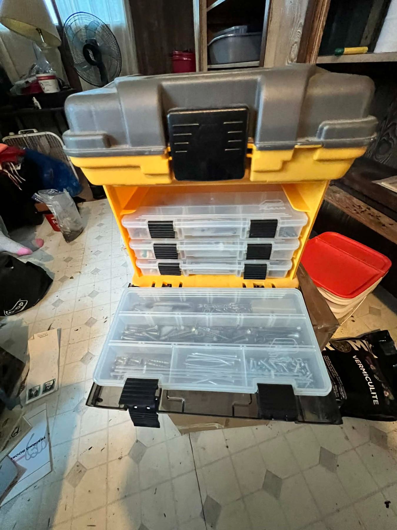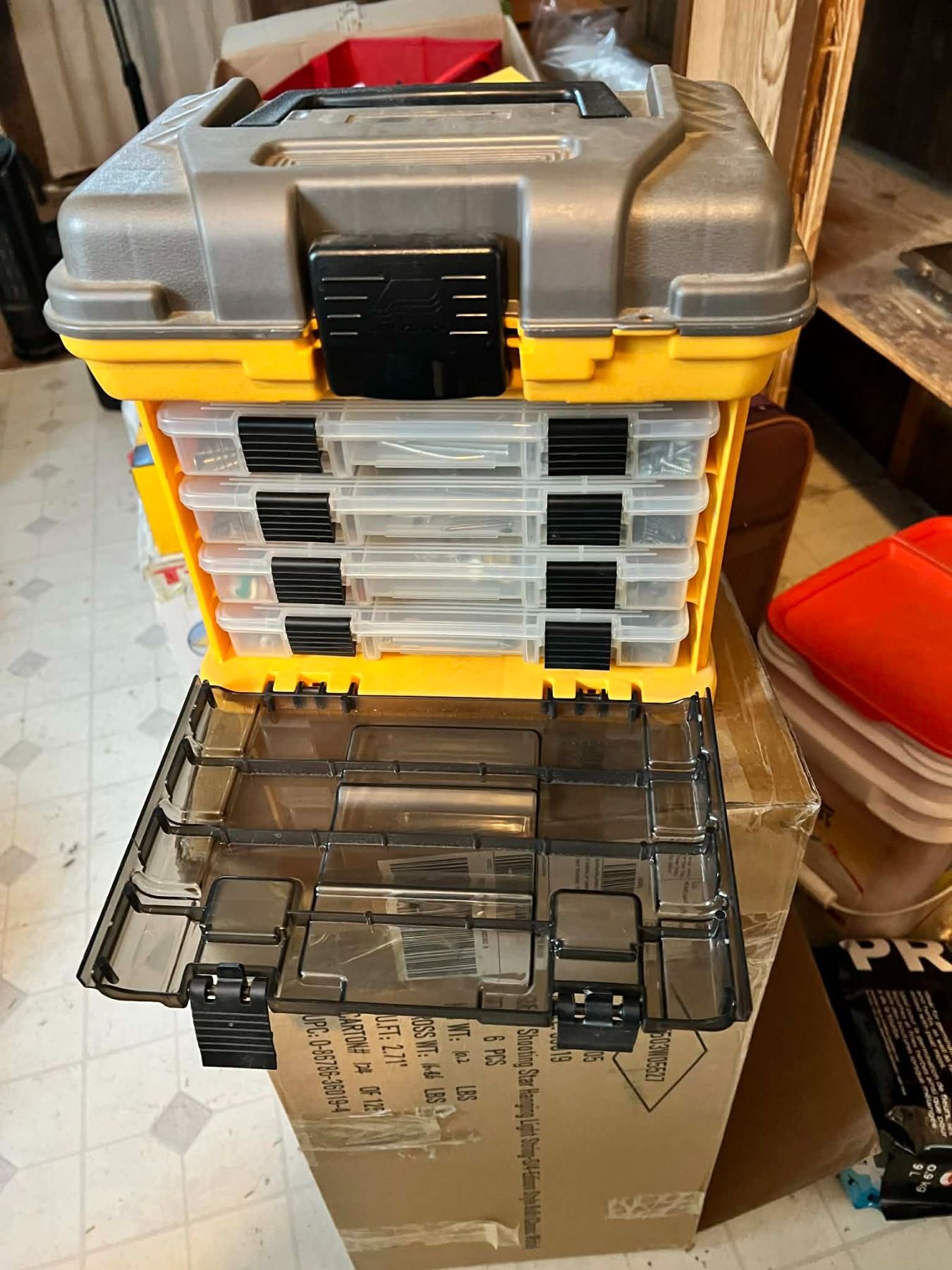 Storage container, 4 drawers and top opens, full of misc screws nails pins too much to mention