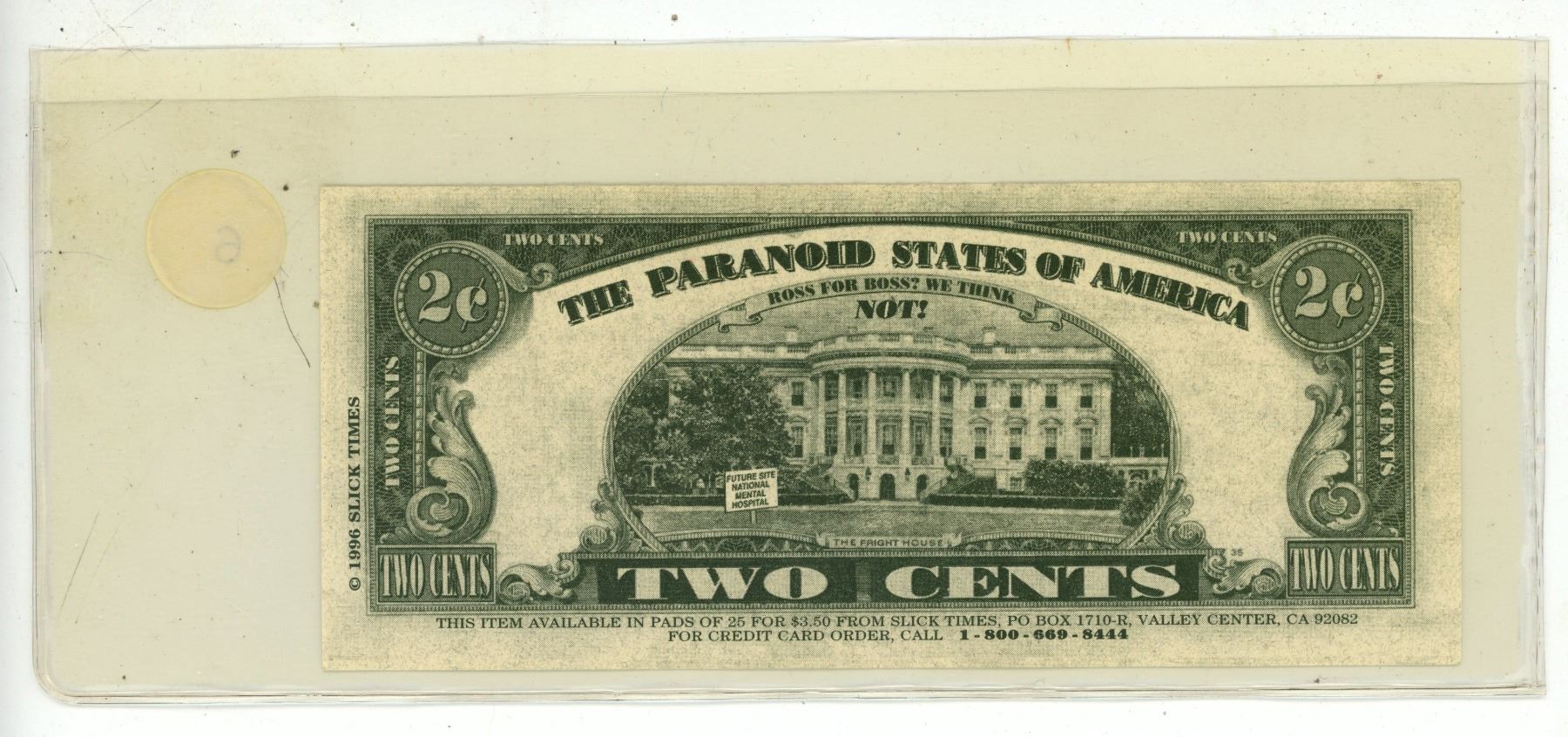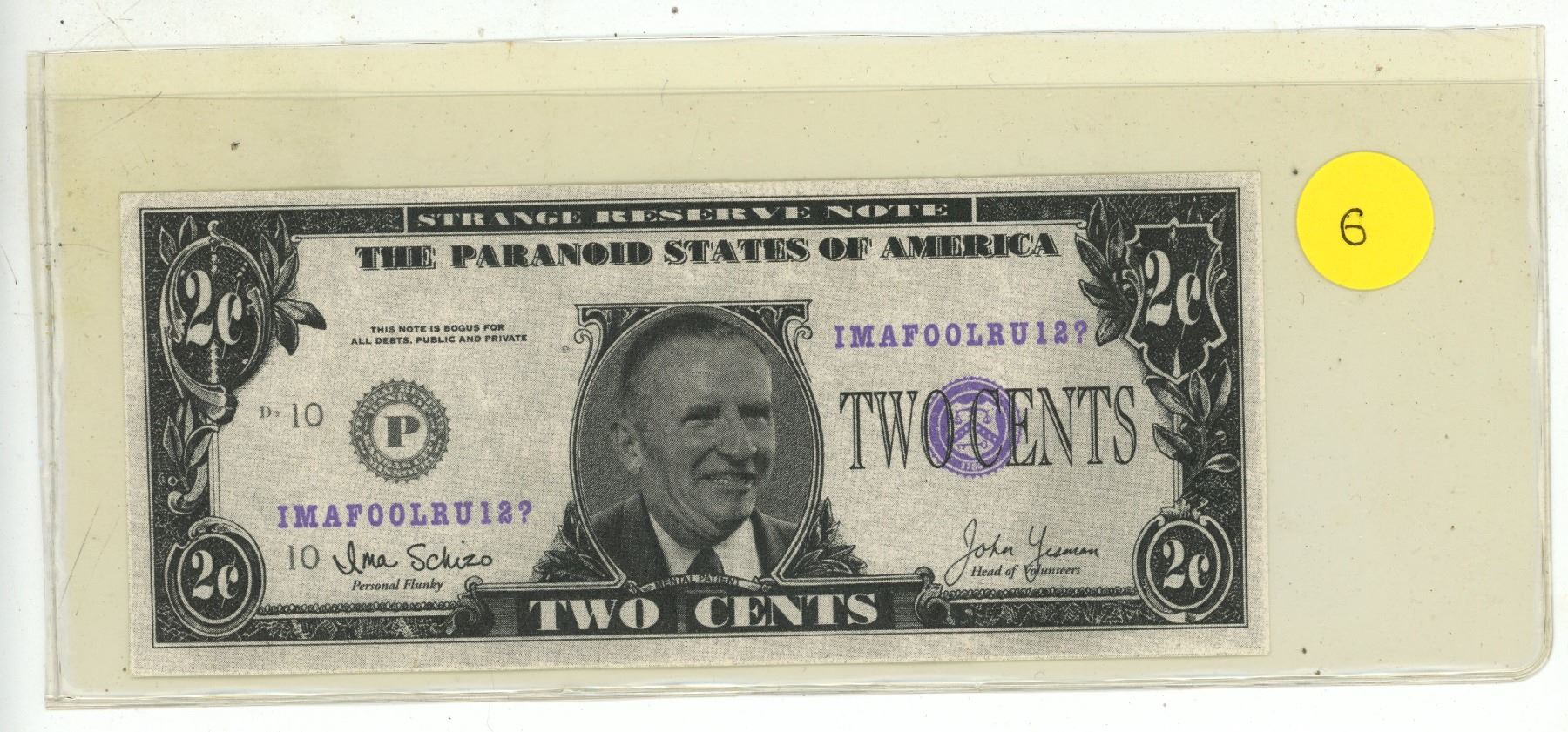 Strange Reserve Note. The Paranoid States of America 2 Cents. Serial Number IMAFOOLRU12? This is not a real note. Uncirculated.