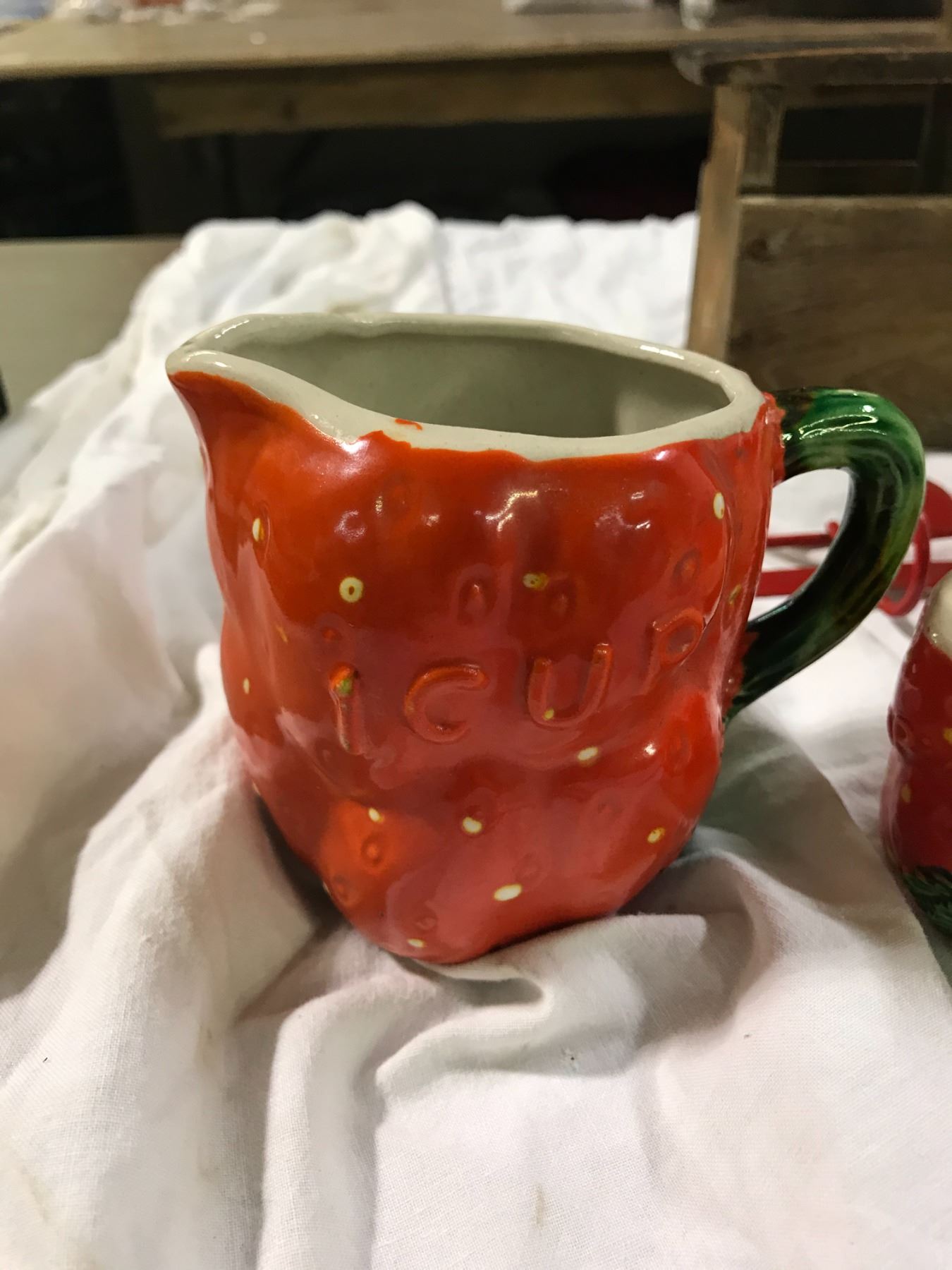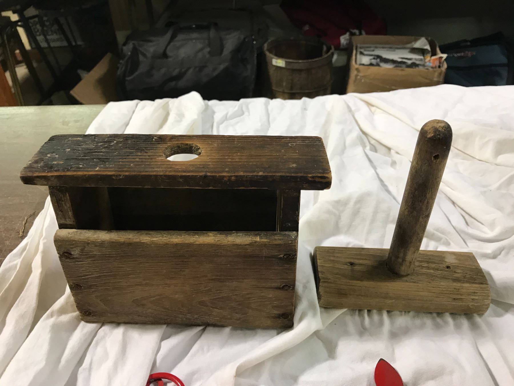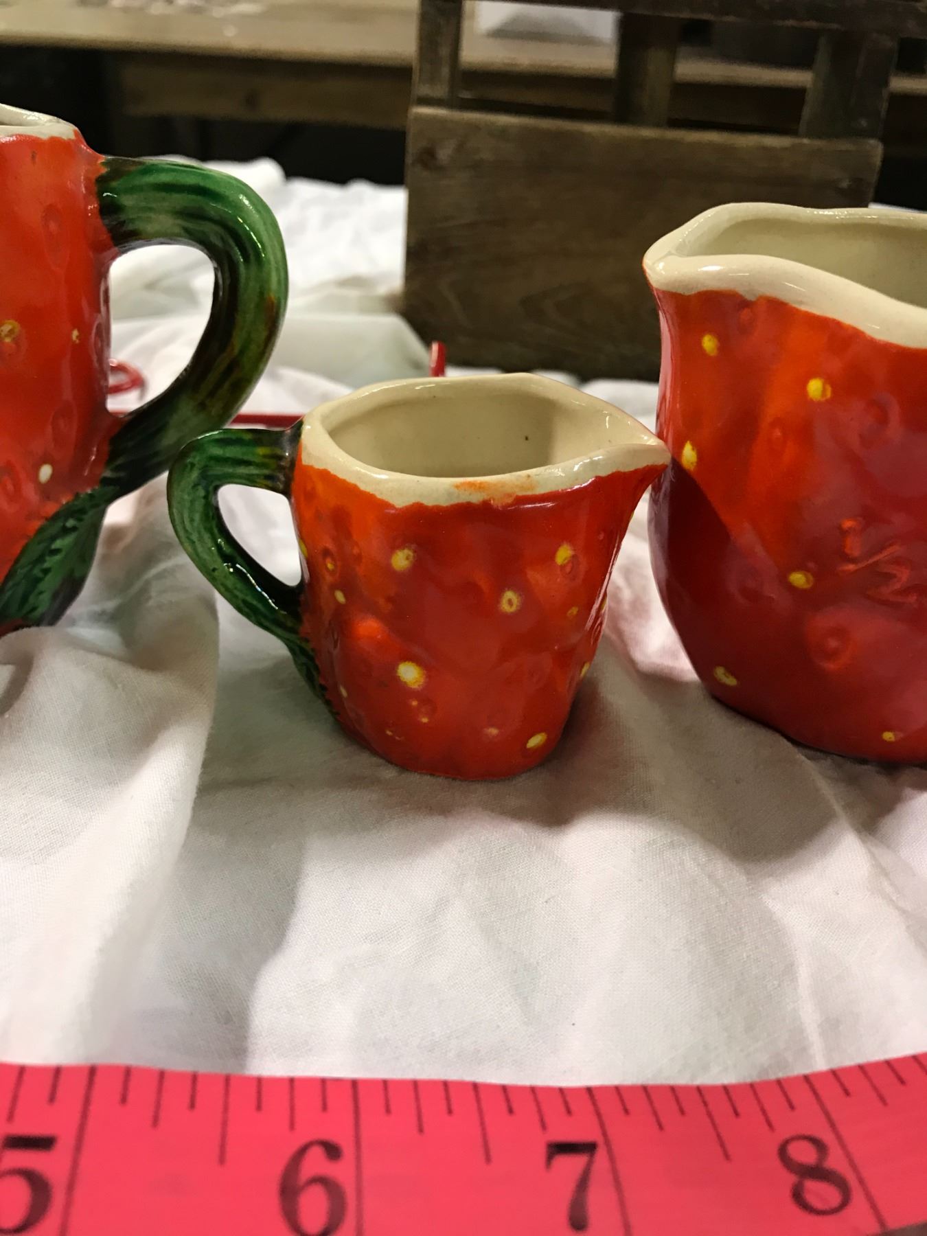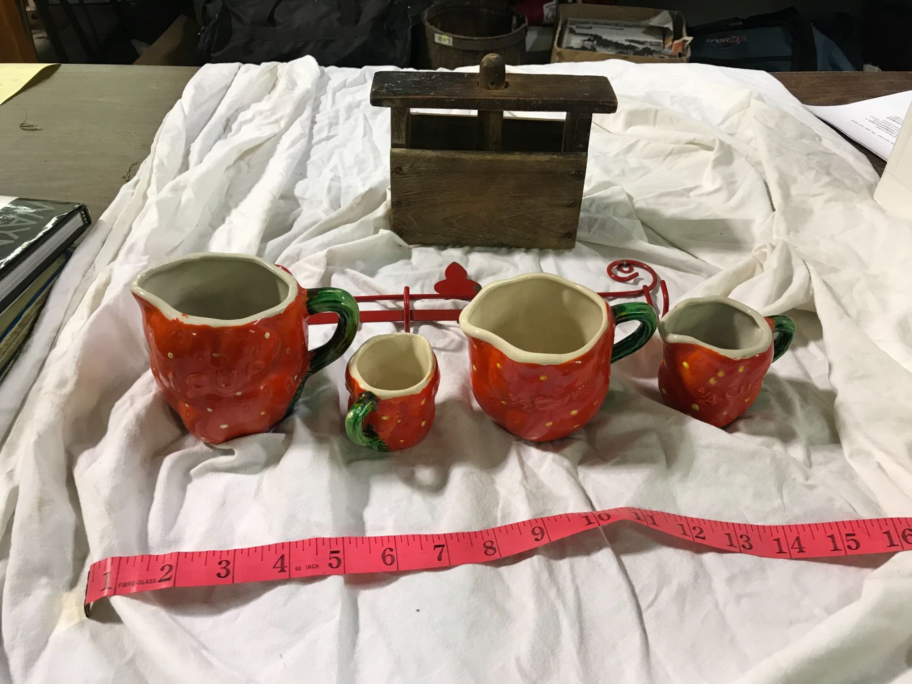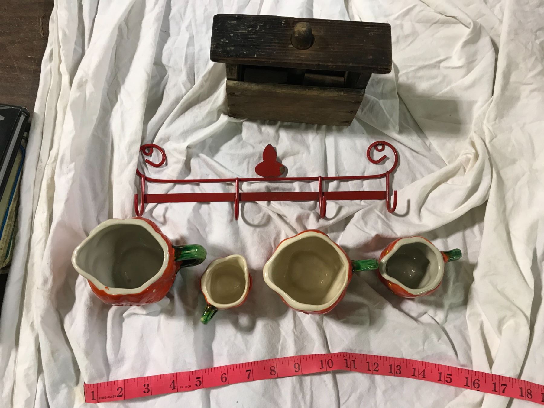 Strawberry measuring cups with metal hanger, and antique butter press