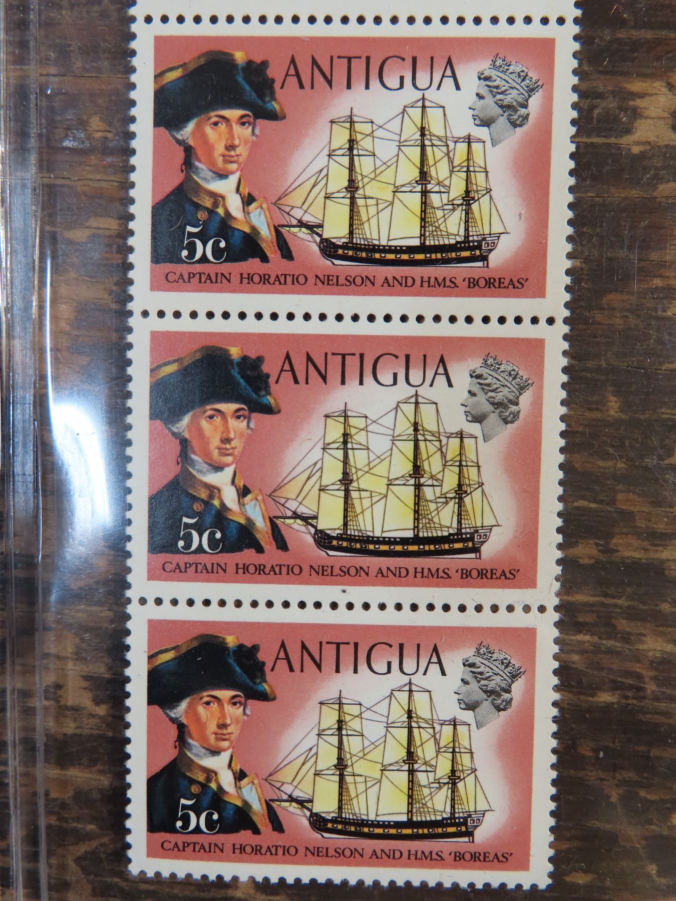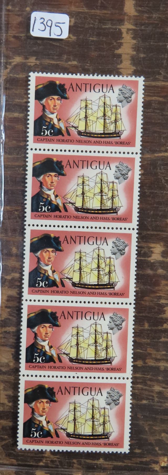 Strip of 5 Antigua 5 Cents Stamps depicting Captain Horatio Nelson & his ship Boreas. Mint.