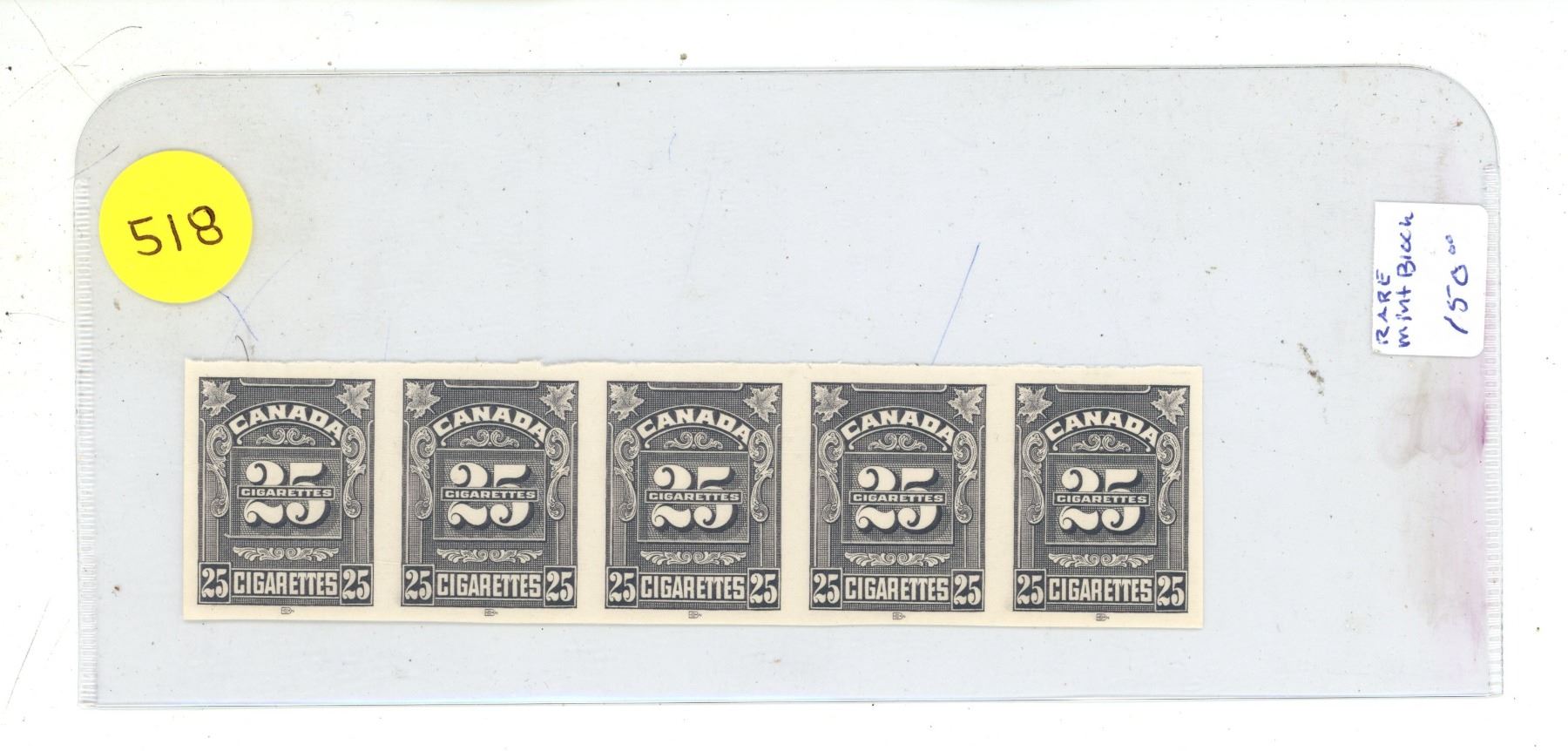 Strip of 5 Canada Cigarette Tax Stamps. Scarce.