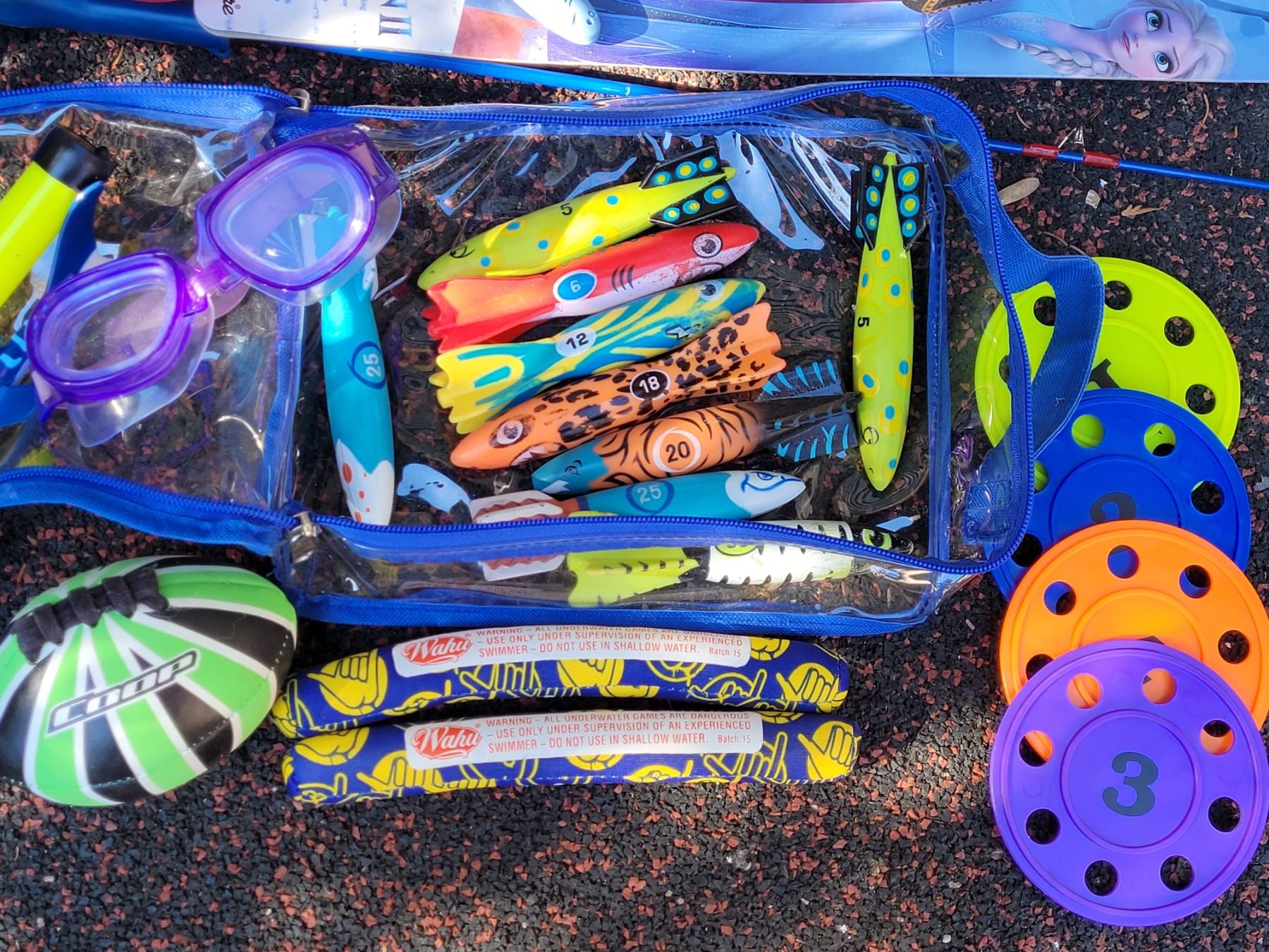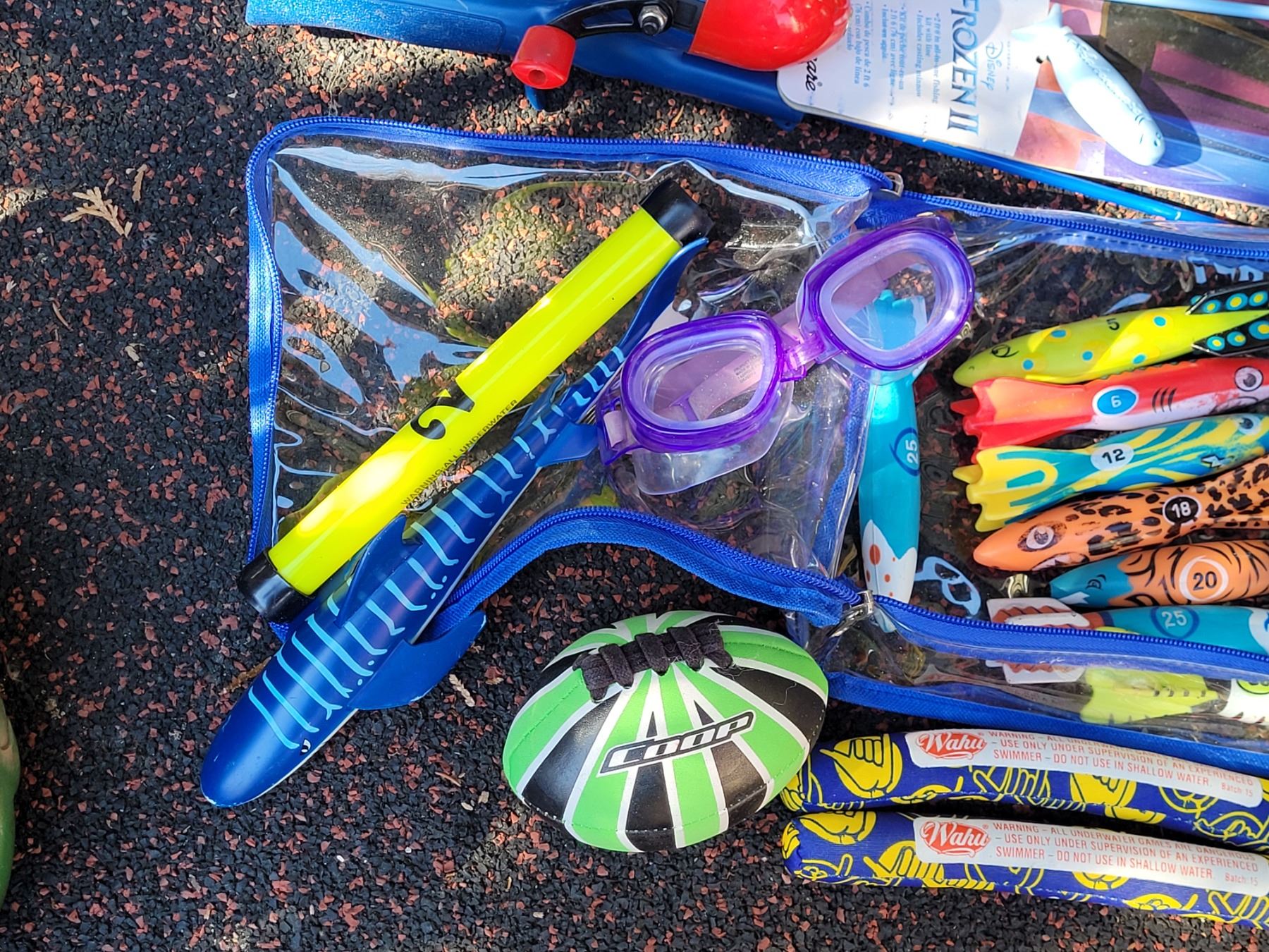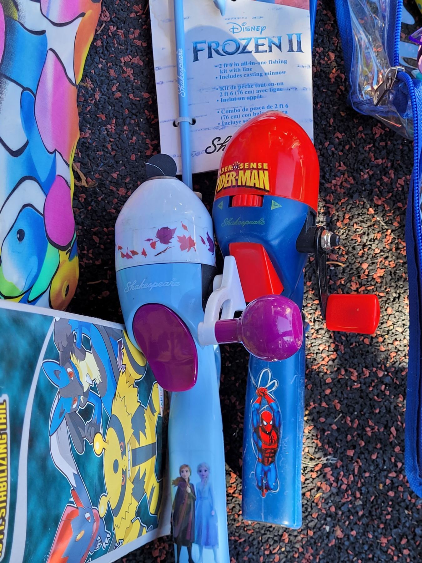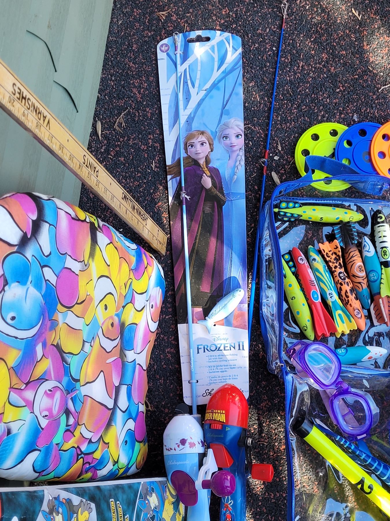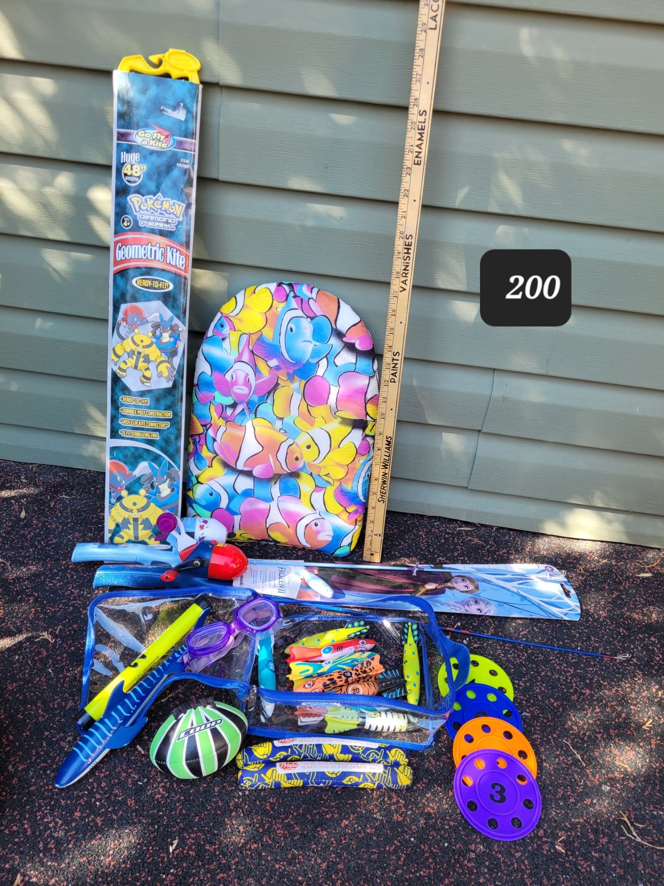 Summer activity lot. Fishing rods, diving toys, Pokémon kite & float board.