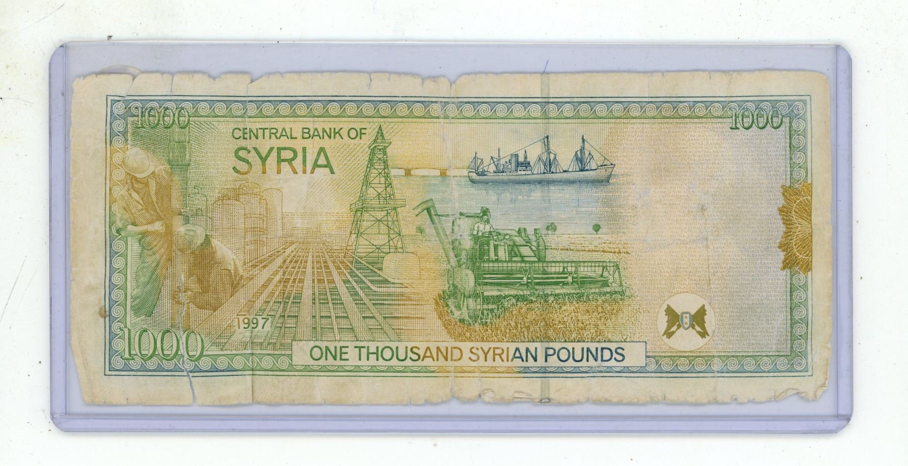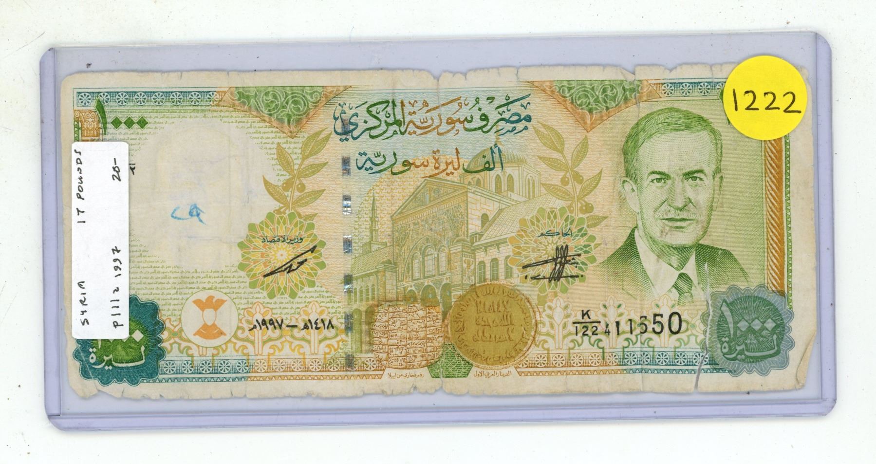 Syria. 1997 1000 Syrian Pounds. President Assad. Good with tears and pieces missing.