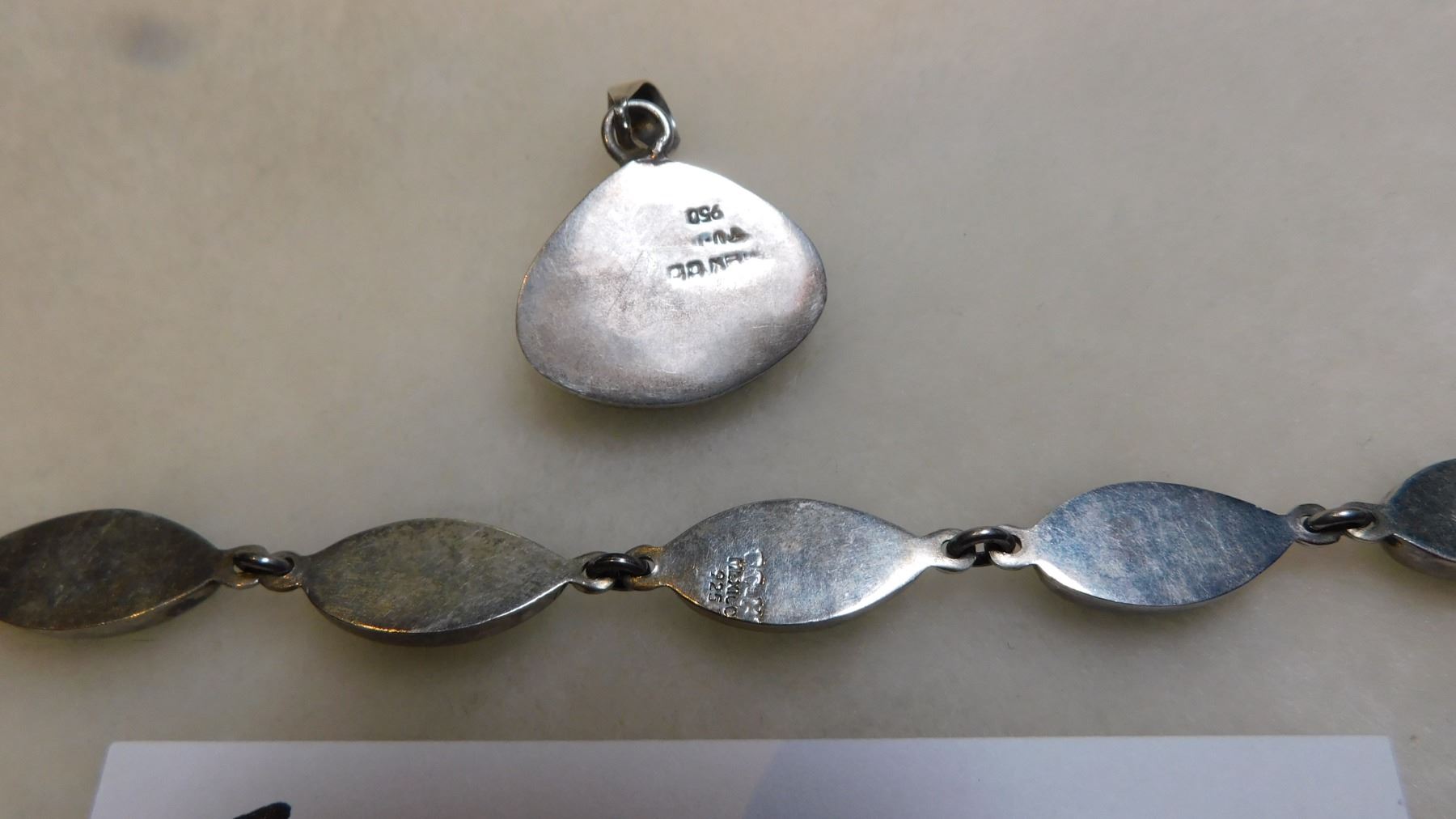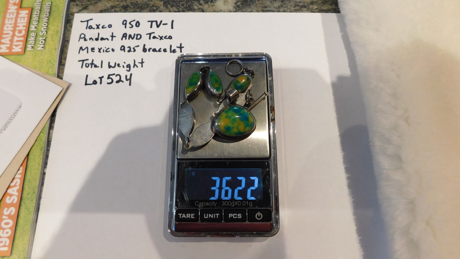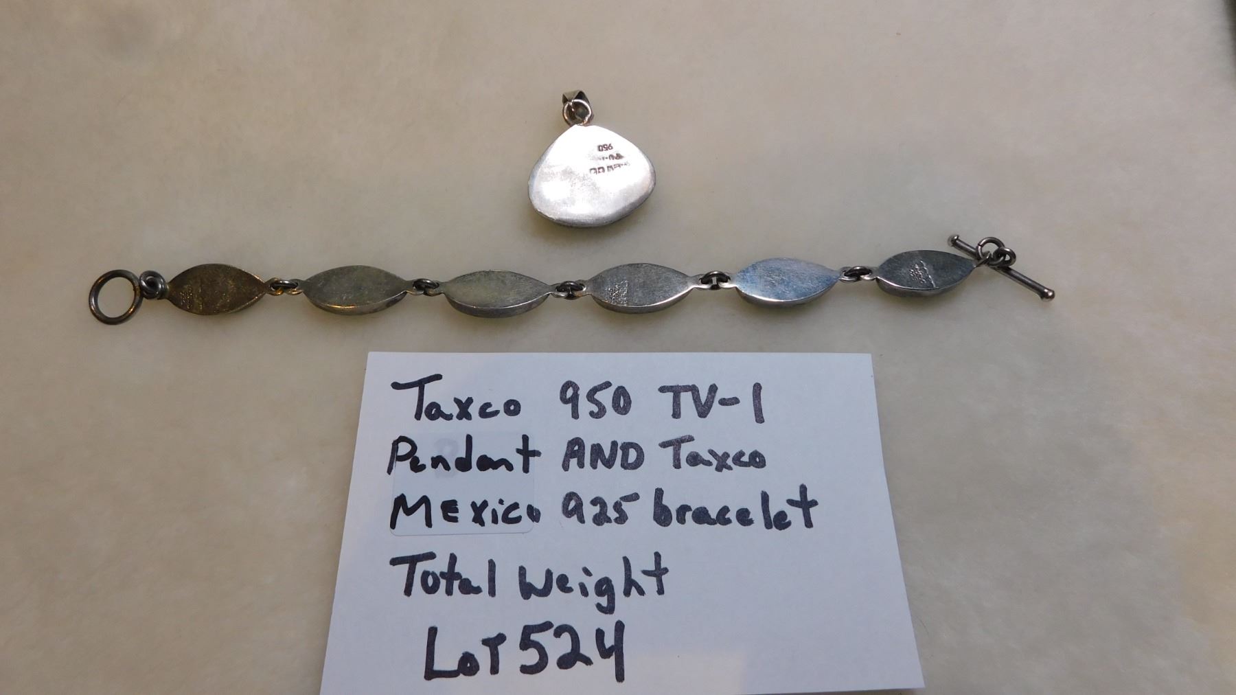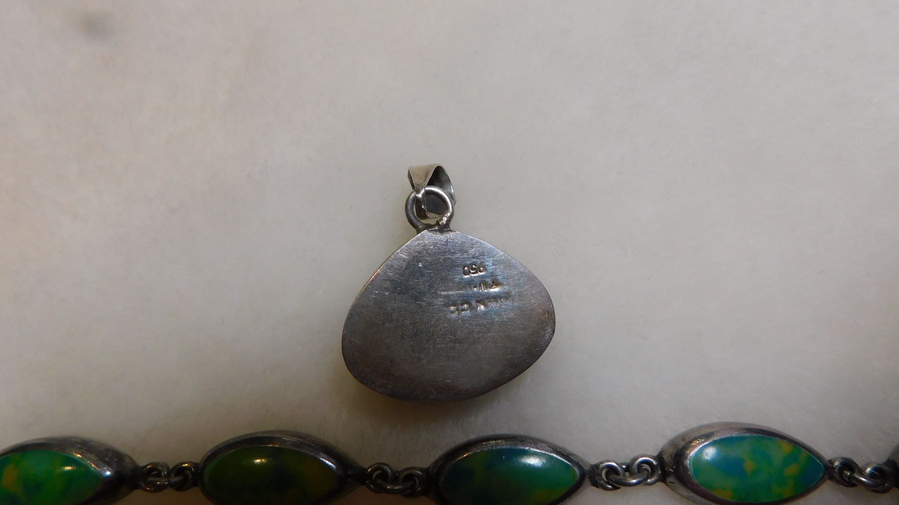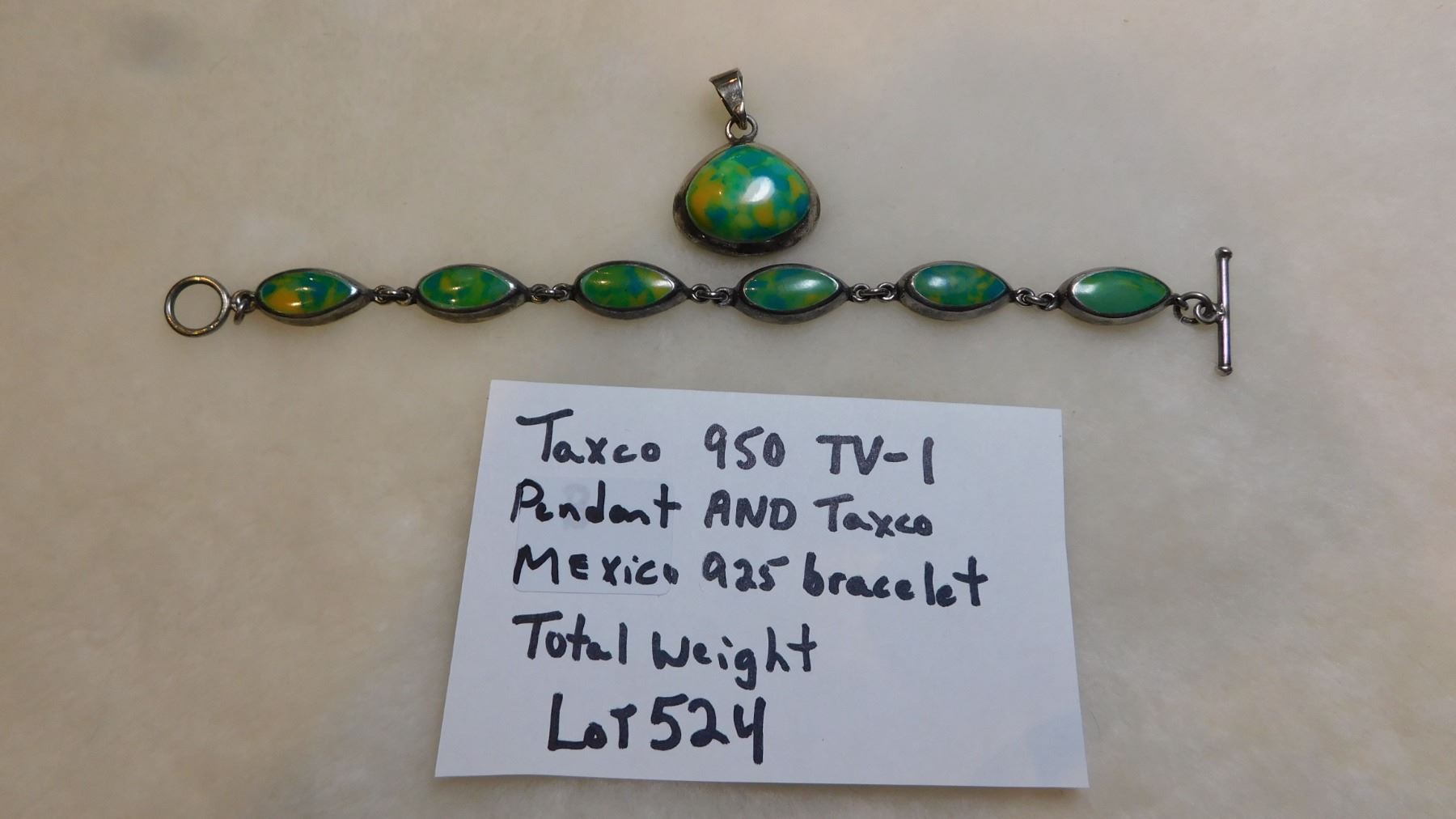 TAXCO SIGNED PENDANT AND 925 BRACELET, GREEN AND YELLOW STONE