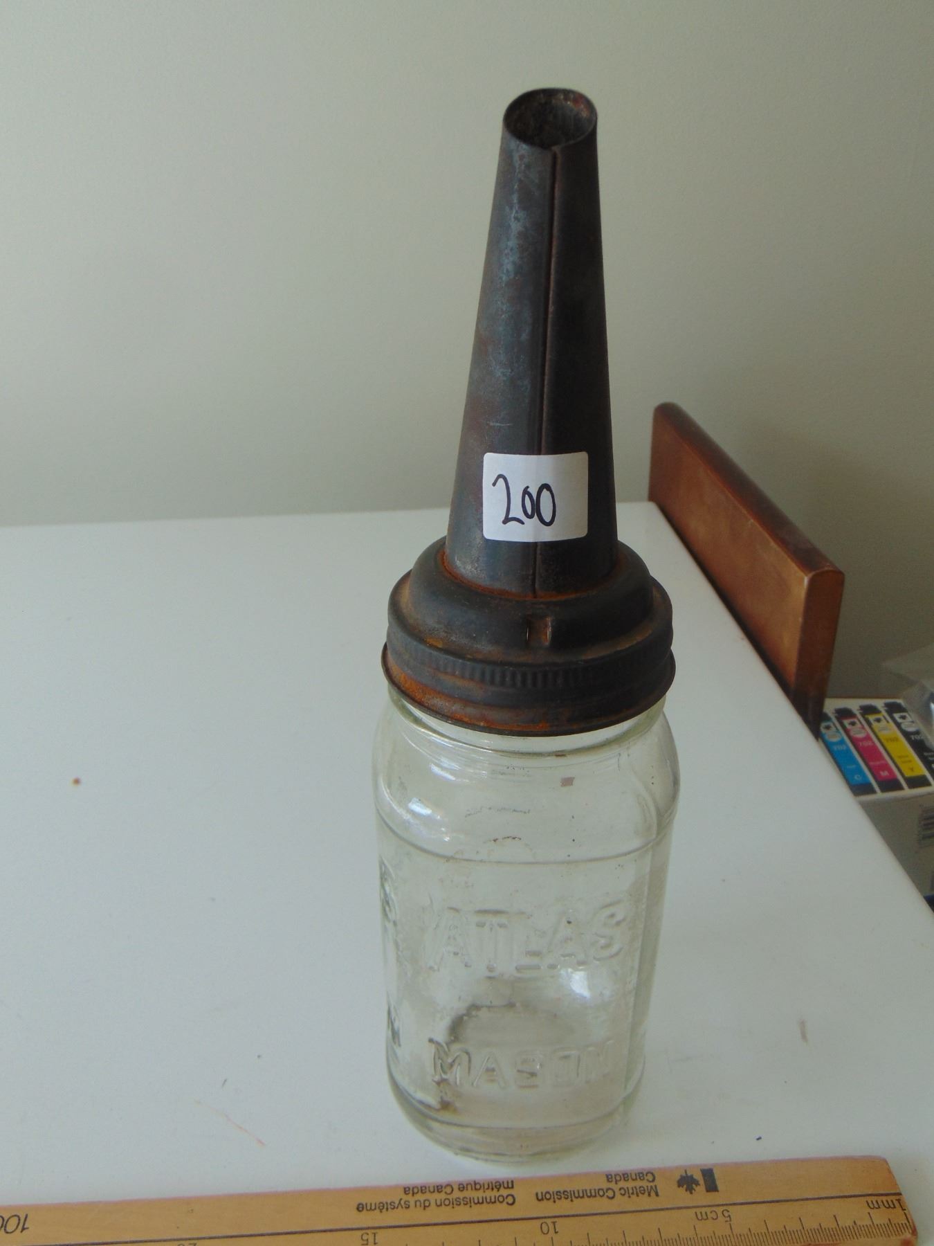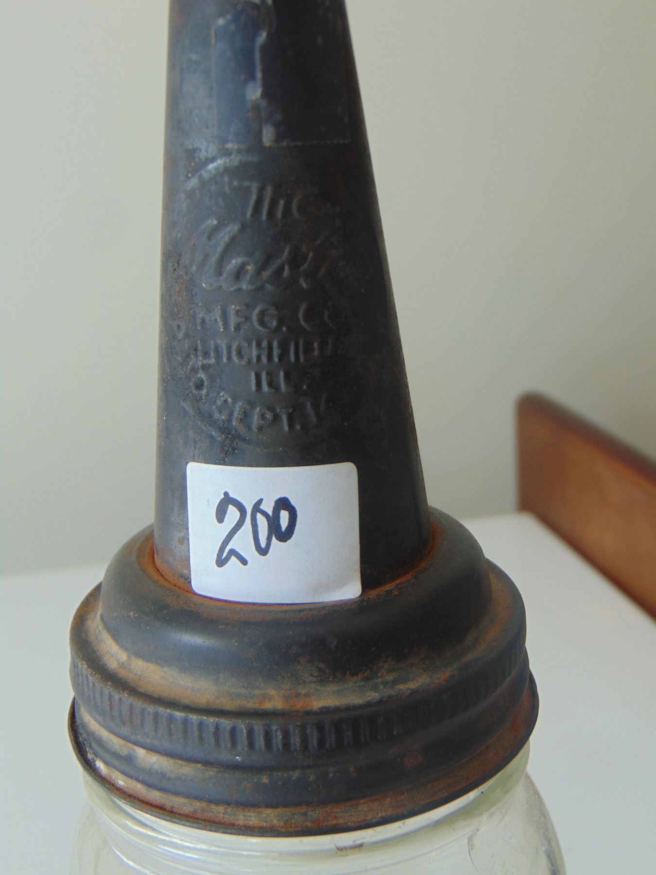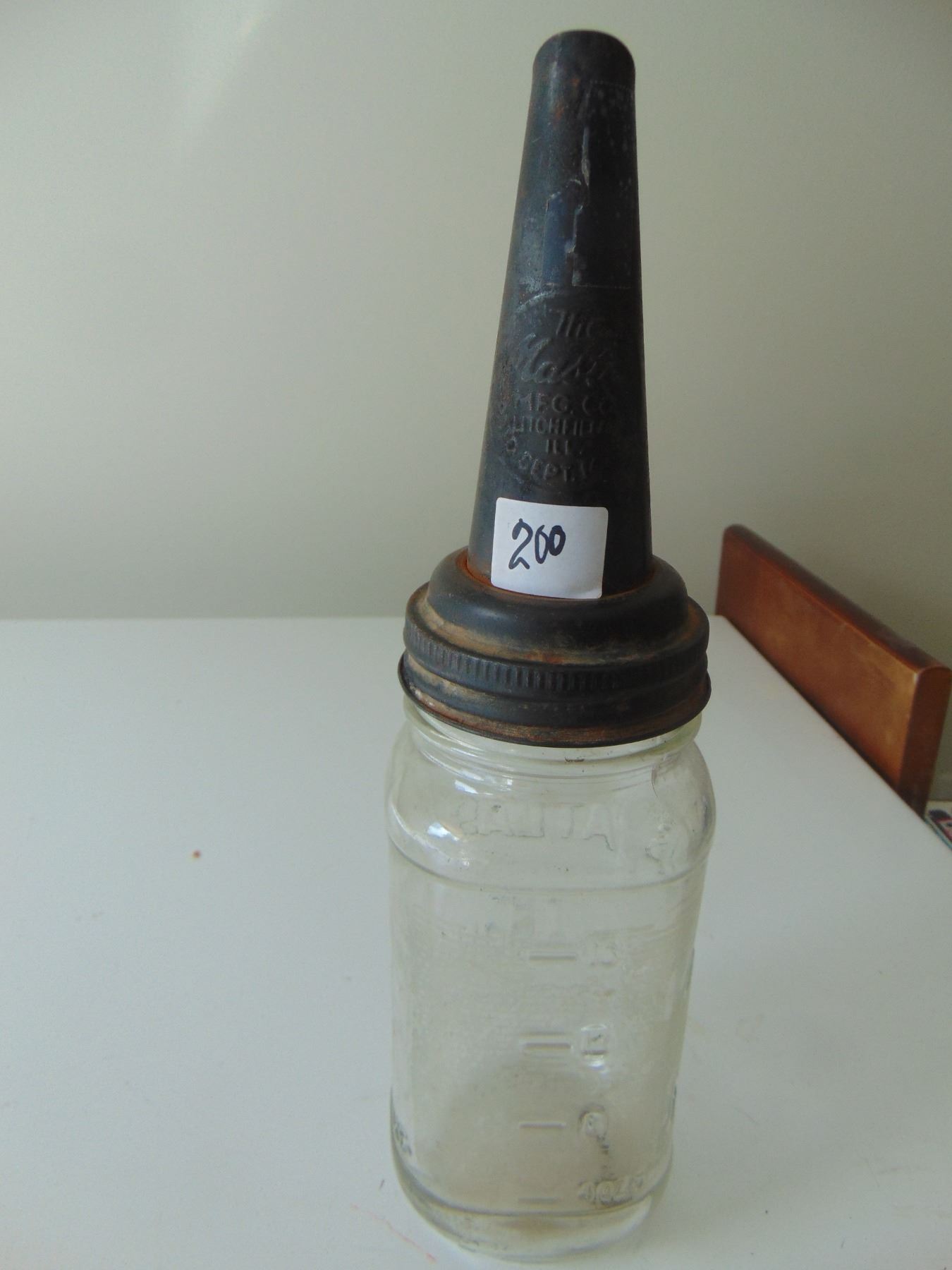 THE MASTER MFG CO. OIL SPOUT ON MASON JAR VINTAGE PAT. 1926