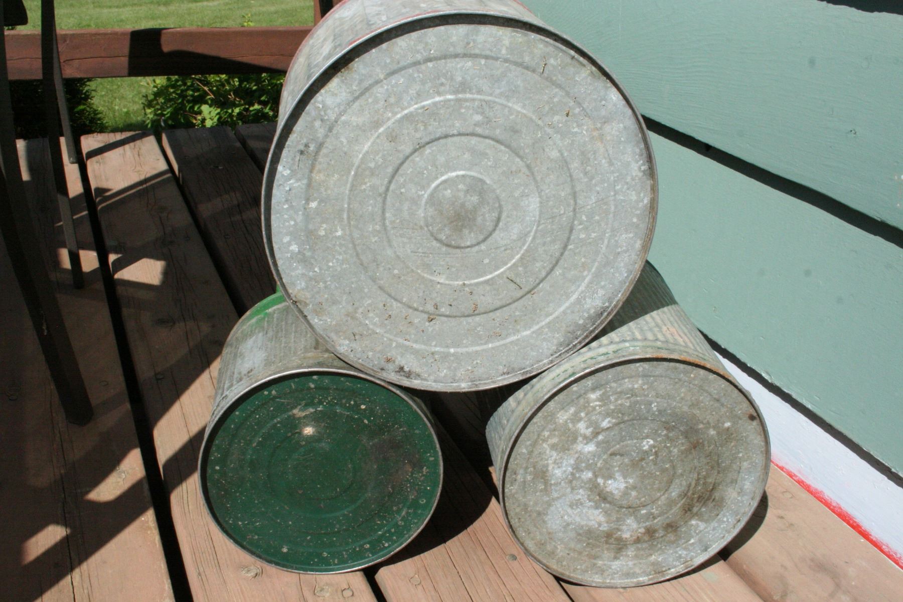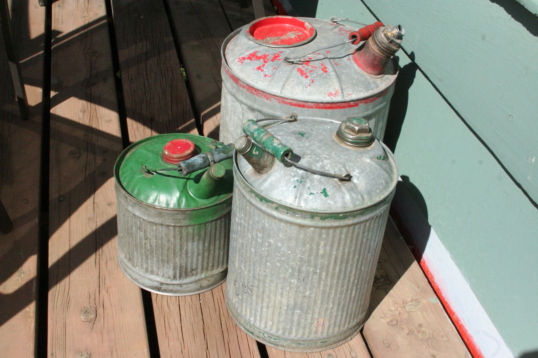 THREE DEFFERENT SIZE ANTIQUE GALVANIZED GAS CANS