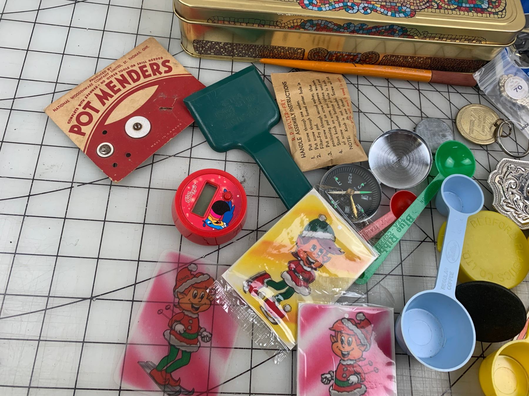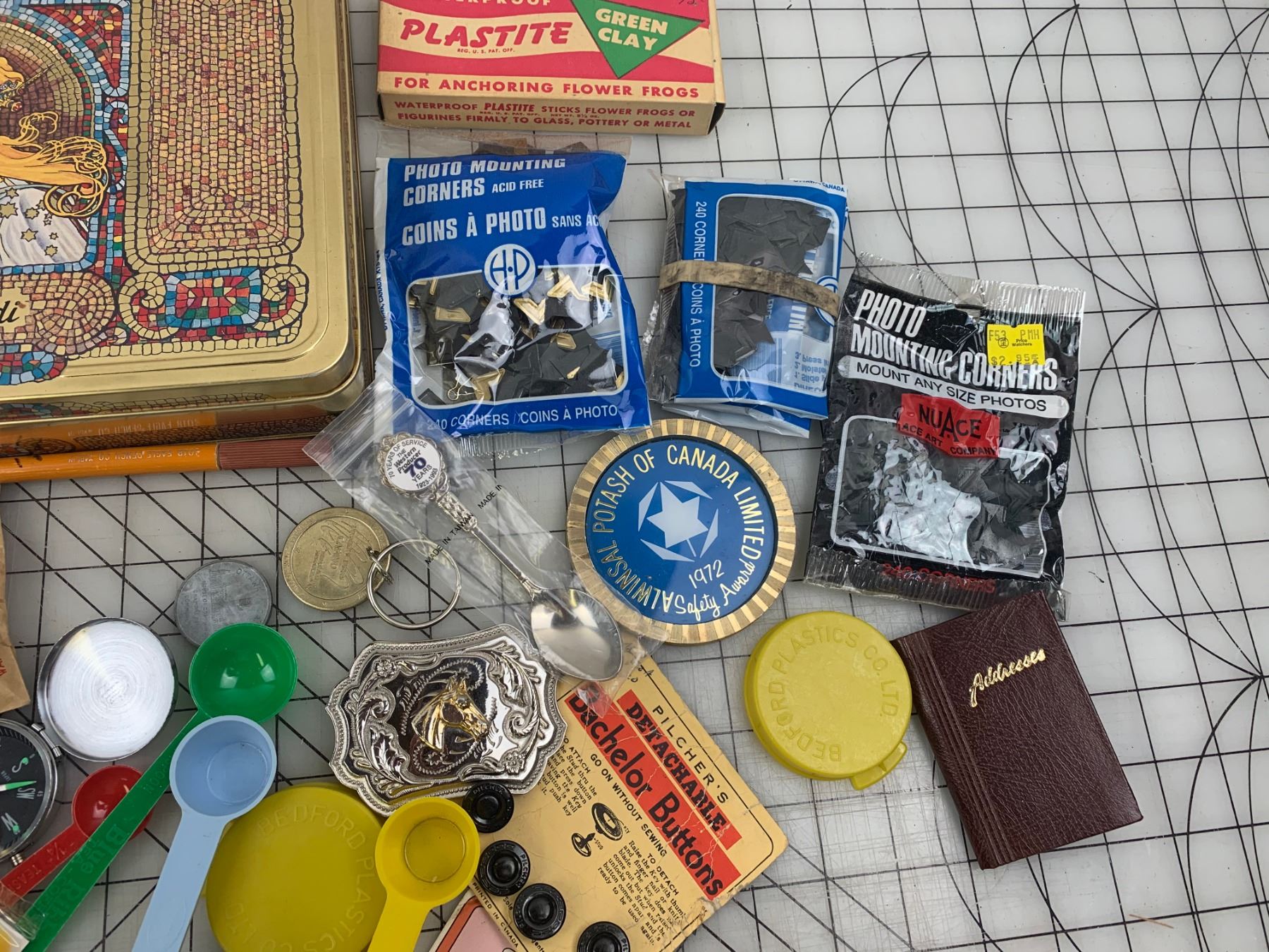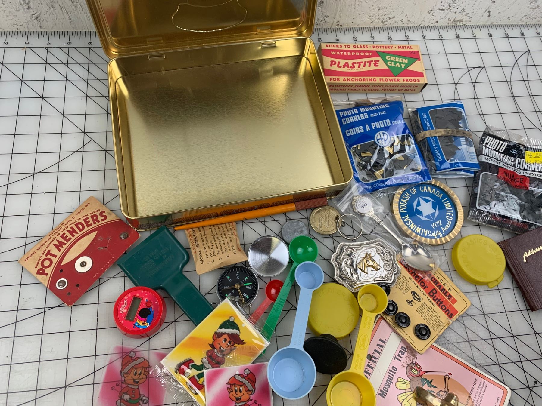 TIN WITH MISC SMALLS BELT BUCKLE COMPASS ETC