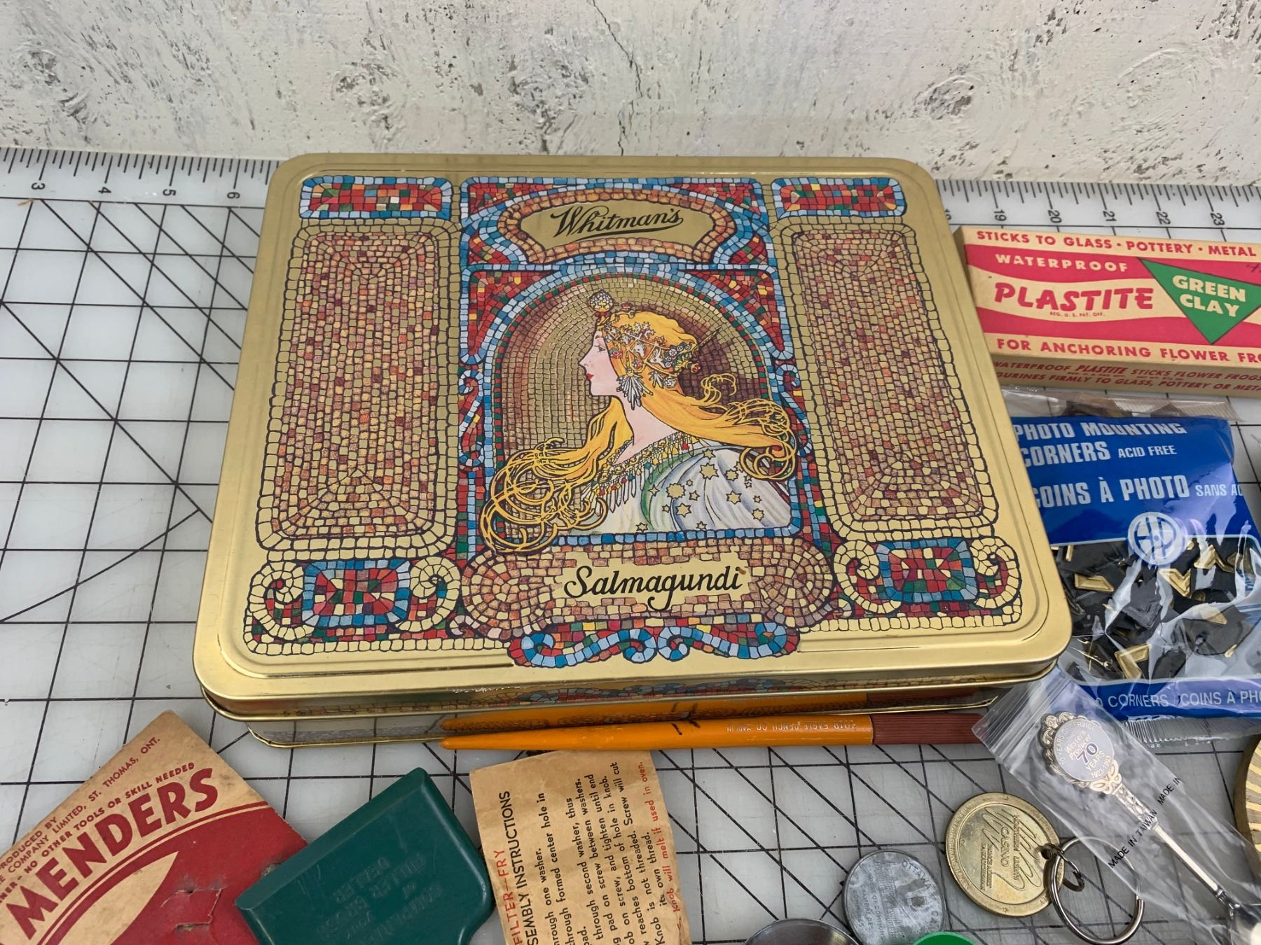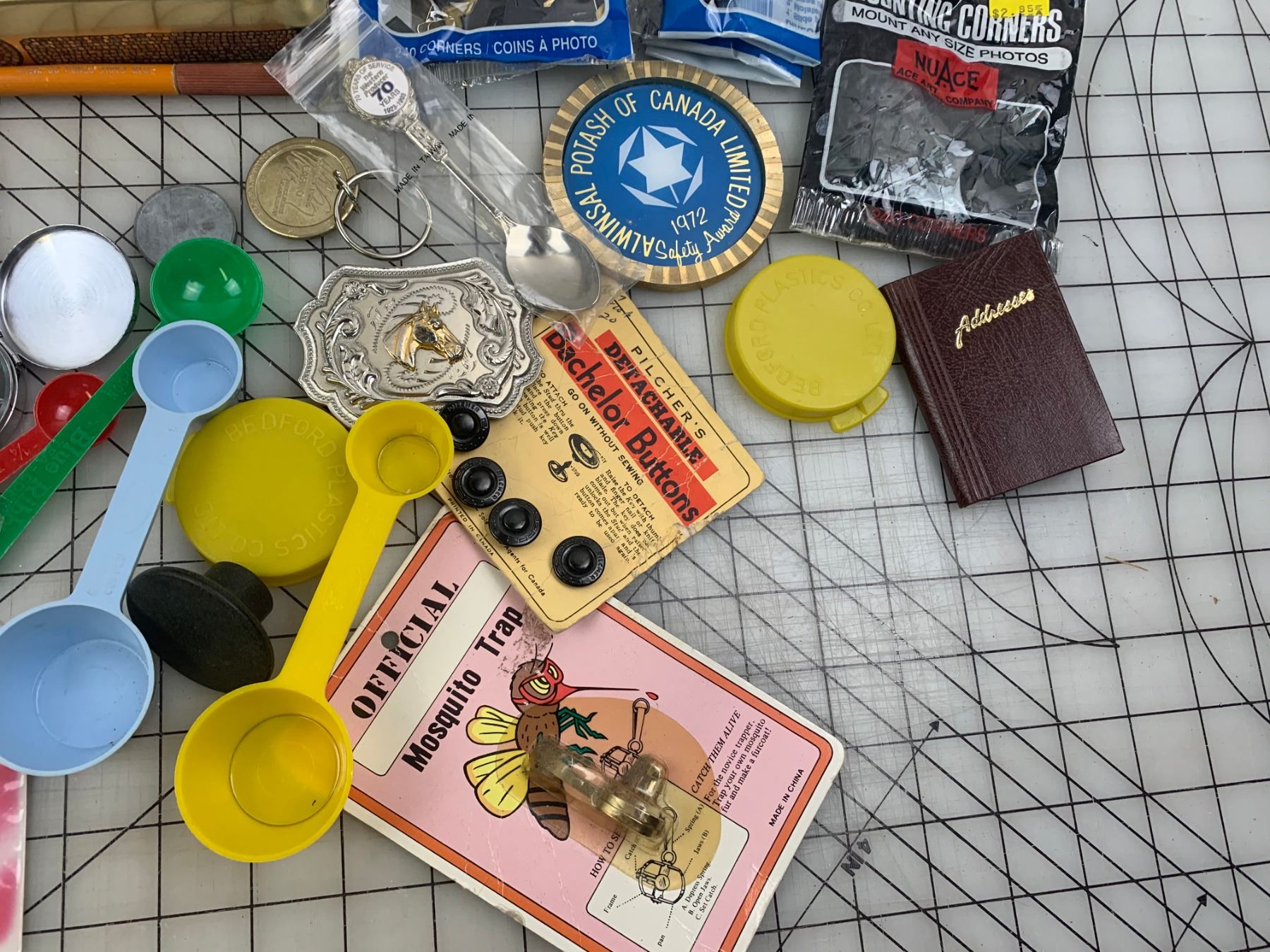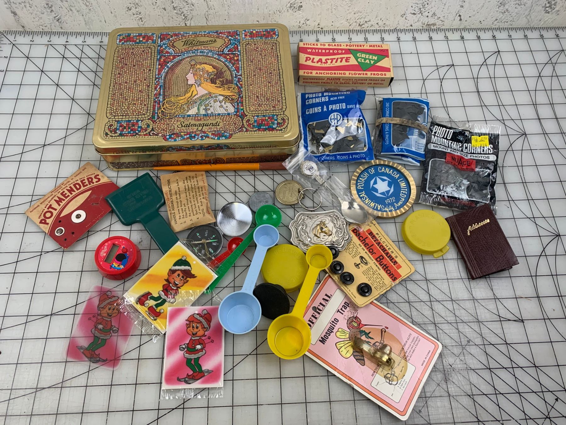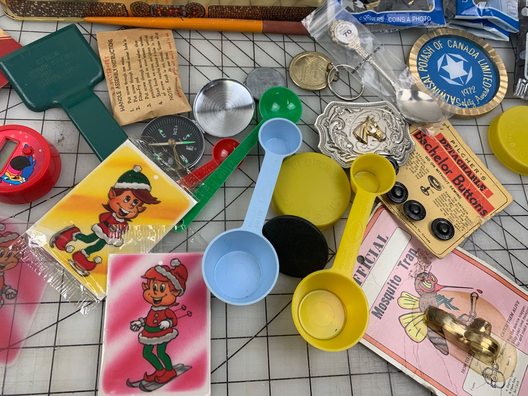TIN WITH MISC SMALLS BELT BUCKLE COMPASS ETC