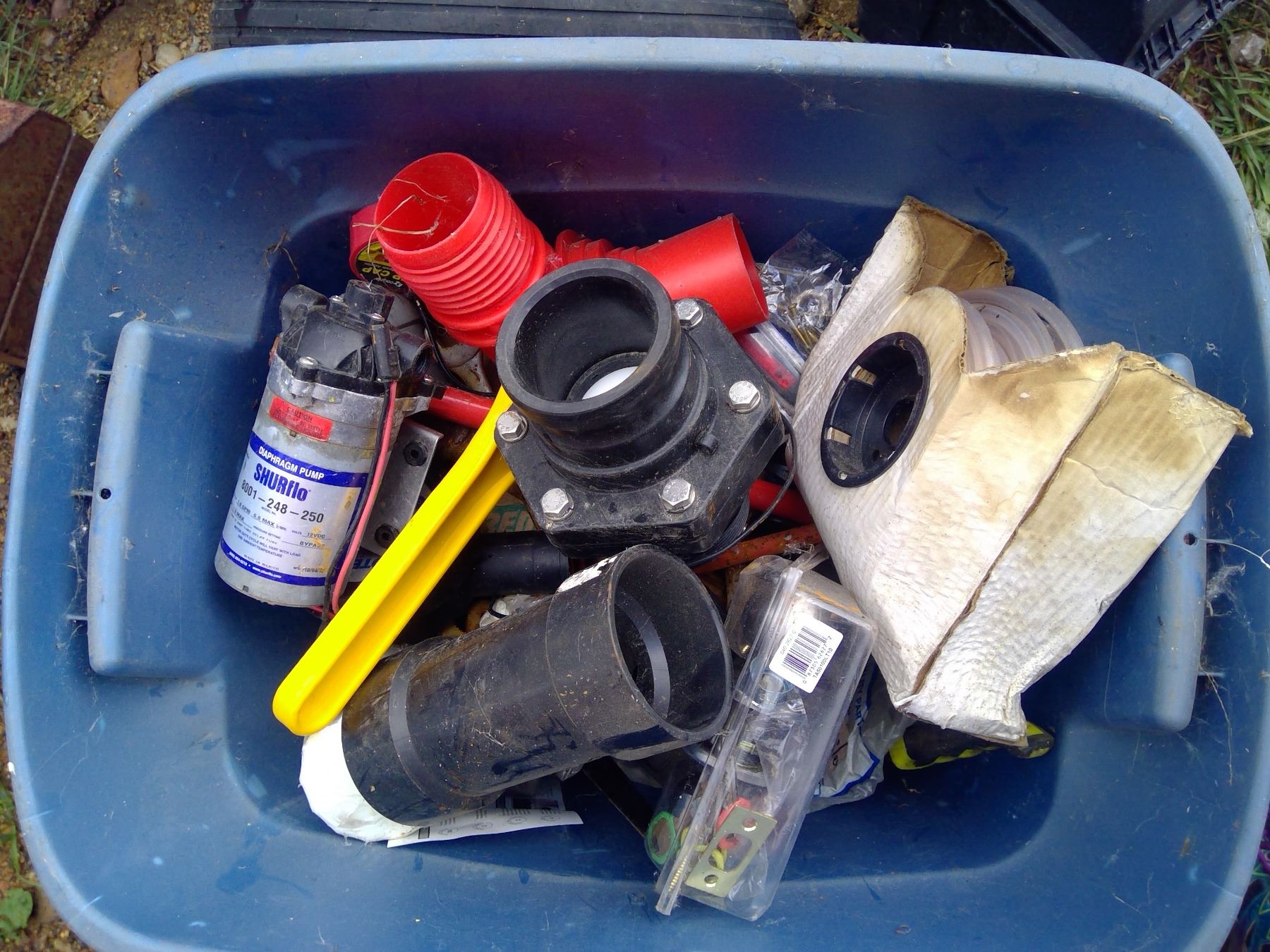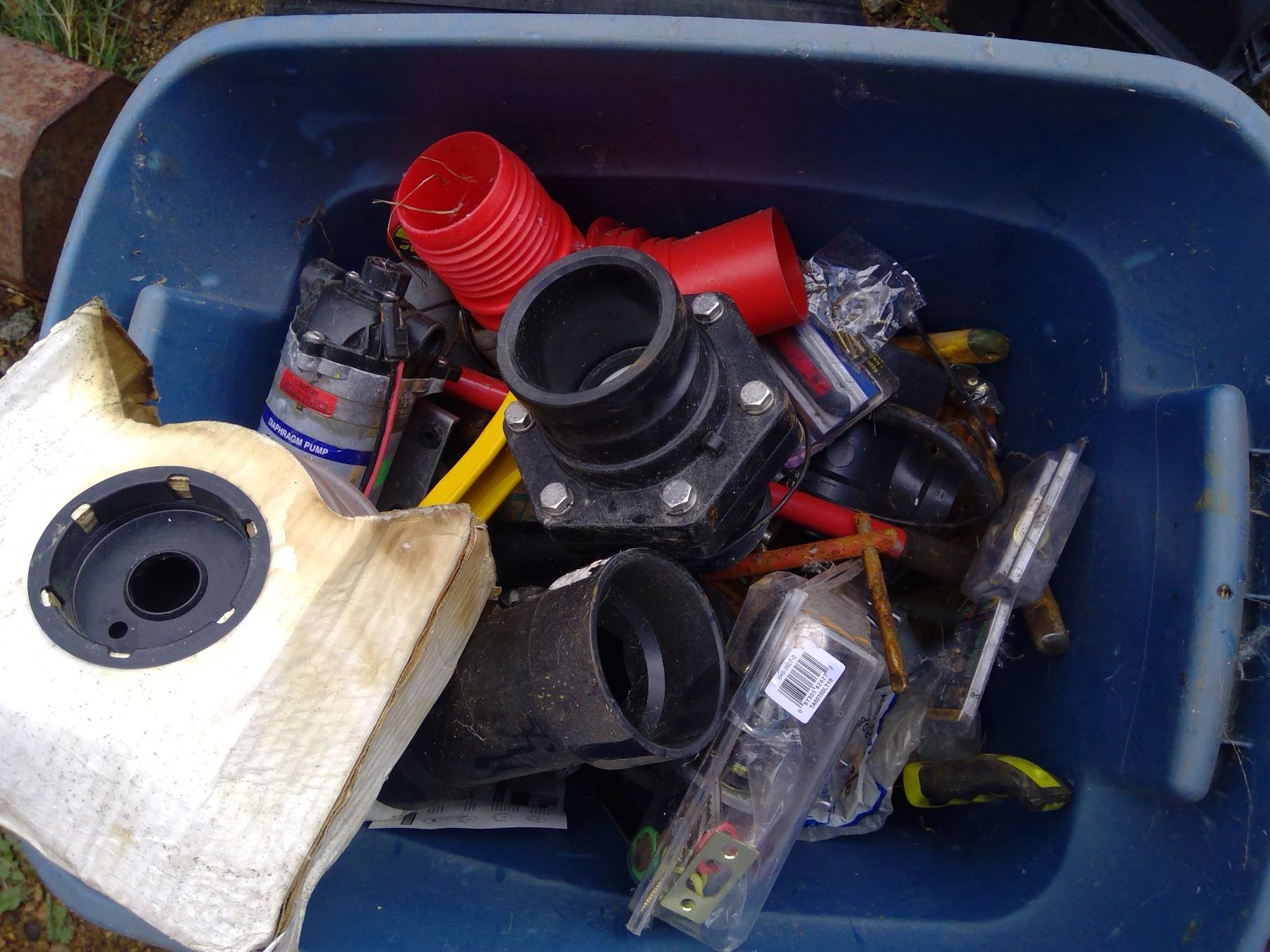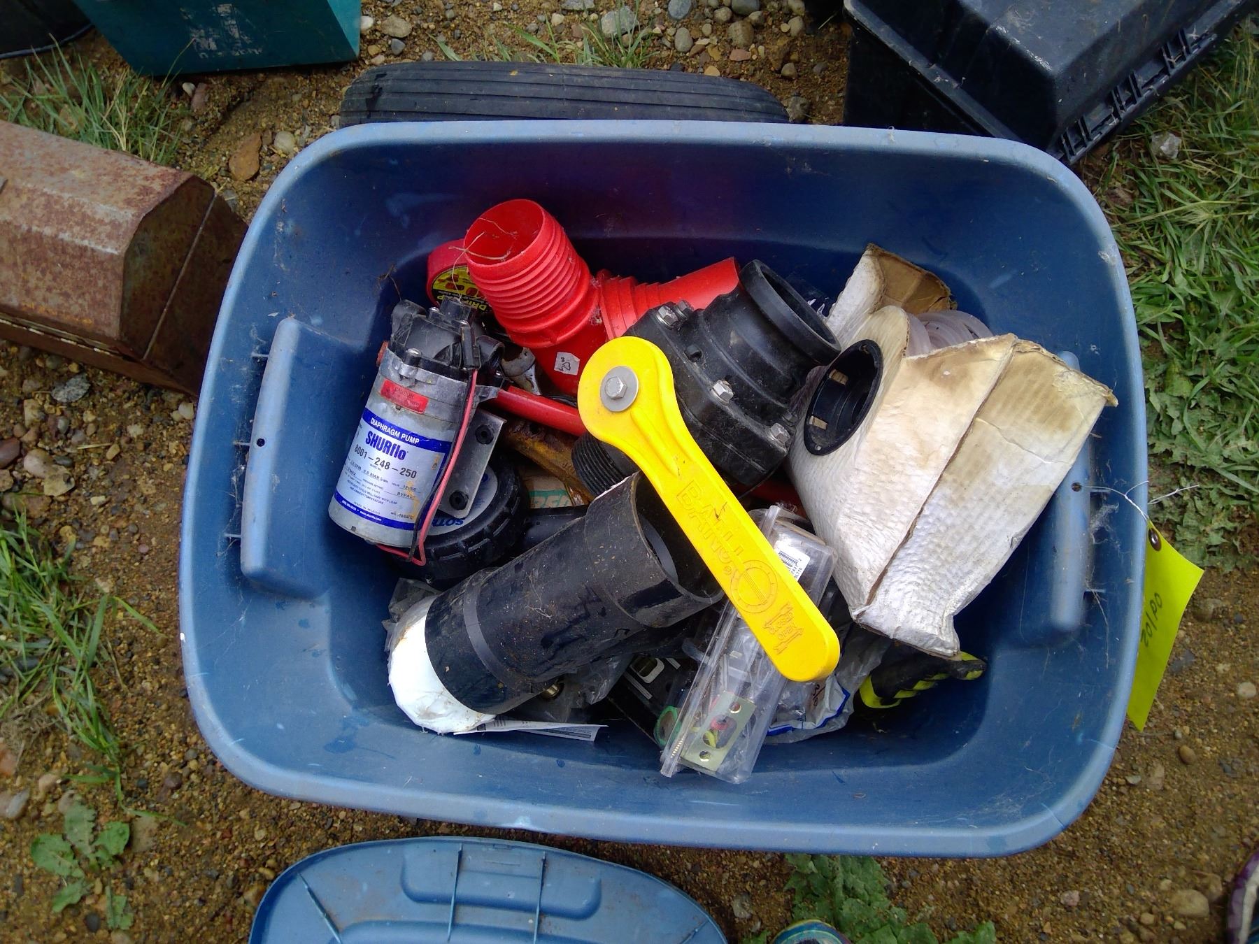 TOTE OF PLUMBING ITEMS, BALL VALVE, FITTINGS, PUMP, ECT.