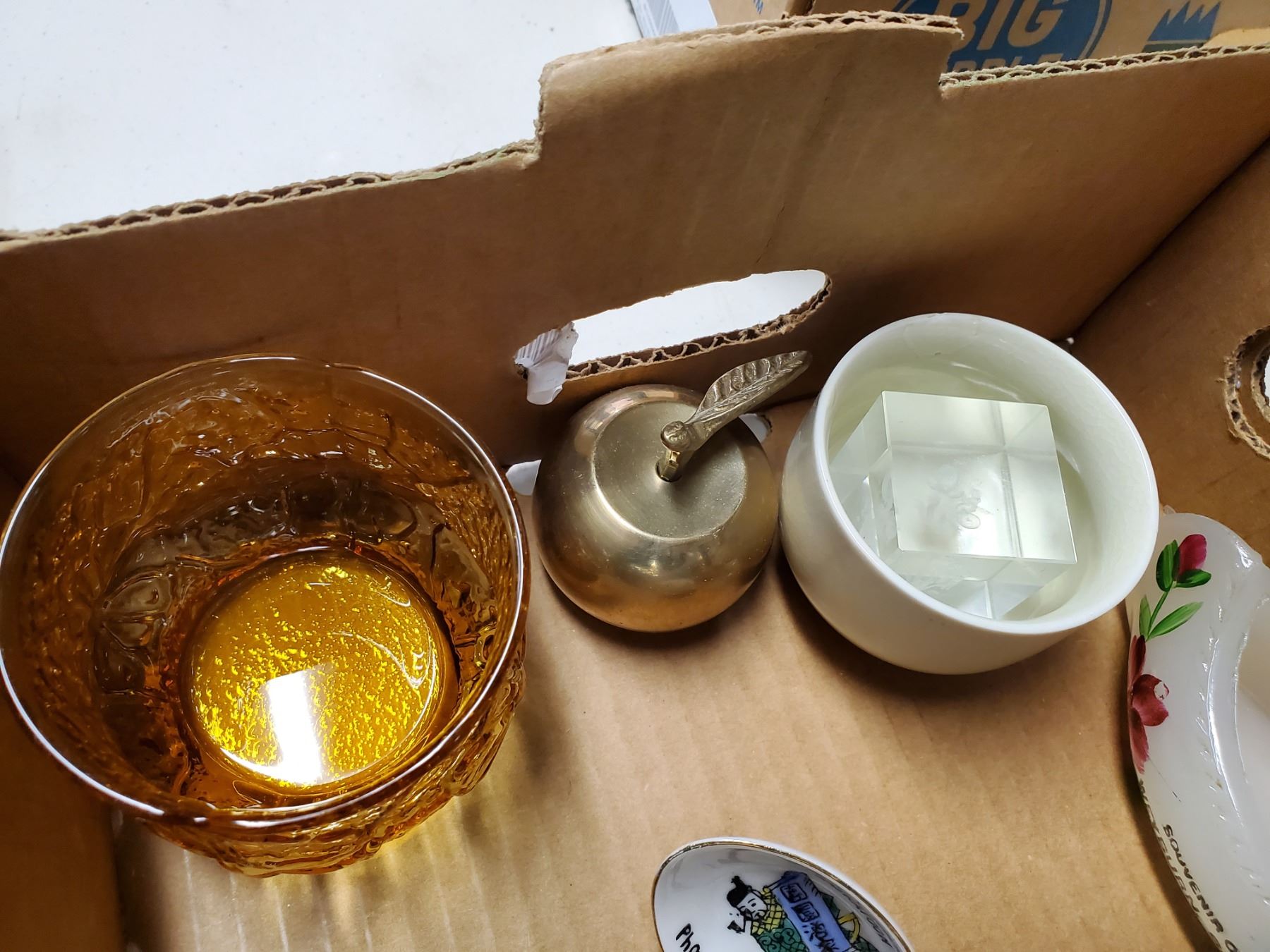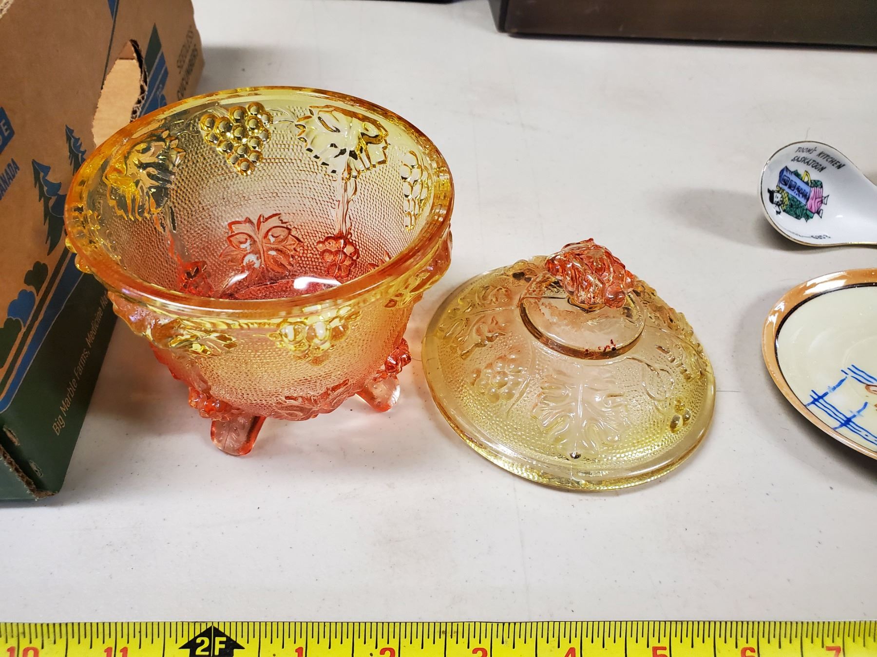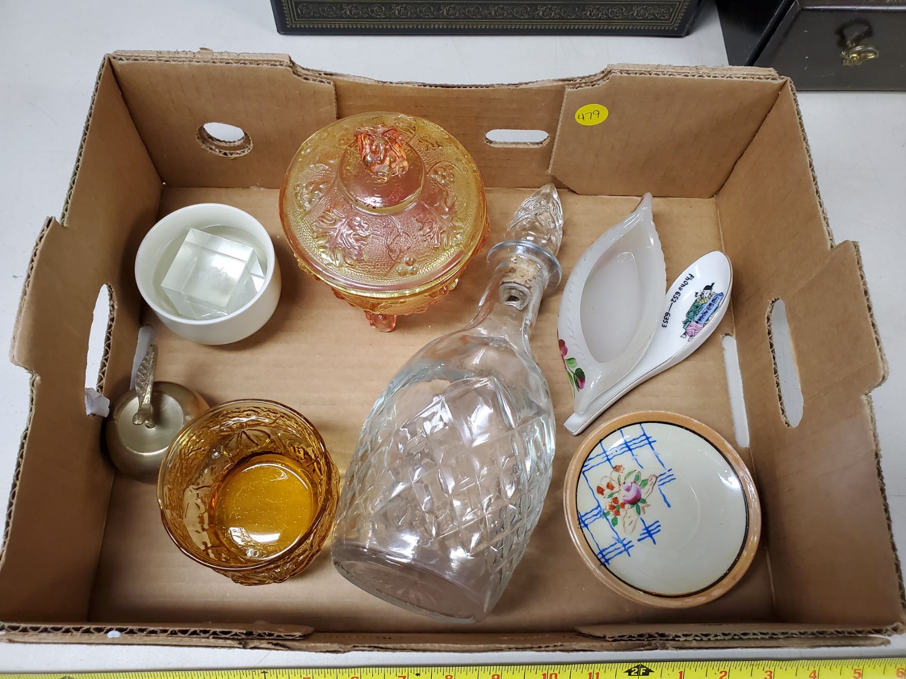 TRAY LOT OF GLASSWARE (CANDY DISH W/ LID, DECANTER, ETC)
