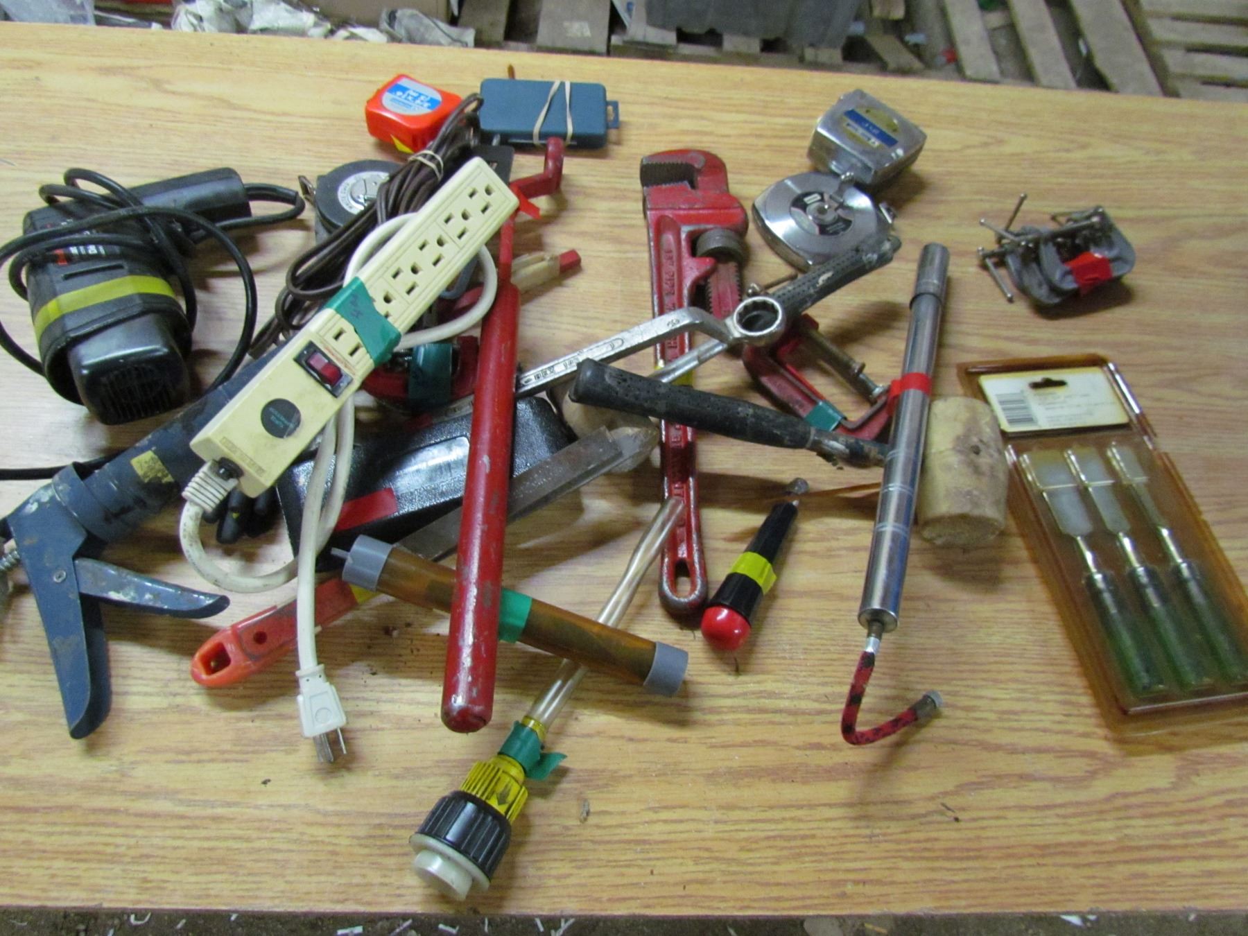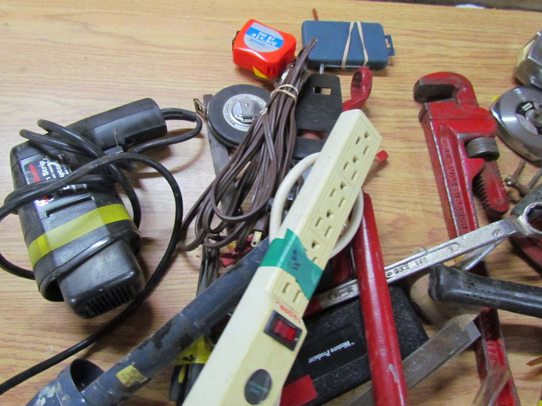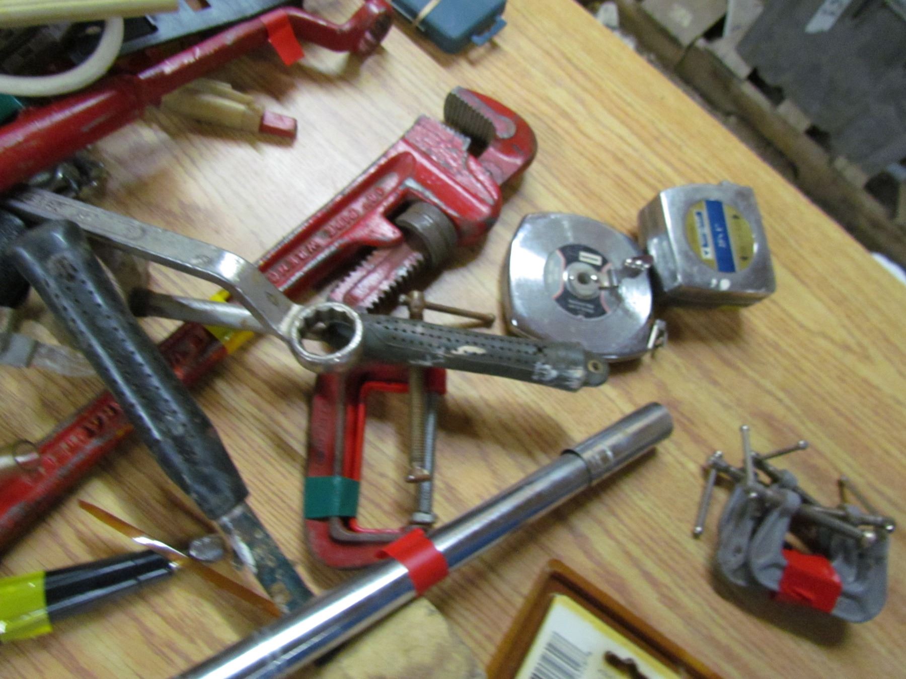 TUB LOT INCLUDING A TAPE MEASURE, FILES, CLAMPS, PIPE WRENCH AND HAMMER
