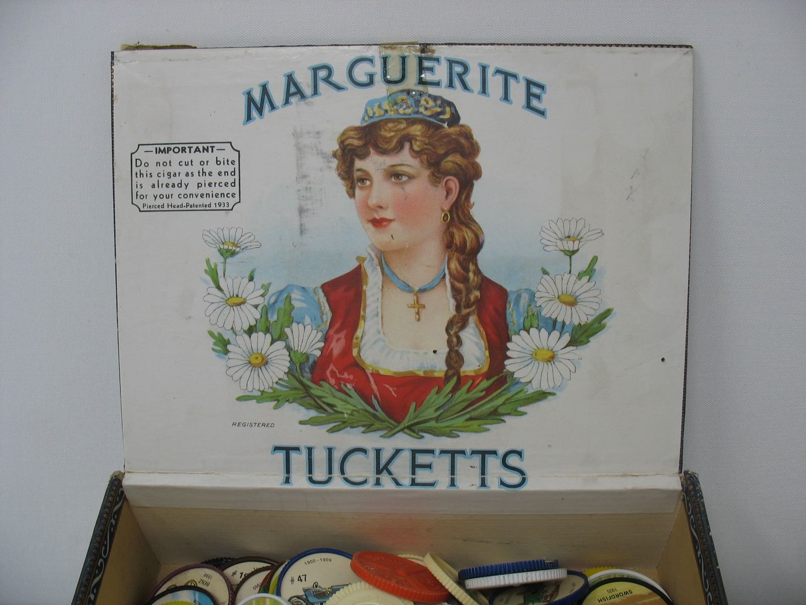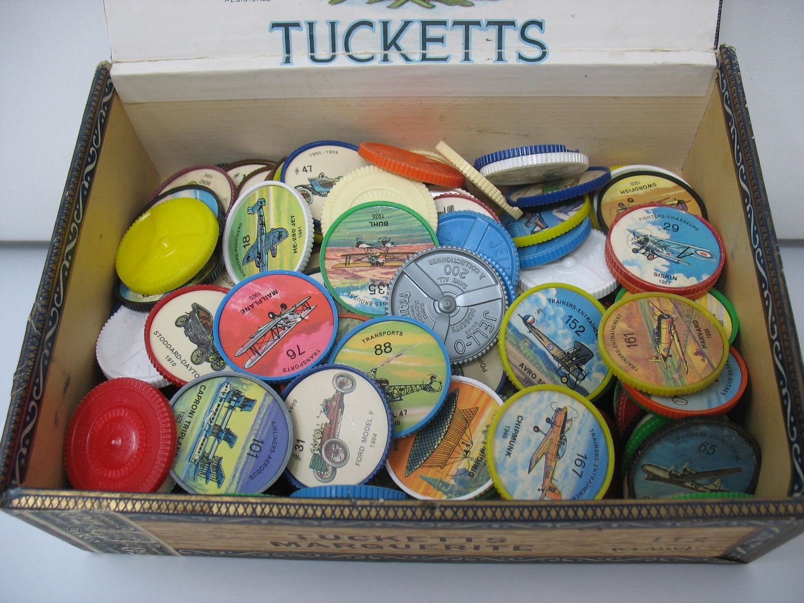 TUCKETTS CIGAR BOX WITH JELLO CAR & AIRPLANE COINS (124 COINS)