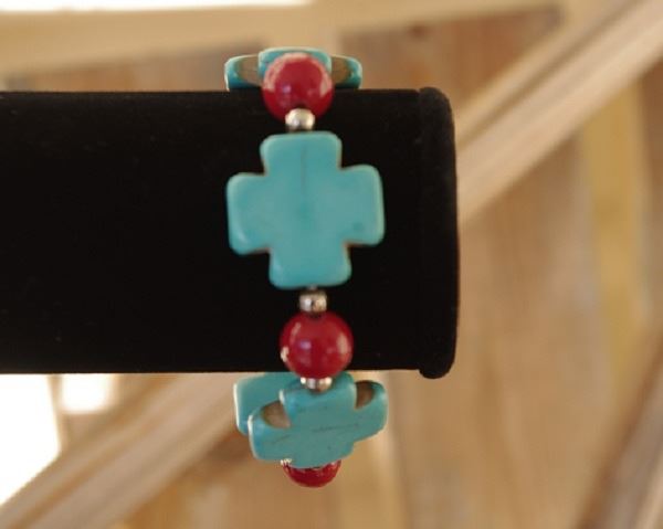 TURQOISE STONE STRETCH BRACELET/RED BEAD ACCENT