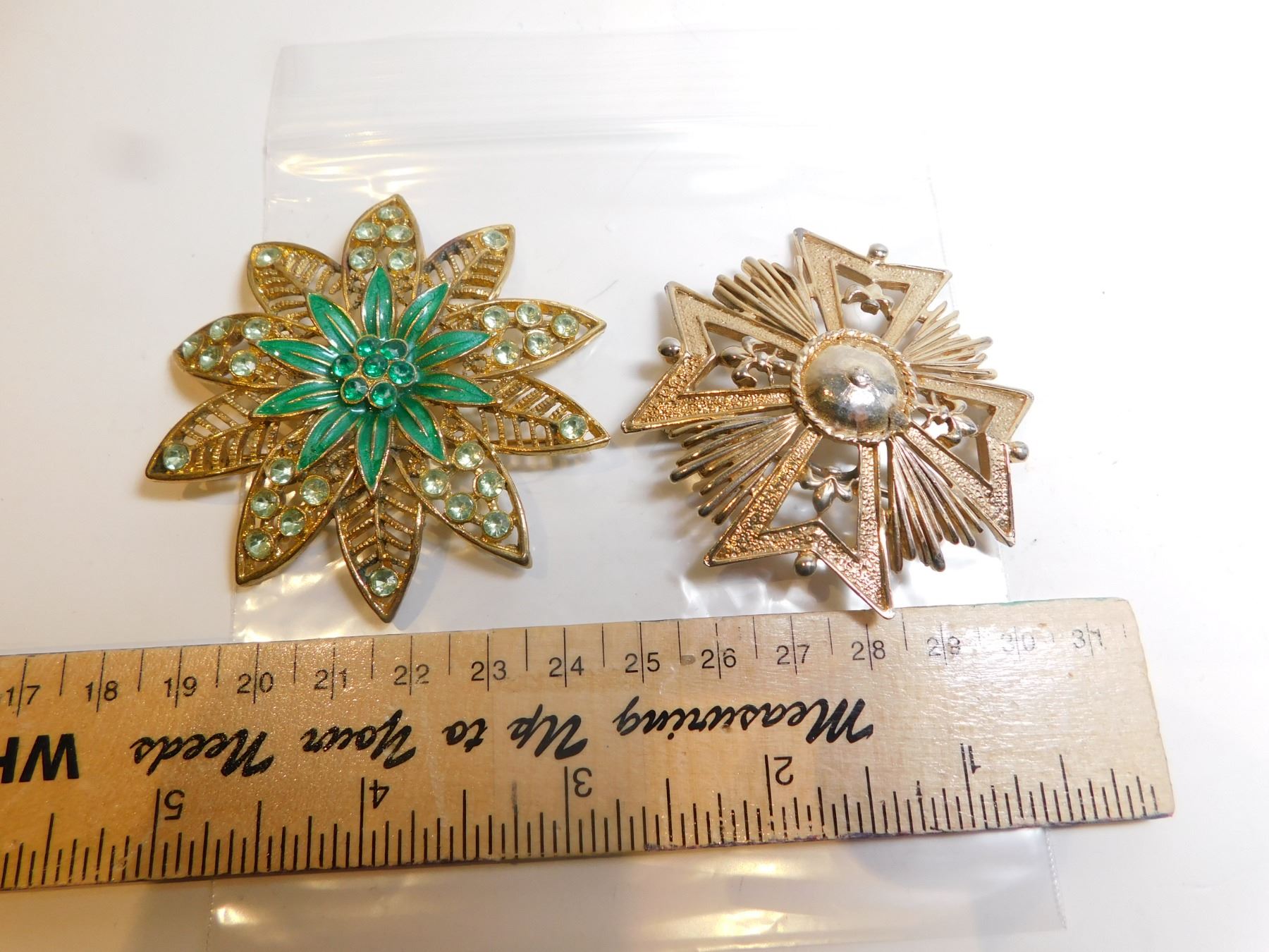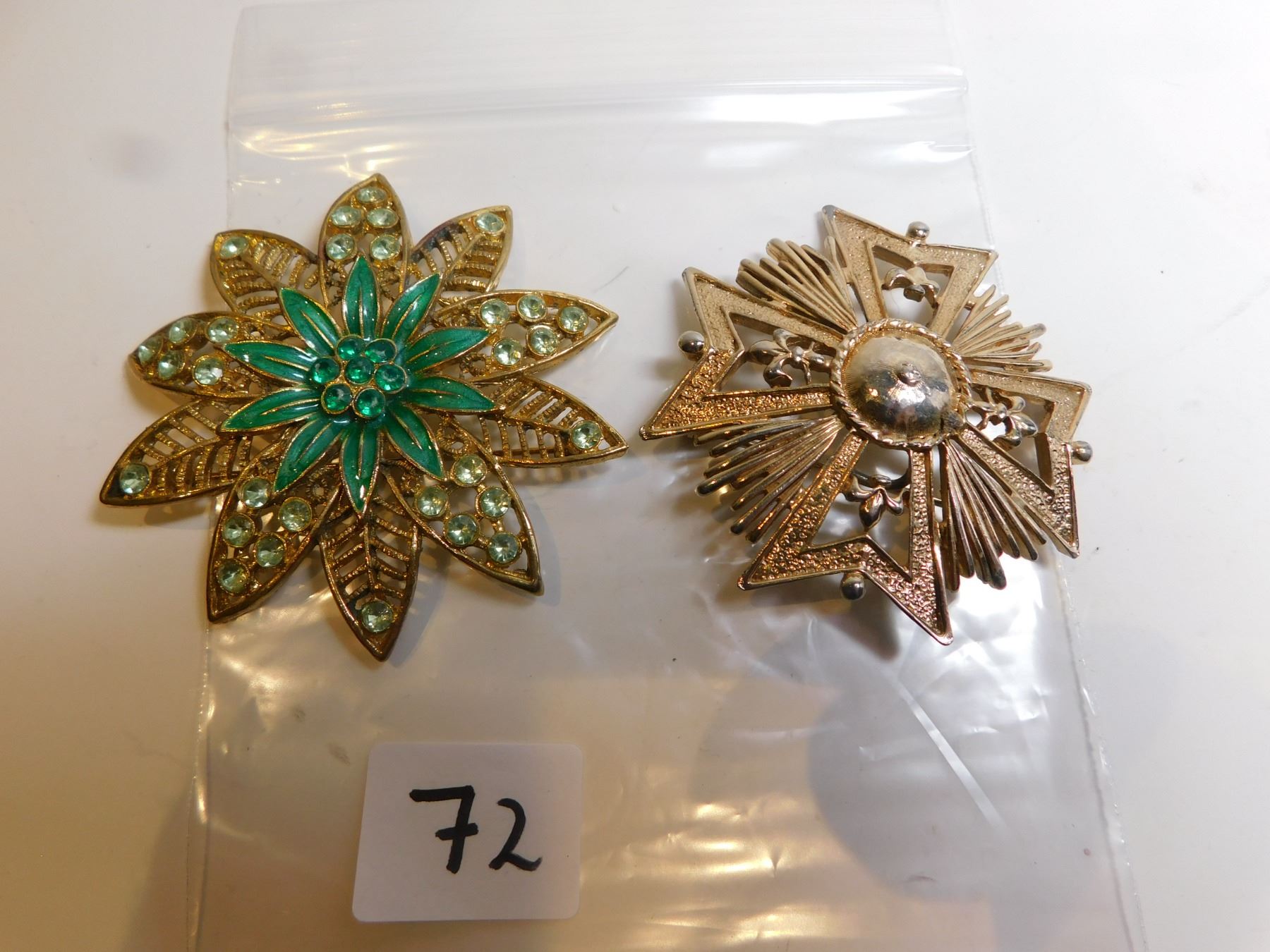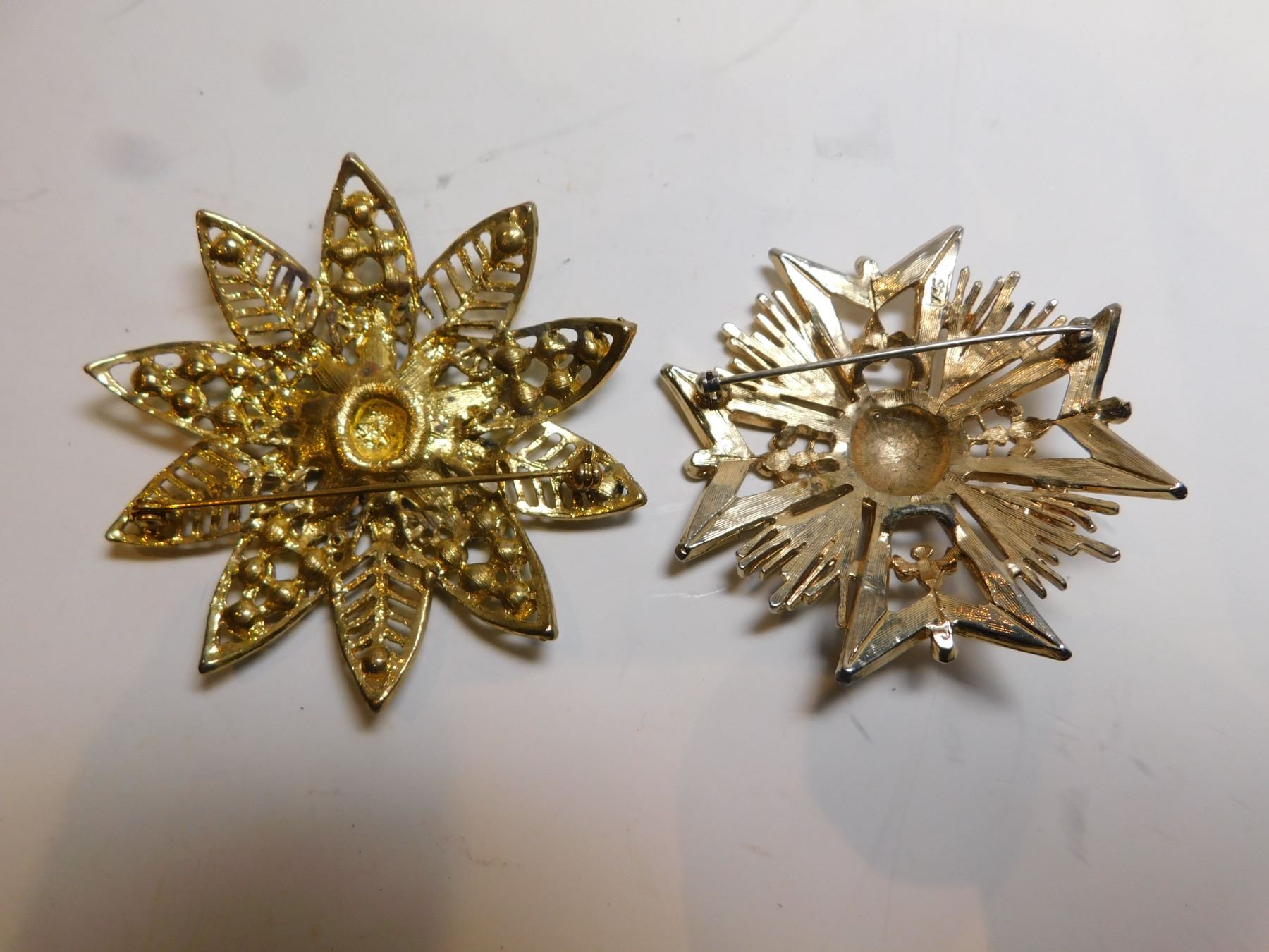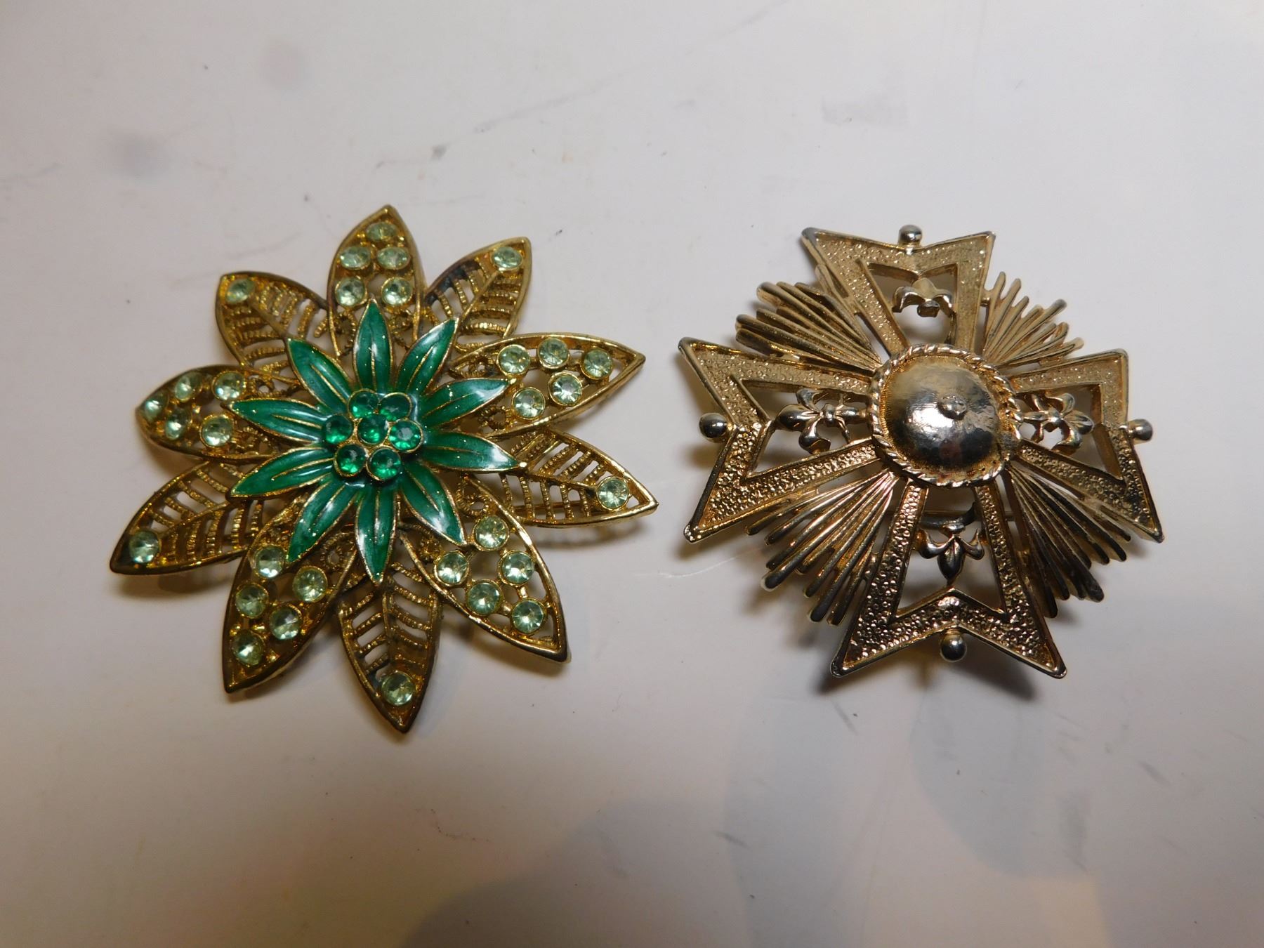 TWO GOLD TONE BROACHES, FLOWER, AND MALTESE CROSS
