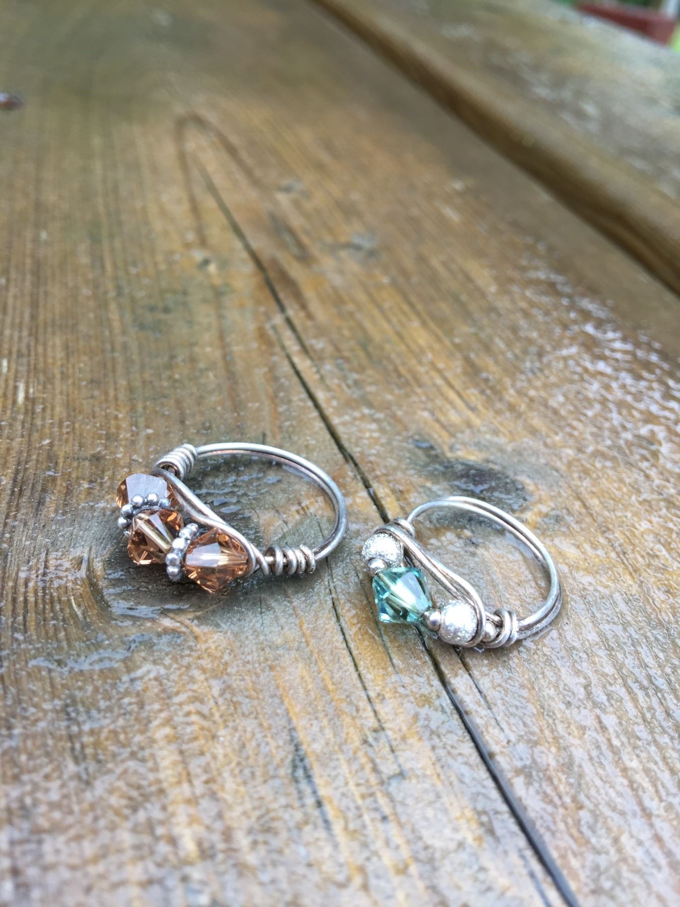 TWO STERLING SILVER RINGS/AMBER SWARVARSKI CRYSTALS/GREEN SWARVARSKI CRYSTALS / HAND CRAFTED IN SASK