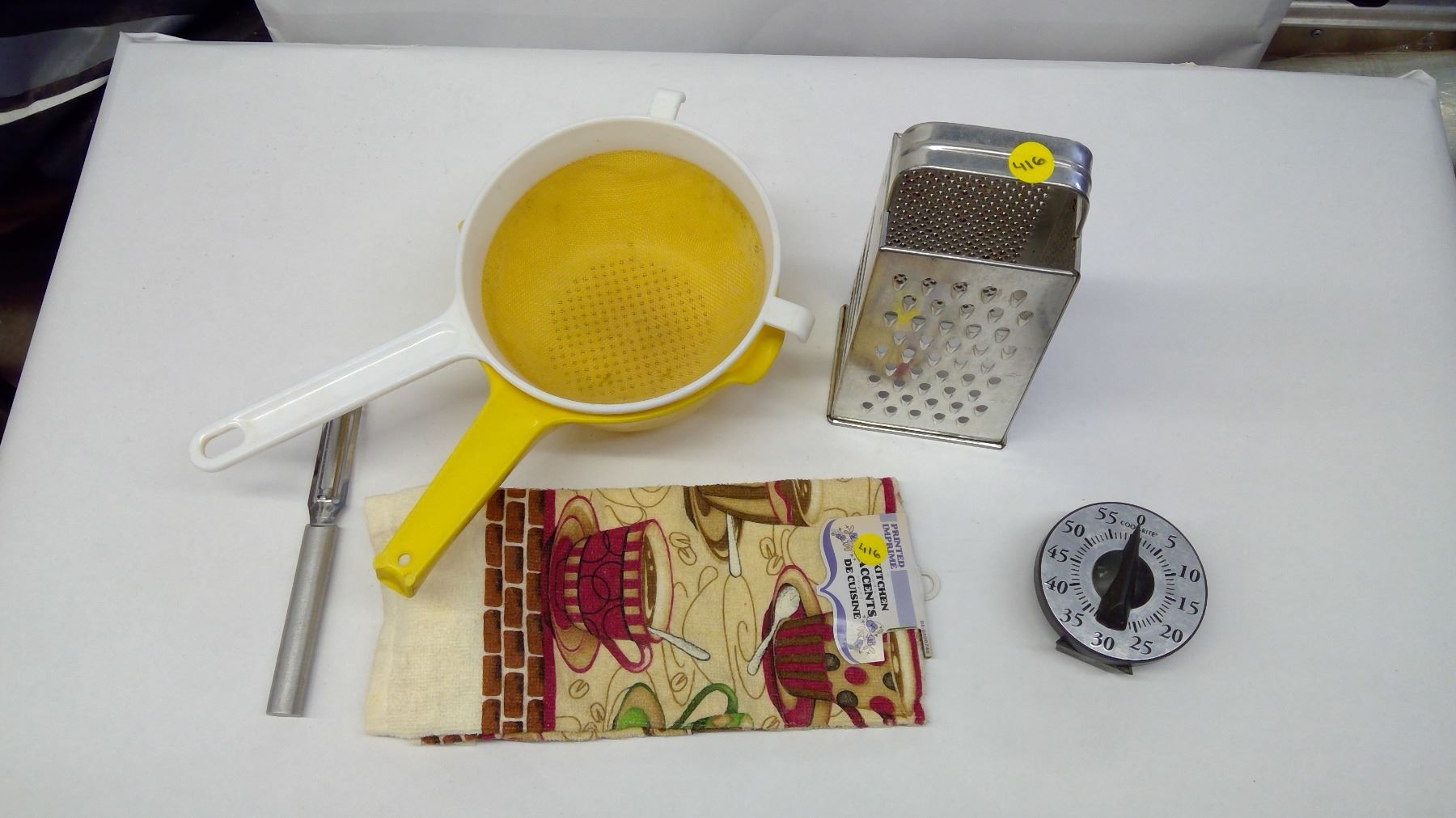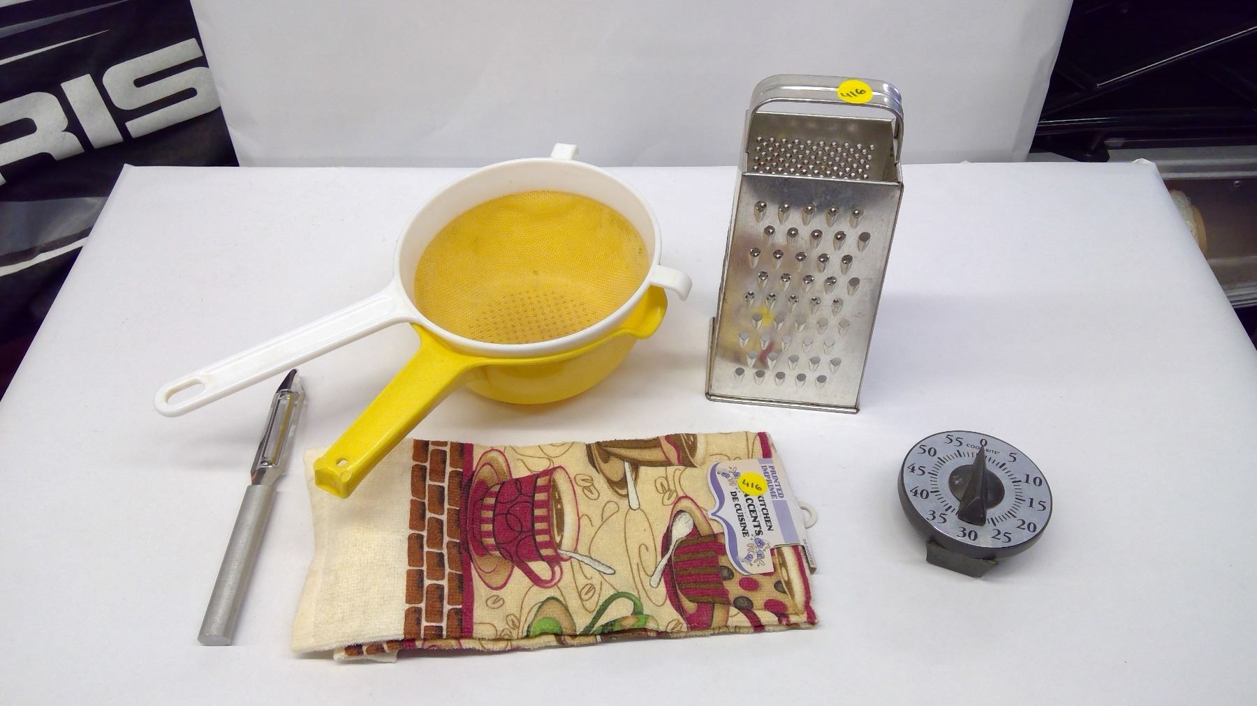 TWO STRAINERS, GRATER, TIMER AND OVEN TOWEL