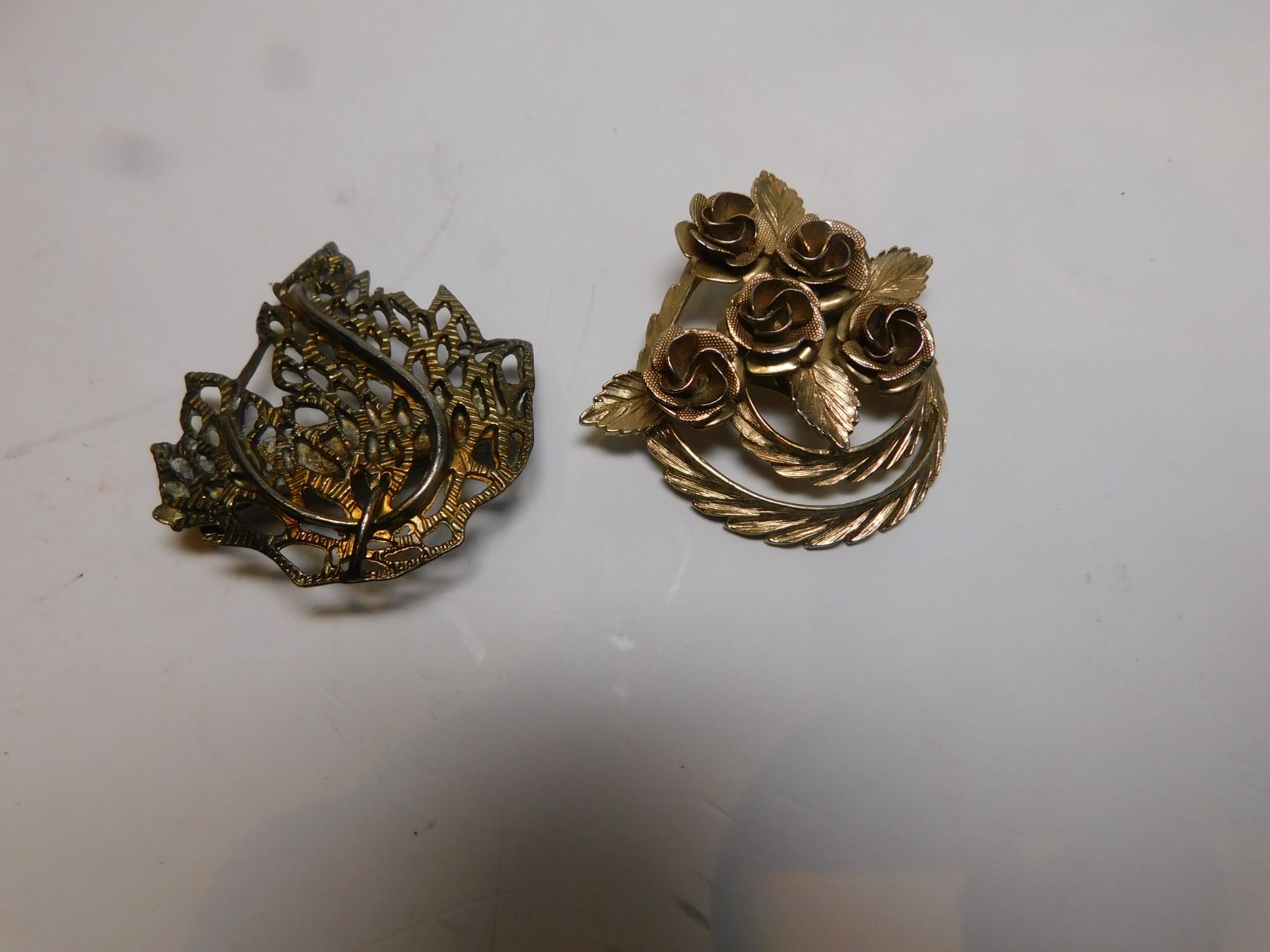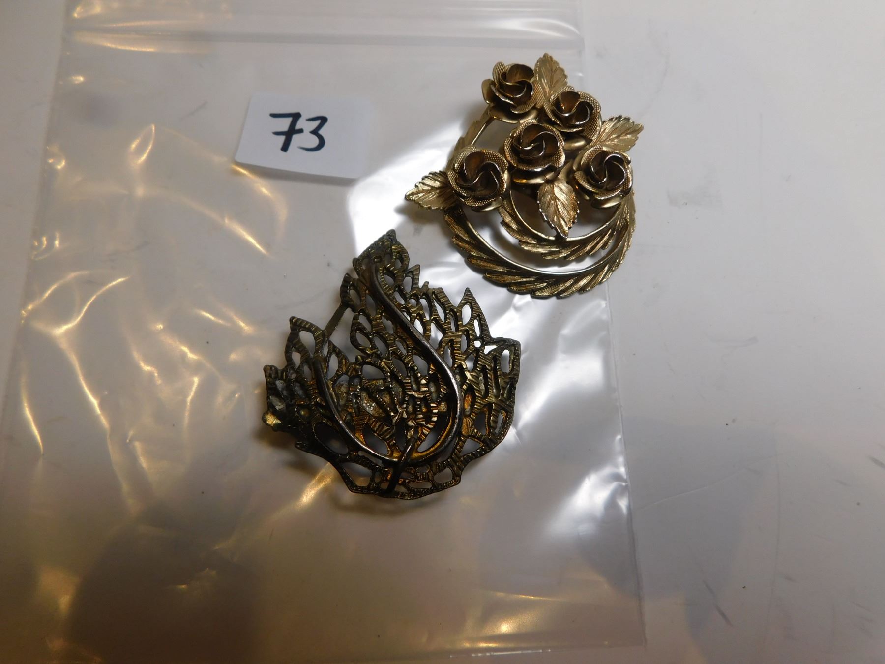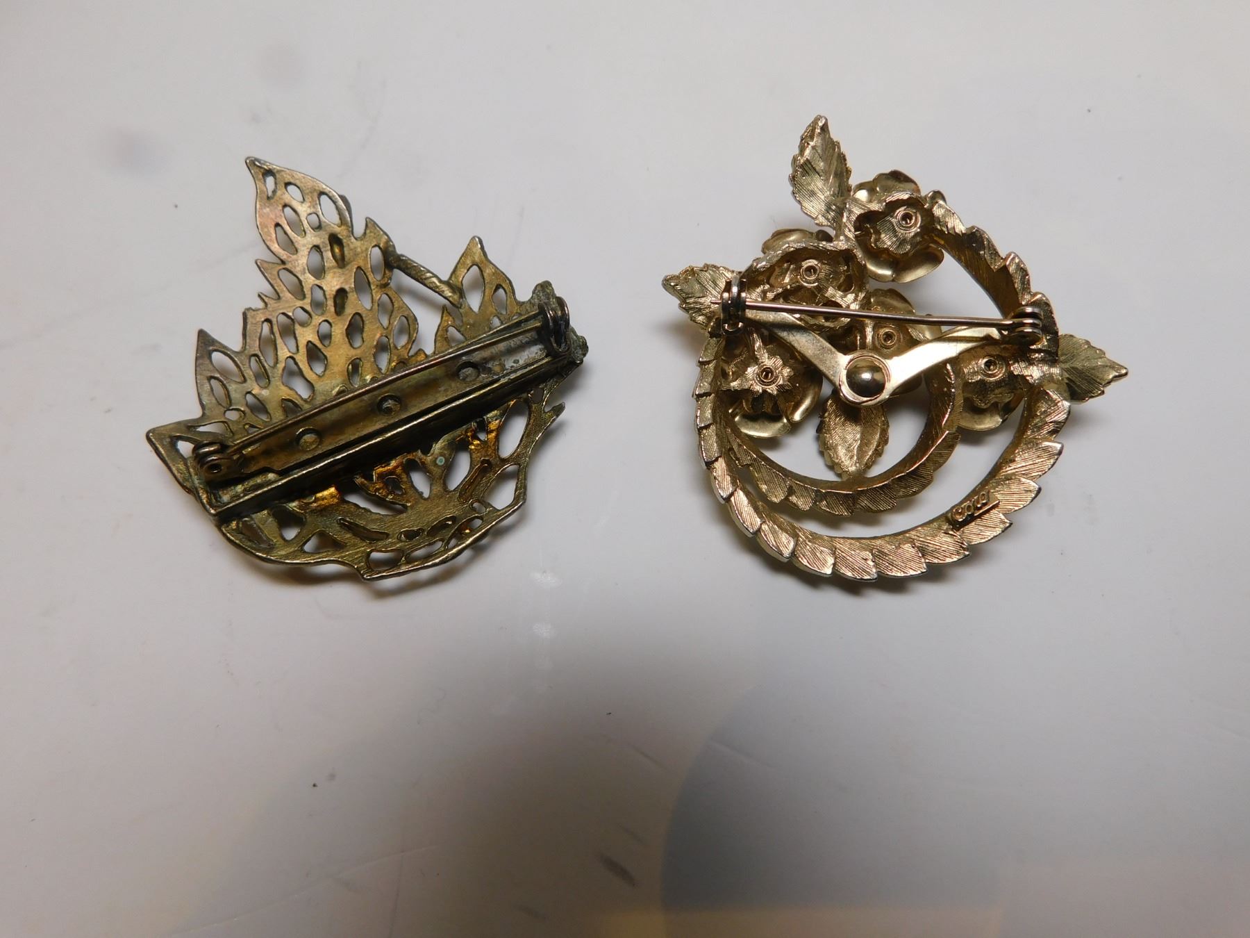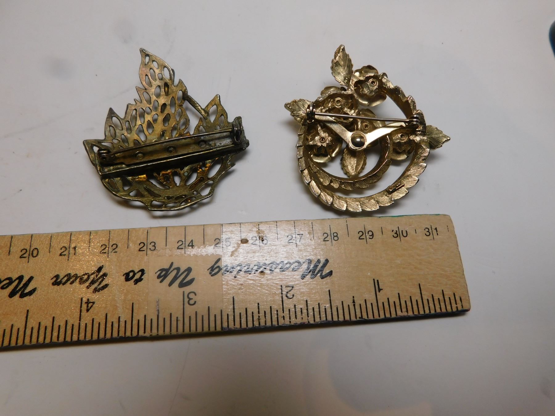 TWO VINTAGE GOLD TONE BROACHES, LEAF AND FLOWER