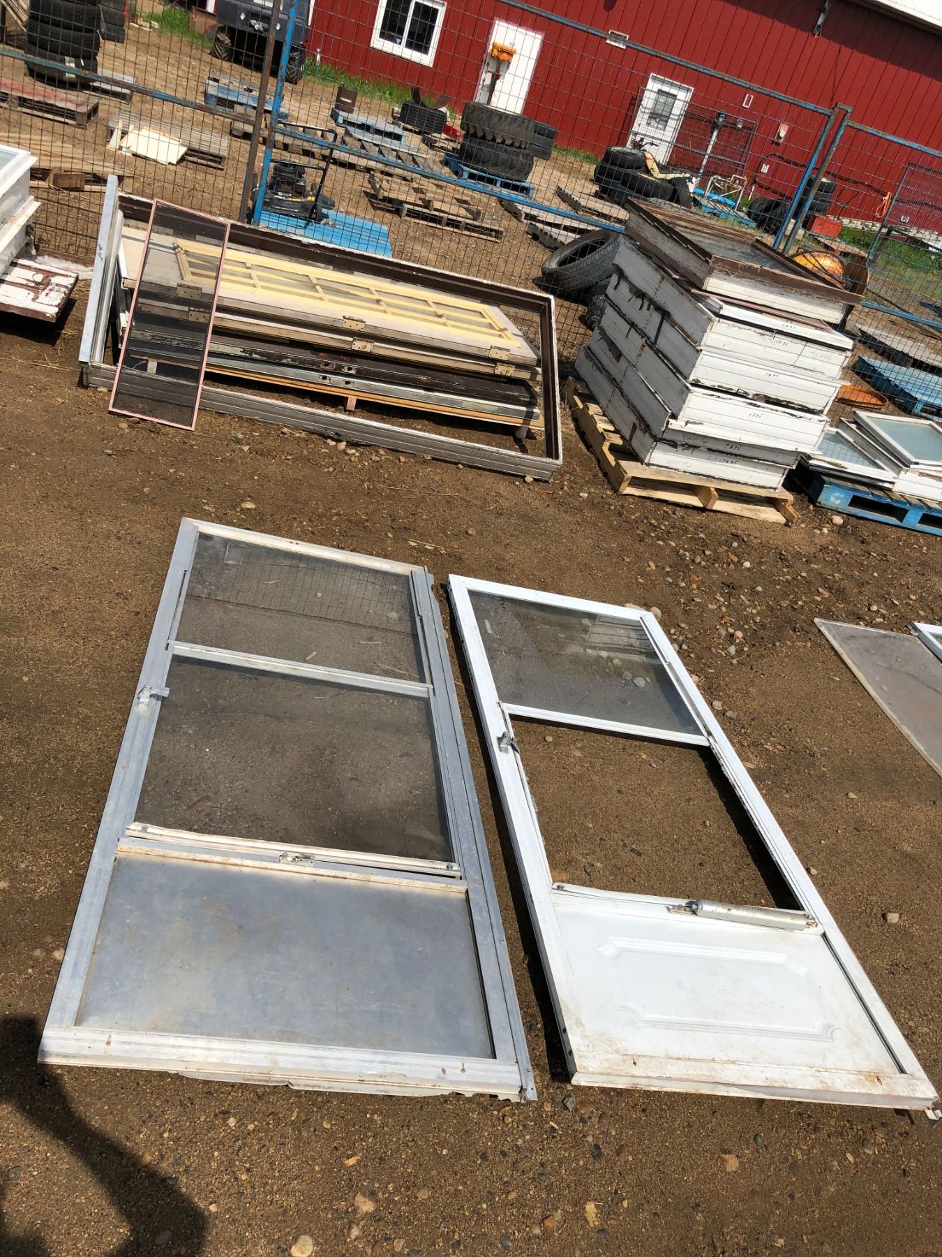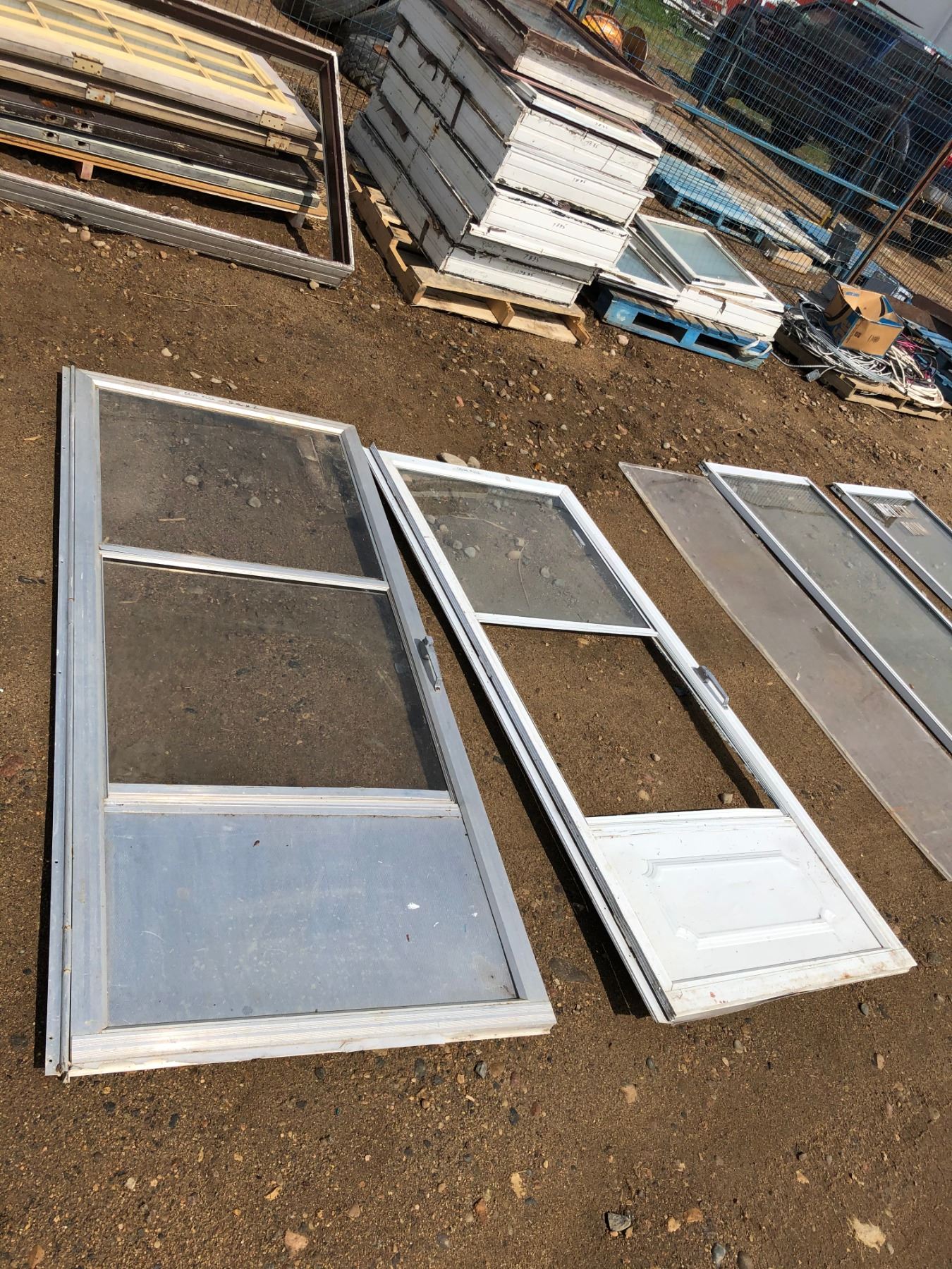 TWO WHITE BANGED UP DOOR SCREENS 7FT LENGTH APROX 6FT WIDTH