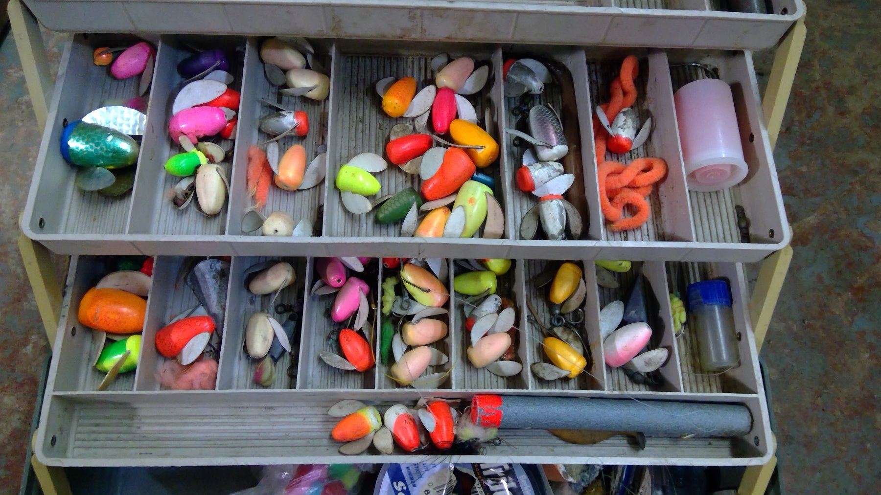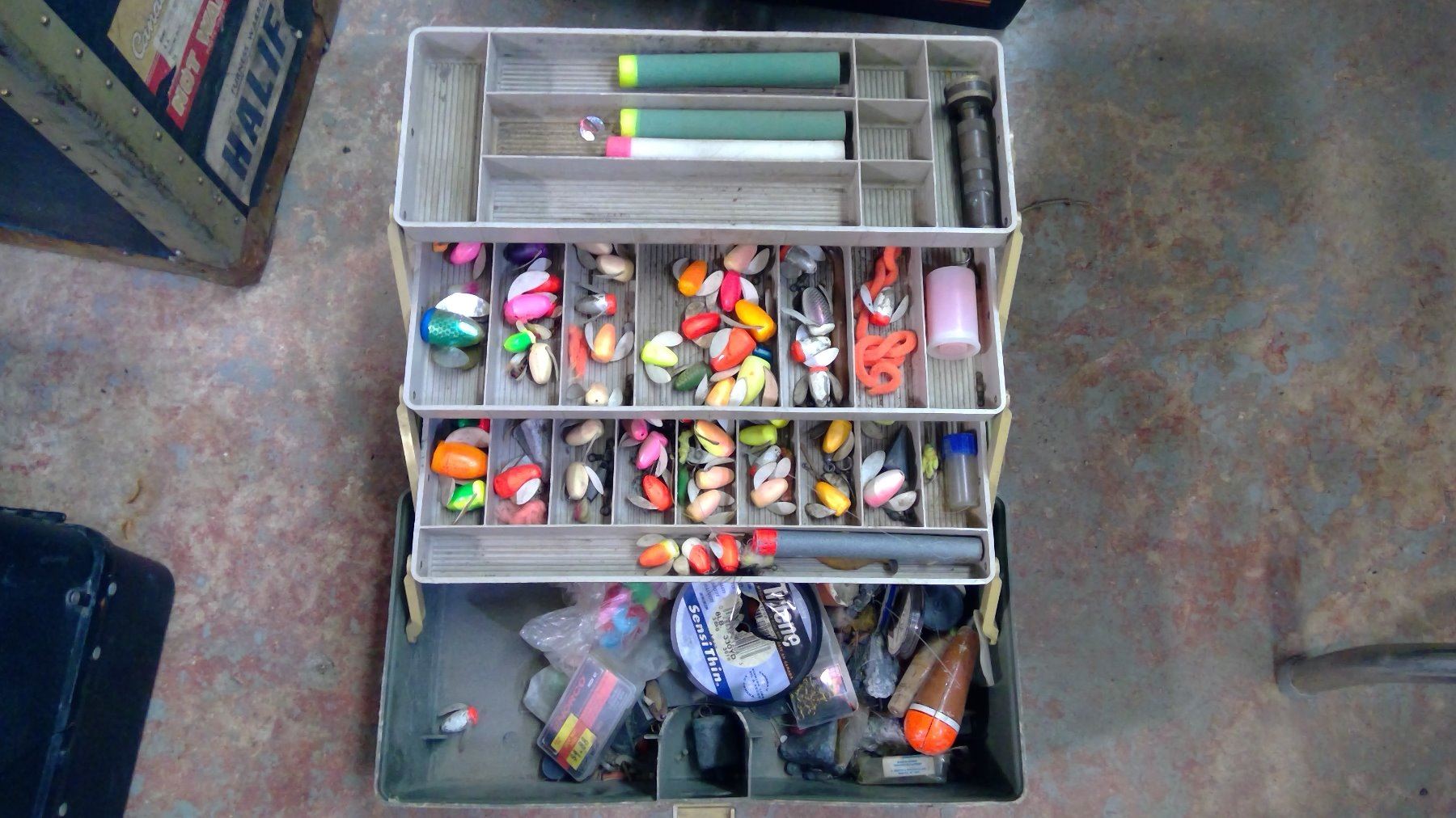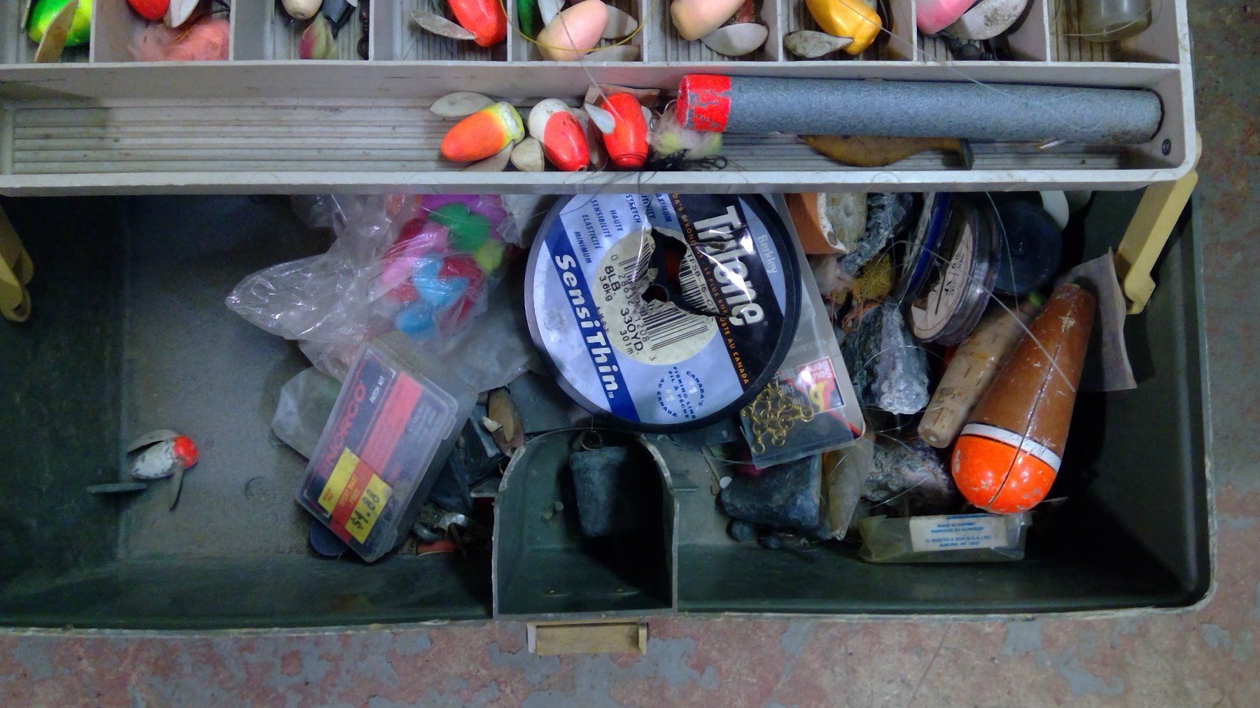 Tackle Box w/ Assorted Hooks & Line (Broken Latch)