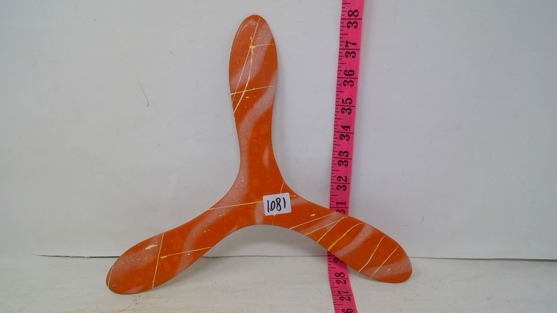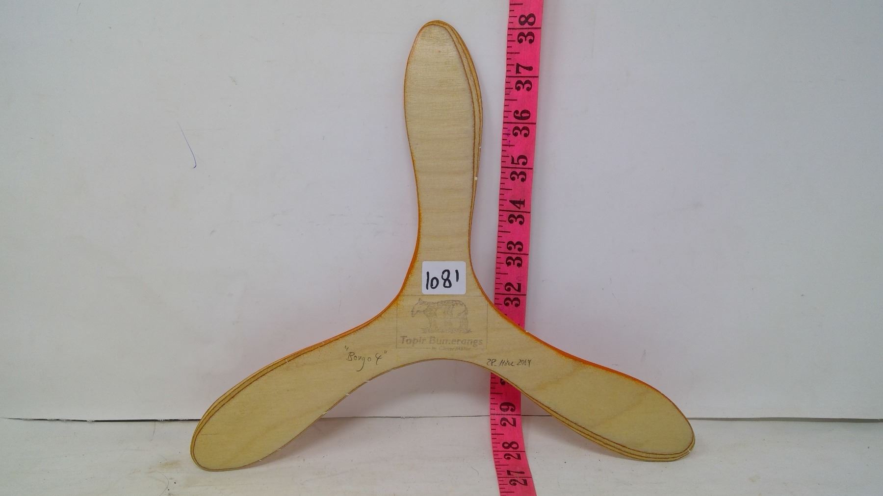 For a right-handed person. 'Tapir' boomerang made in 2004 in Germany by Gunter Moller. Range: 25m. Suitable for a youth. Three blades tighten. Turn radius compared to a 2-blade boomerang and the flight is shorter and faster. Easy to catch one-handed or two-handed (like it is a pancake). Width: 11 1/2". Material: Birch laminate. Thin and fast. Great fun! Returns: yes.
