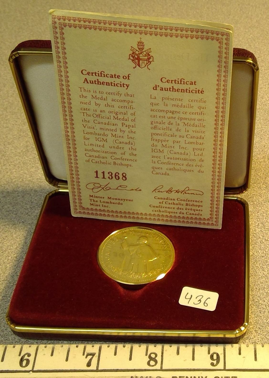 The 1984 Official Medal of the Canadian Papal Visit by Pope John Paul II. Gold Plated. Medal has been triple struck. Housed in its original case of issue.