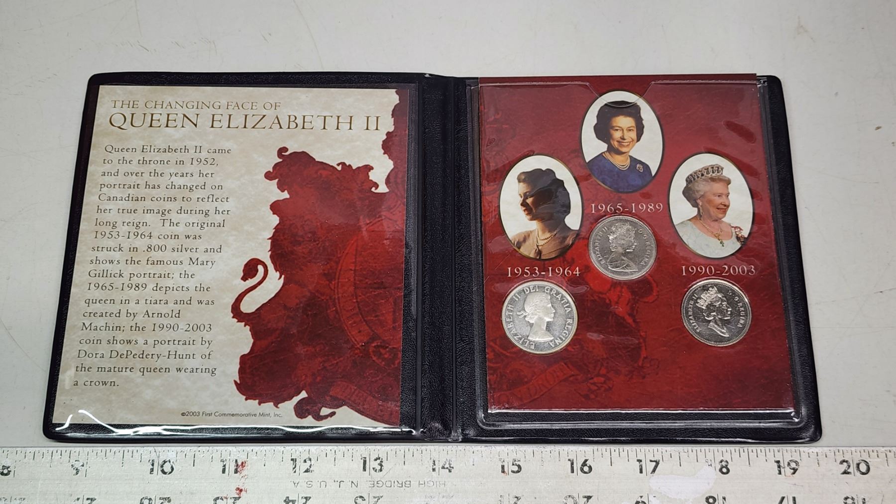 The Changing Face of Queen Elizabeth II 50 Cents. 3 different Canadian 50 Cents made of Silver or Nickel, each with different portraits. Housed in a First Commemorative Mint folder.