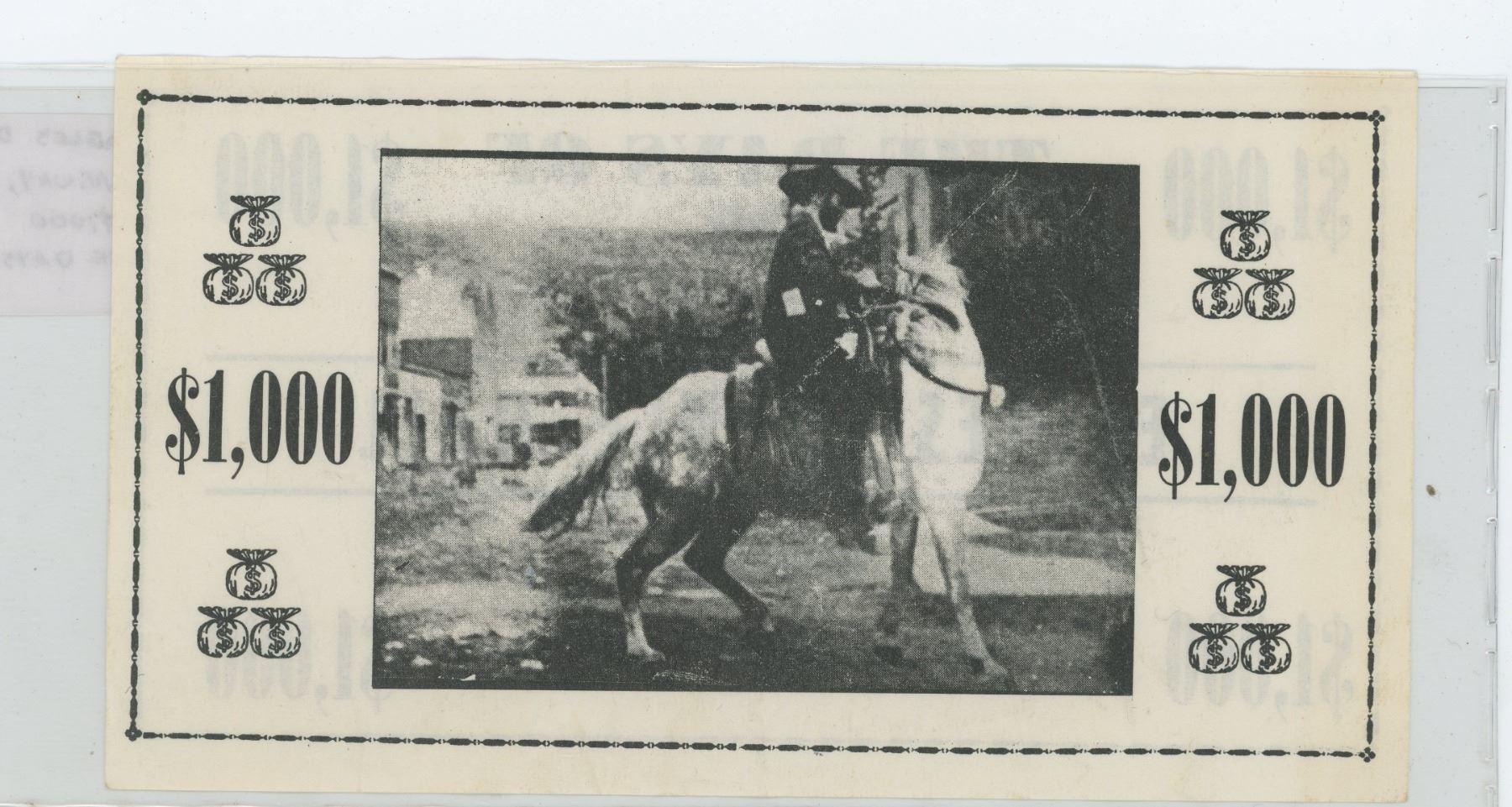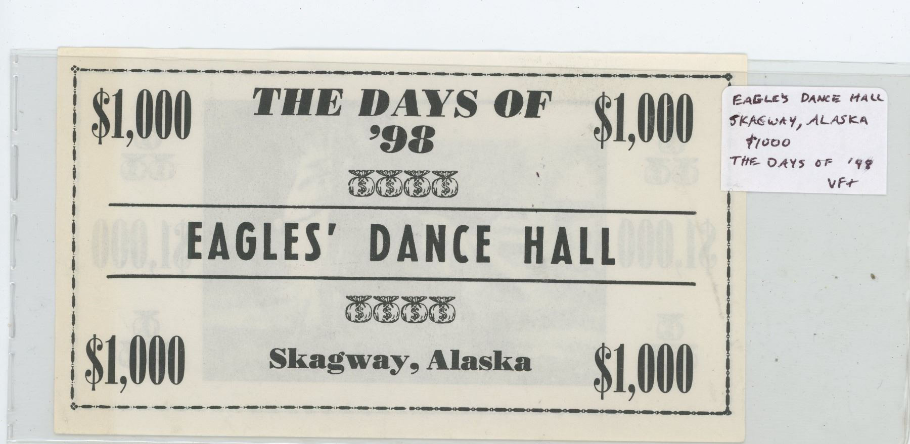 The Days of ’98 Eagles’ Dance Hall, Skagway, Alaska $1000 Scrip. Scarce. VF+.