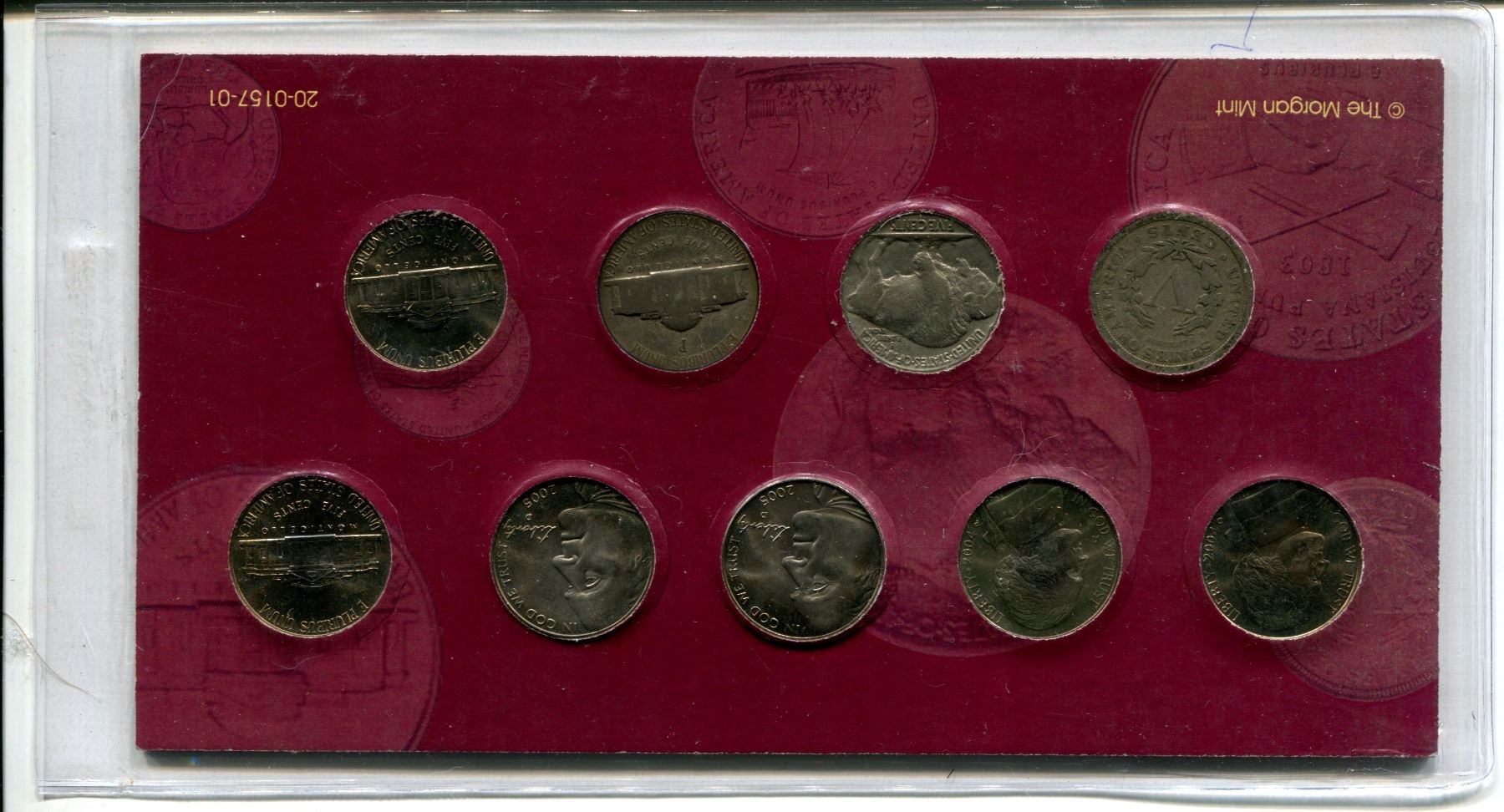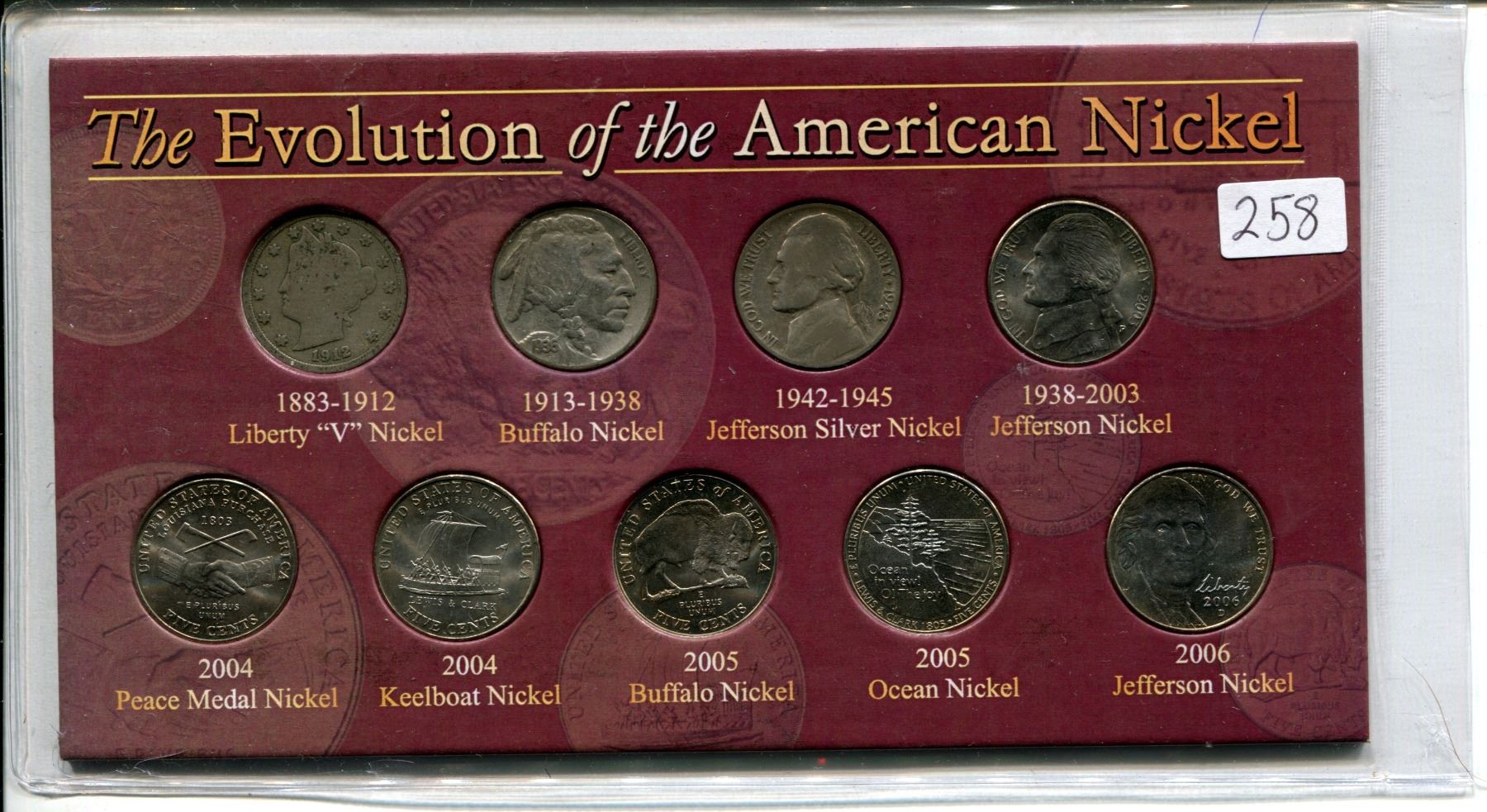 The Evolution of the American Nickel. 9-coin set includes Liberty Head, Buffalo, Jefferson Silver, Jefferson, 2004 Peace Medal, 2004 Keelboat, 2005 Buffalo, 2005 Ocean & 2006 Jefferson. Housed in a Morgan Mint holder.