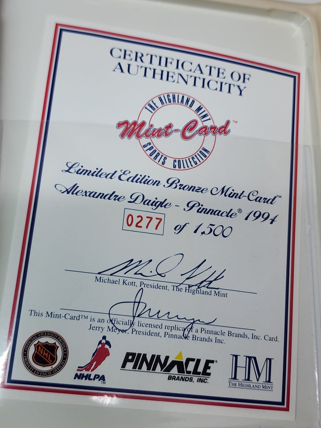 The Highland mint - Limited edition bronze mint card - Alexander Daigle, Pinnacle 1994 - 277/1500